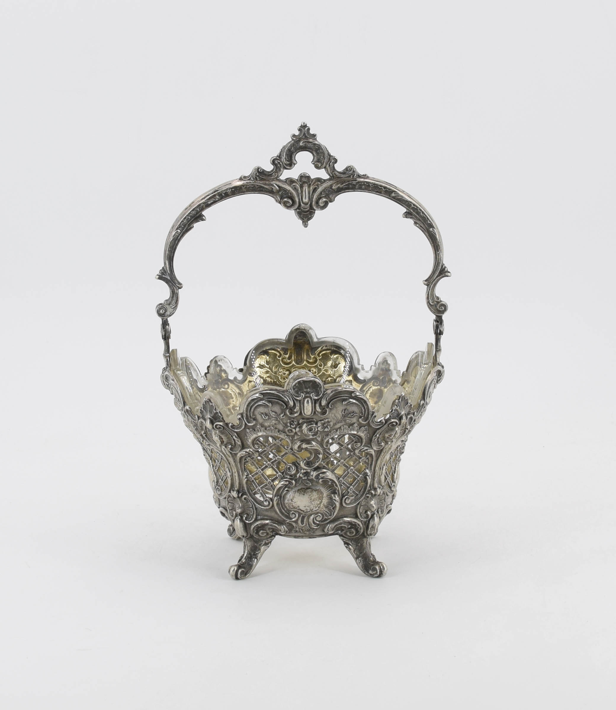 srebro próby 800 cechowane (półksiężyc, korona, 800 i znak warsztatowy - bite w głąb), szkło; wys. 11,8 cm, szer. 13,5 cm, głęb. 13,5 cm; waga 178 g.