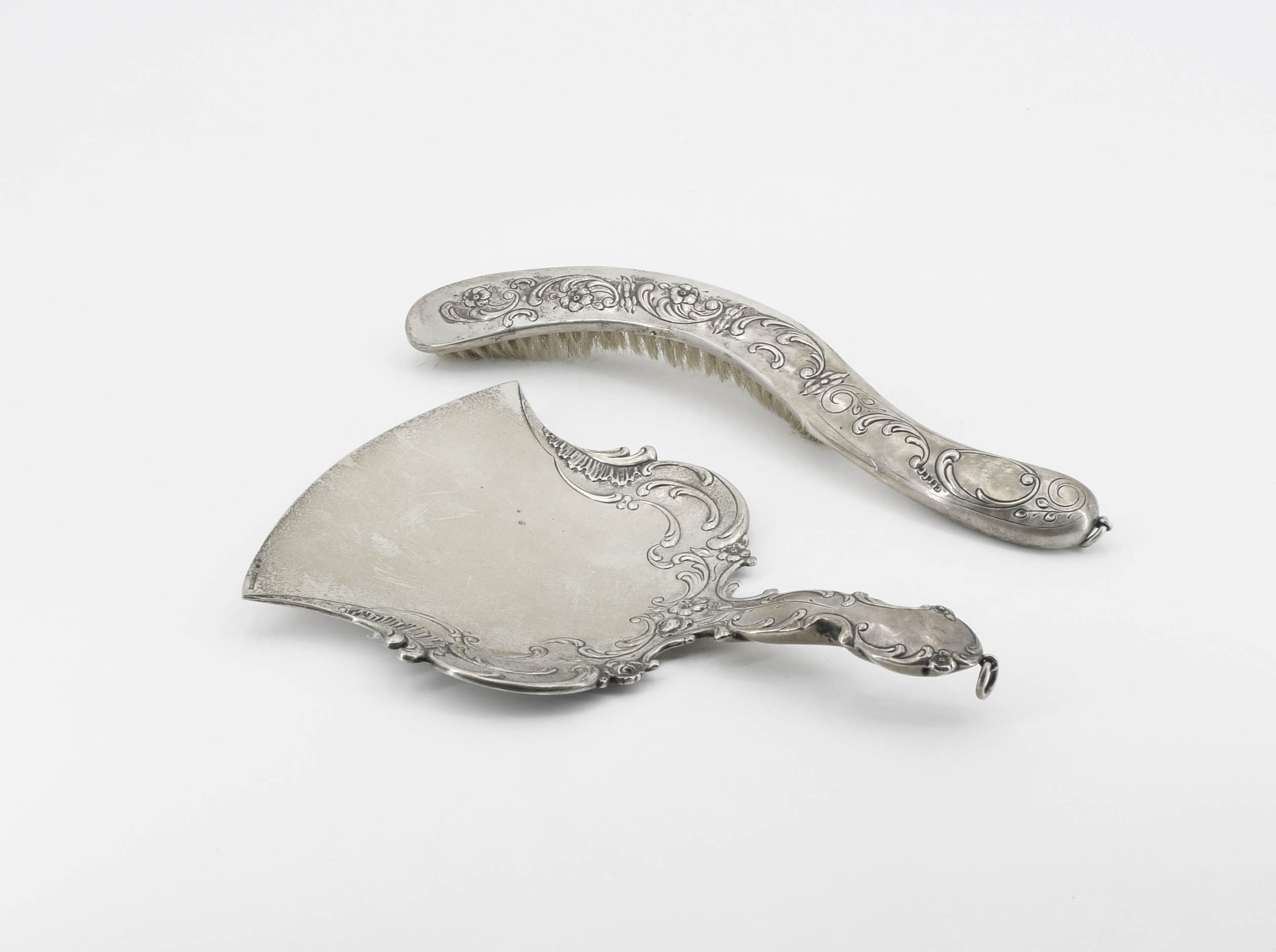 srebro próby 3 cechowane (cecha probierni państwowej z próbą 3, głową kobiety w chuście, literą W - w owalu, nazwisko złotnika WŁ.Z. ROGALSKI - w prostokącie); szufelka - dł. 23 cm, szer. 16 cm; zmiotka -...
