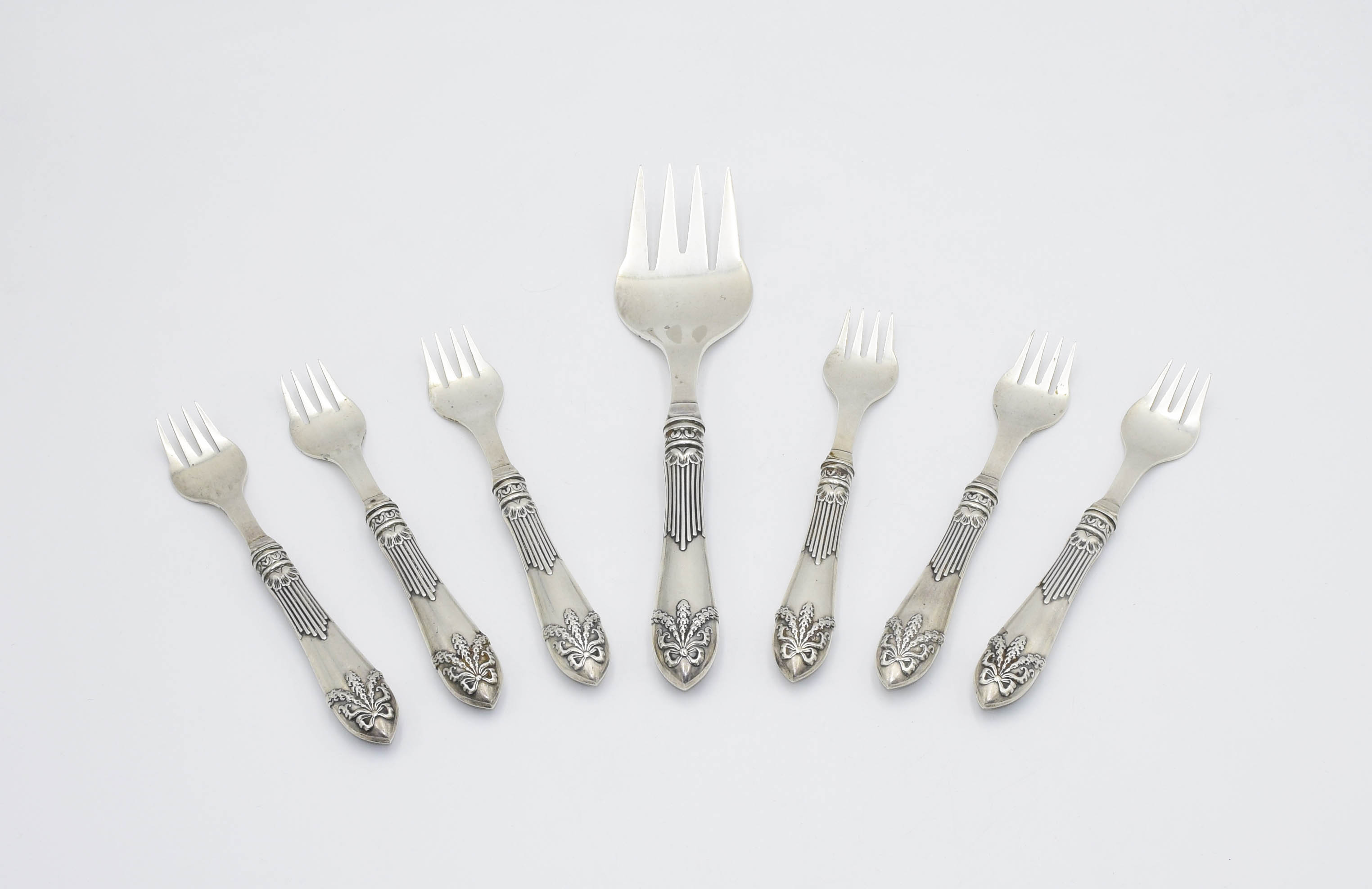 srebro próby 84 cechowane (SR84 - w owalu, monogram złotnika C.B. - w prostokącie); widelce - dł. 17,5 cm, widelec środka stołu - dł. 24,5 cm; waga 488 g.