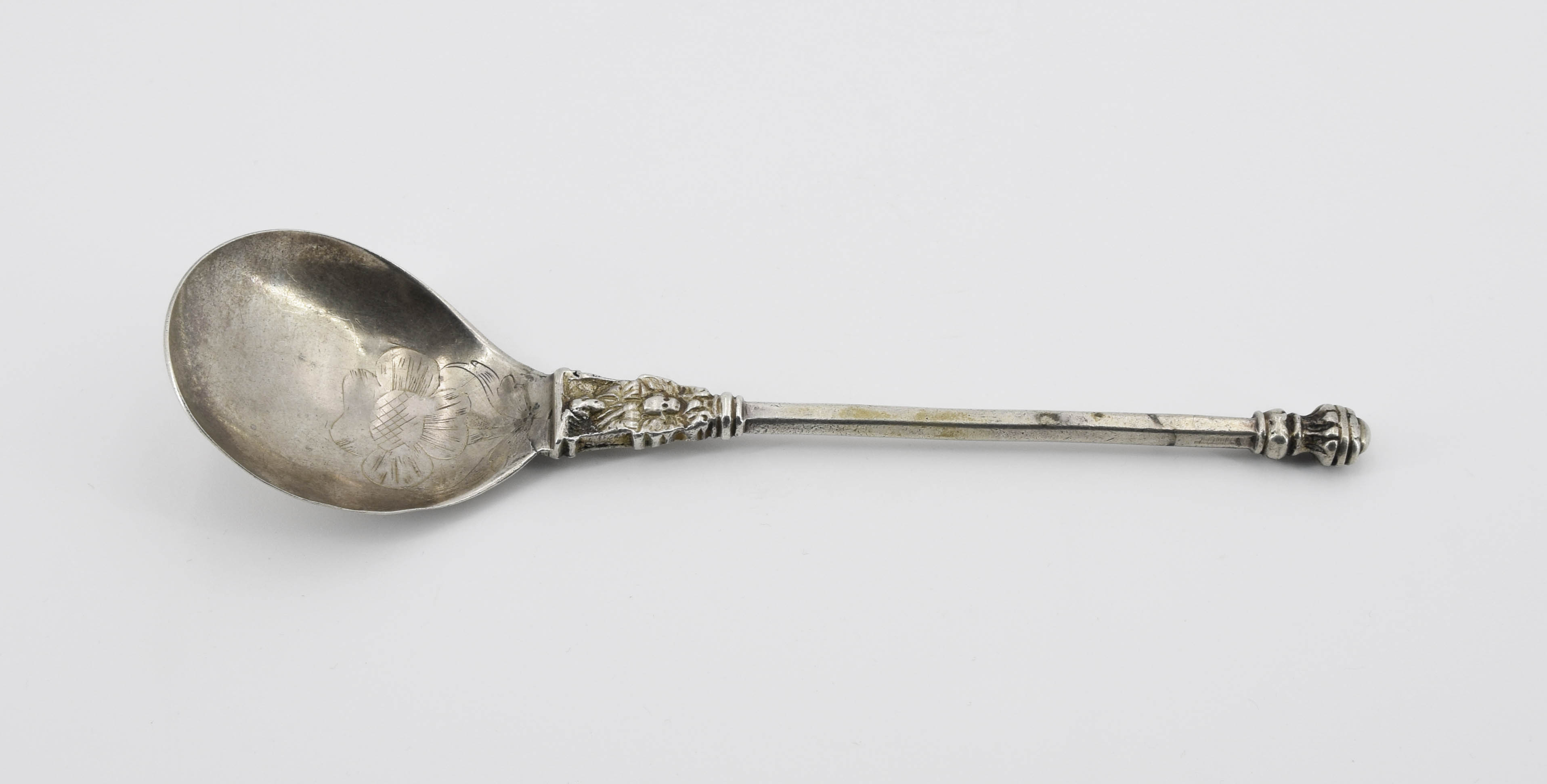 srebro cechowane (na czerpaku bita cecha Gdańska z lat 1689-1699 i monogram złotnika NS - w sercu?); dł. 20 cm, szer. czerpaka 5 cm; waga 74 g.
