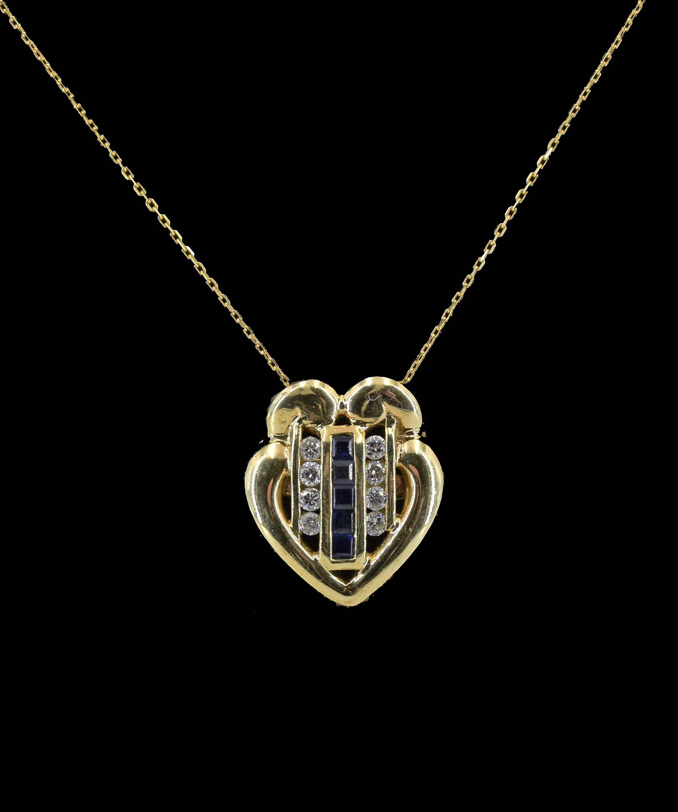 forma serca wysadzanego 5 szt. szafirów w szlifie carre o masie łącznej ok. 0.25 ct oraz 8 szt. brylantów o masie łącznej ok. 0.25 ct (VS-Si/H),