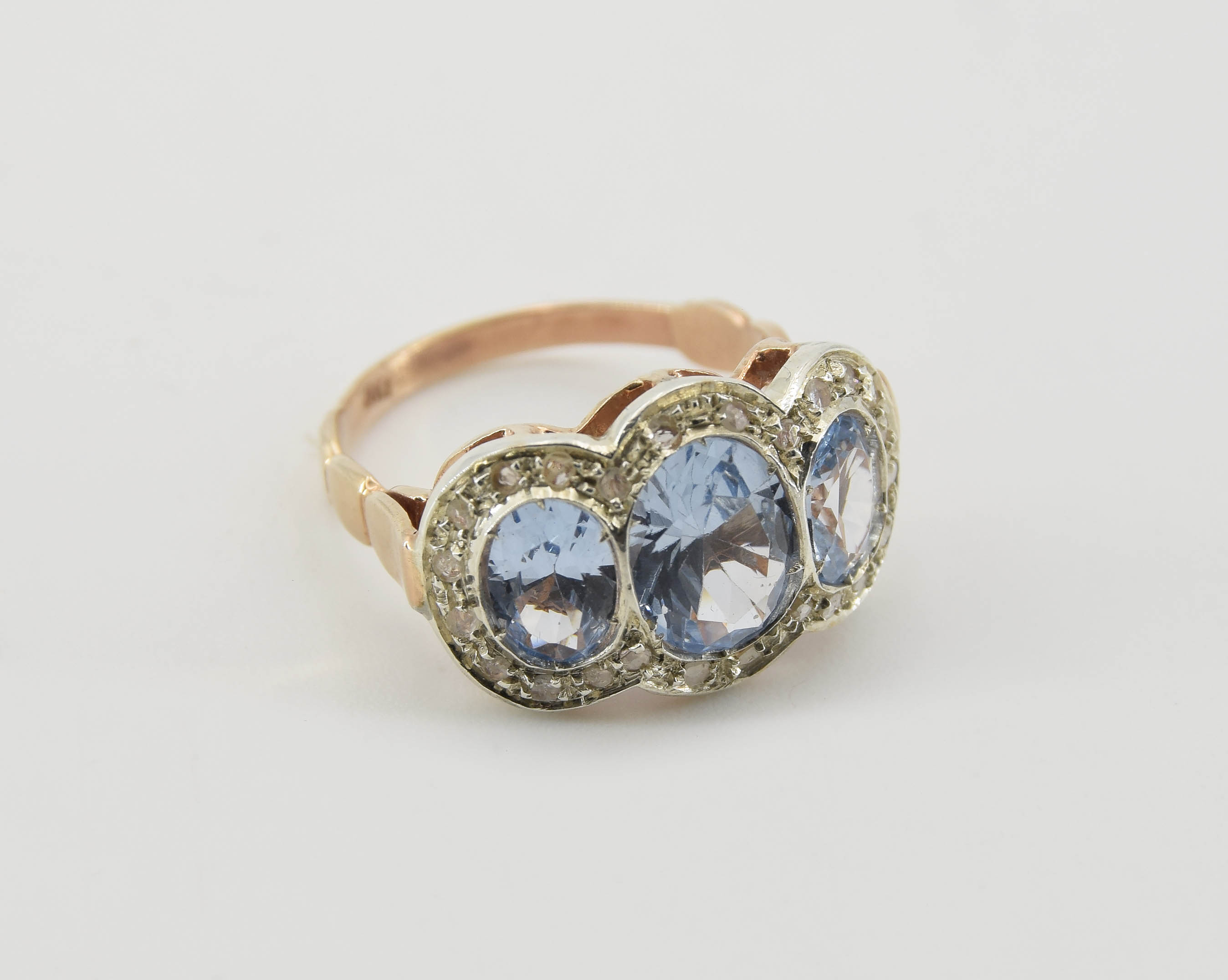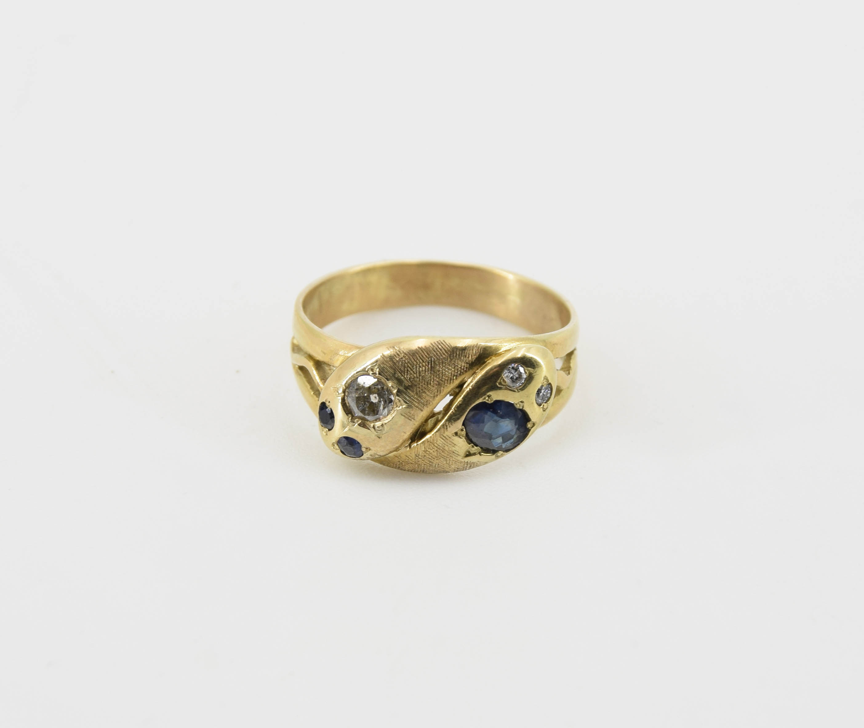kompozycja wysadzana 3 szt. szafirów (owalny i okrągłe) o masie łącznej ok. 0.75 ct oraz diamentem w szlifie przejściowym o masie ok. 0.15 ct (P1/I-K) i 2 szt. brylantów o masie łącznej ok. 0.04 ct (Si/G-I),