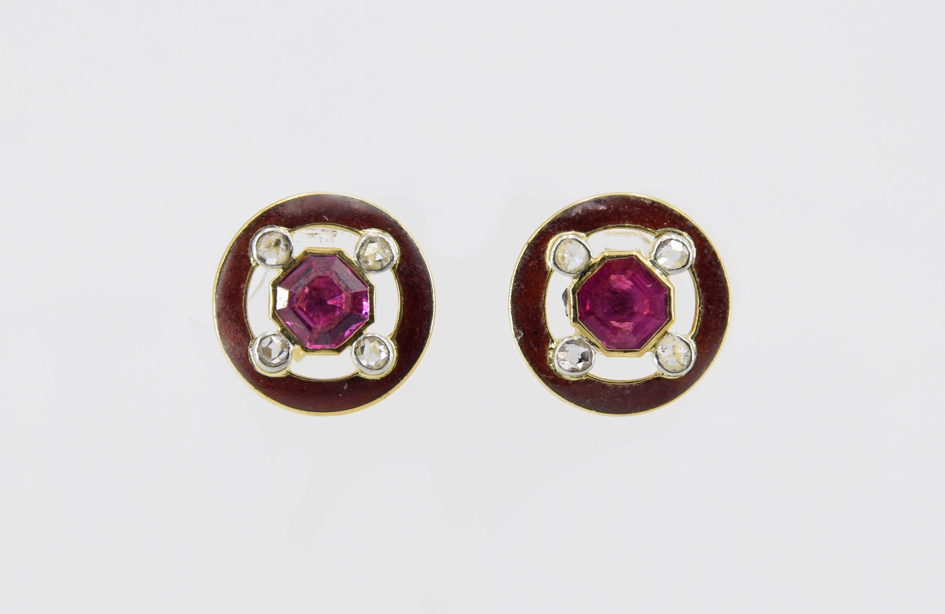 okrągłe, ażurowe kompozycje z 2 szt. rubinów o kształcie oktagonalnym o masie łącznej ok.1.20 ct oraz 8 szt. rautów diamentowych o masie łącznej ok. 0.20 ct (VS2-Si1/E-H),