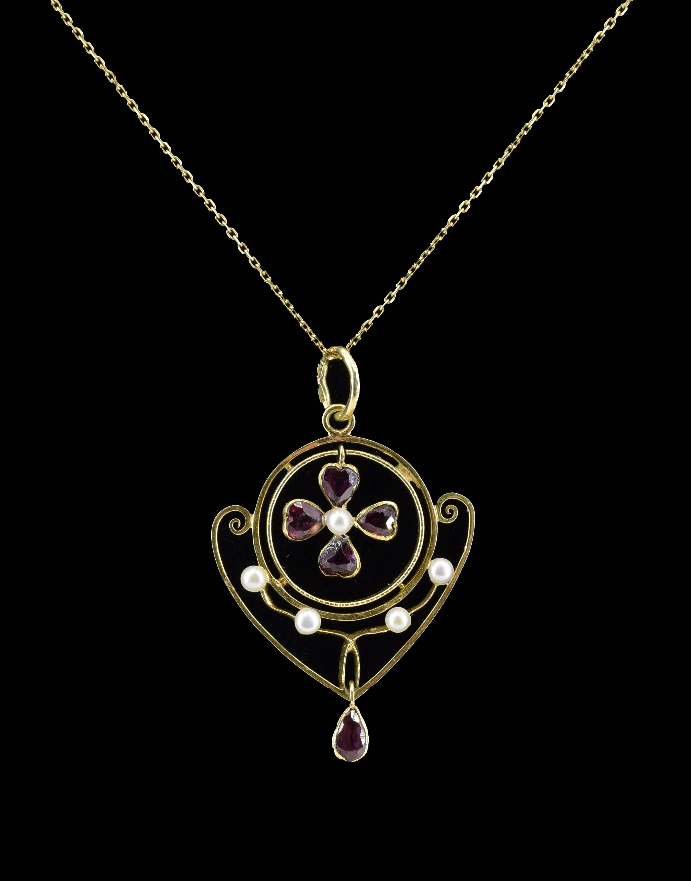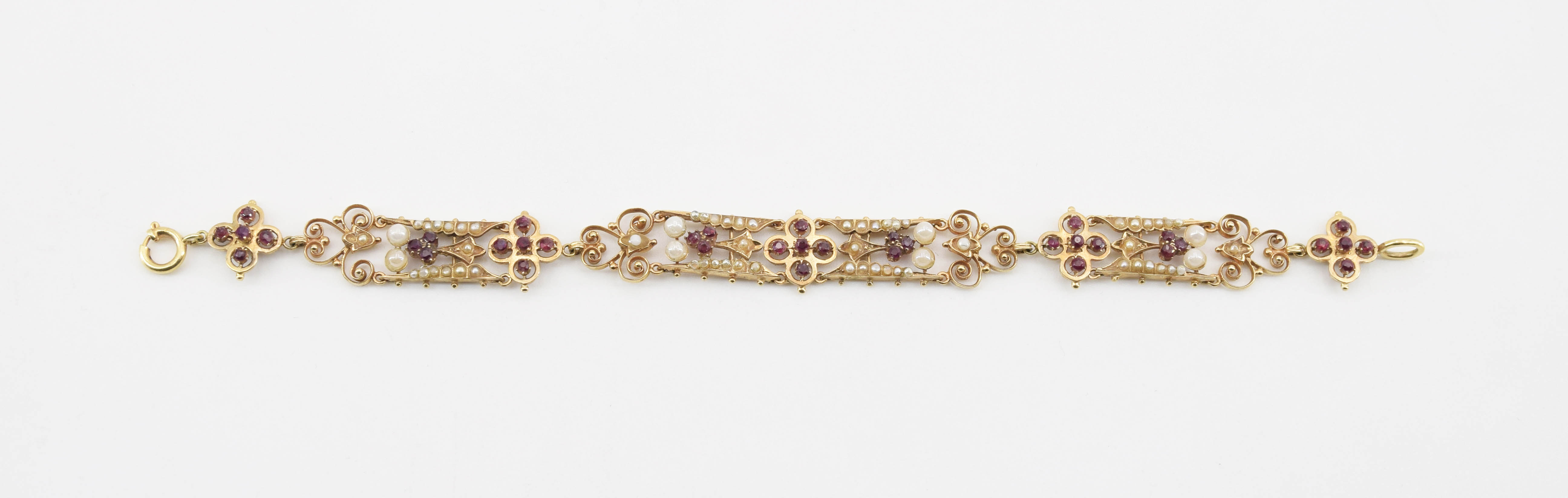 ażurowa kompozycja z motywami roślinnymi wysadzana 37 szt. okrągłych rubinów o masie łącznej ok. 1,50 ct oraz 64 szt. pereł o śr.1.10-3.30 mm,