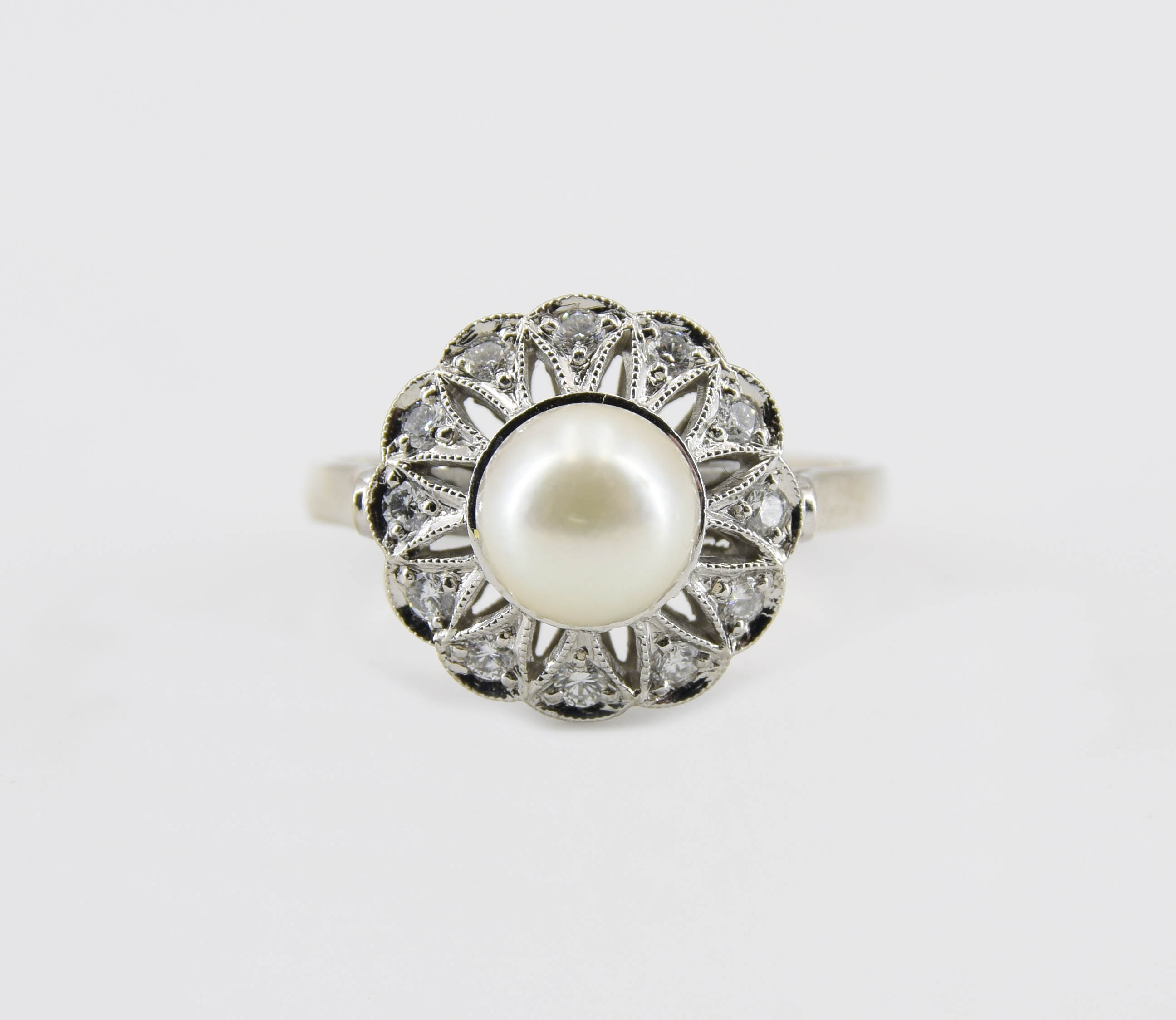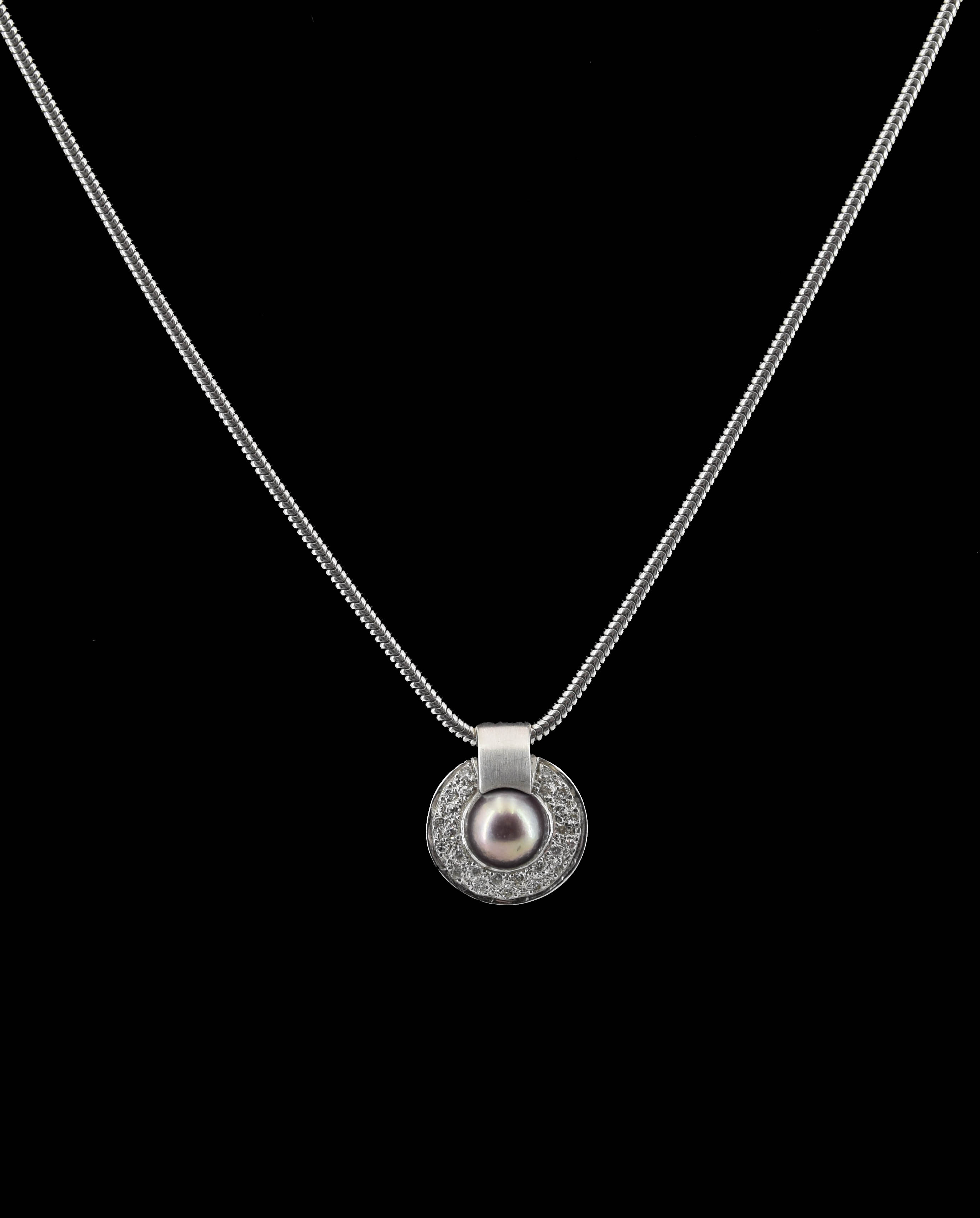 kompozycja z szarą perłą o śr. 7.65 mm w otoczeniu 25 szt. brylantów o masie łącznej ok. 0.25 ct (Si-P1/G-J),
