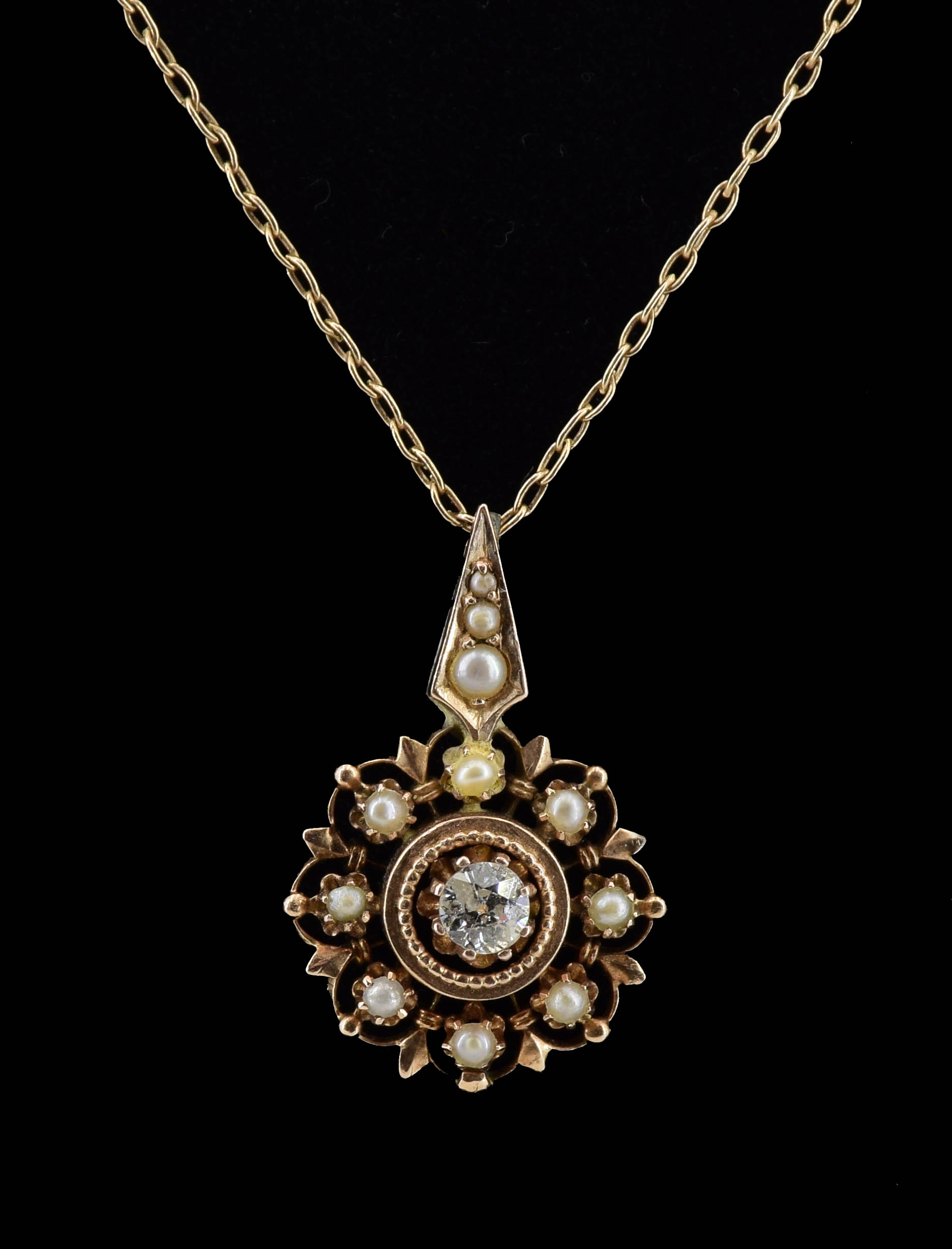 forma kwiatu wysadzanego diamentem w starym szlifie brylantowym o masie ok. 0.25 ct (Si2/I) oraz 11 szt. półpereł o śr. 1.50 - 2.50 mm,