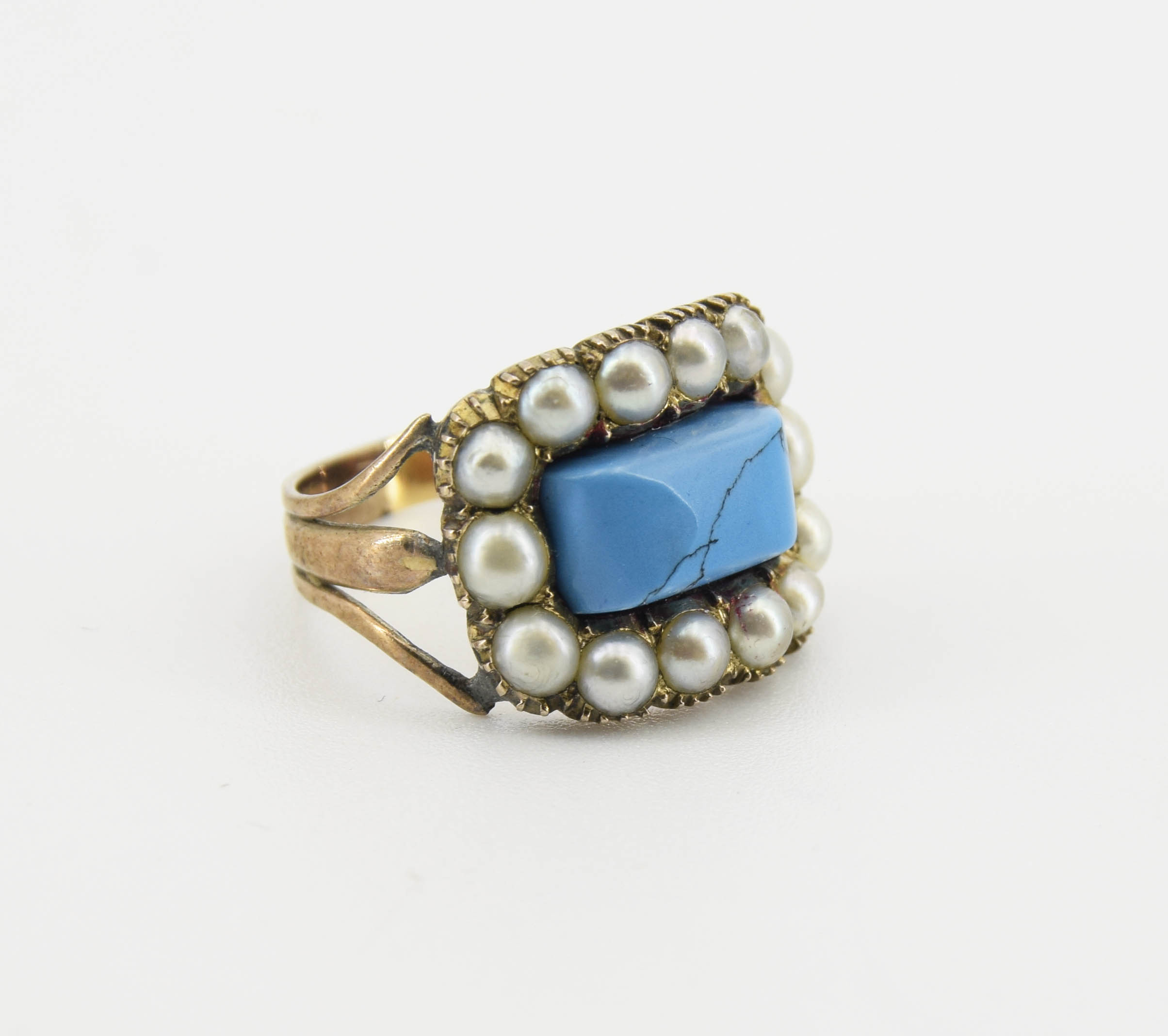 prostokątny turkus w szlifie kaboszon o wym. 6.00 x 11.50 mm w otoczeniu 14 szt. półpereł słodkowodnych o śr. 4.60 - 4.80 mm,