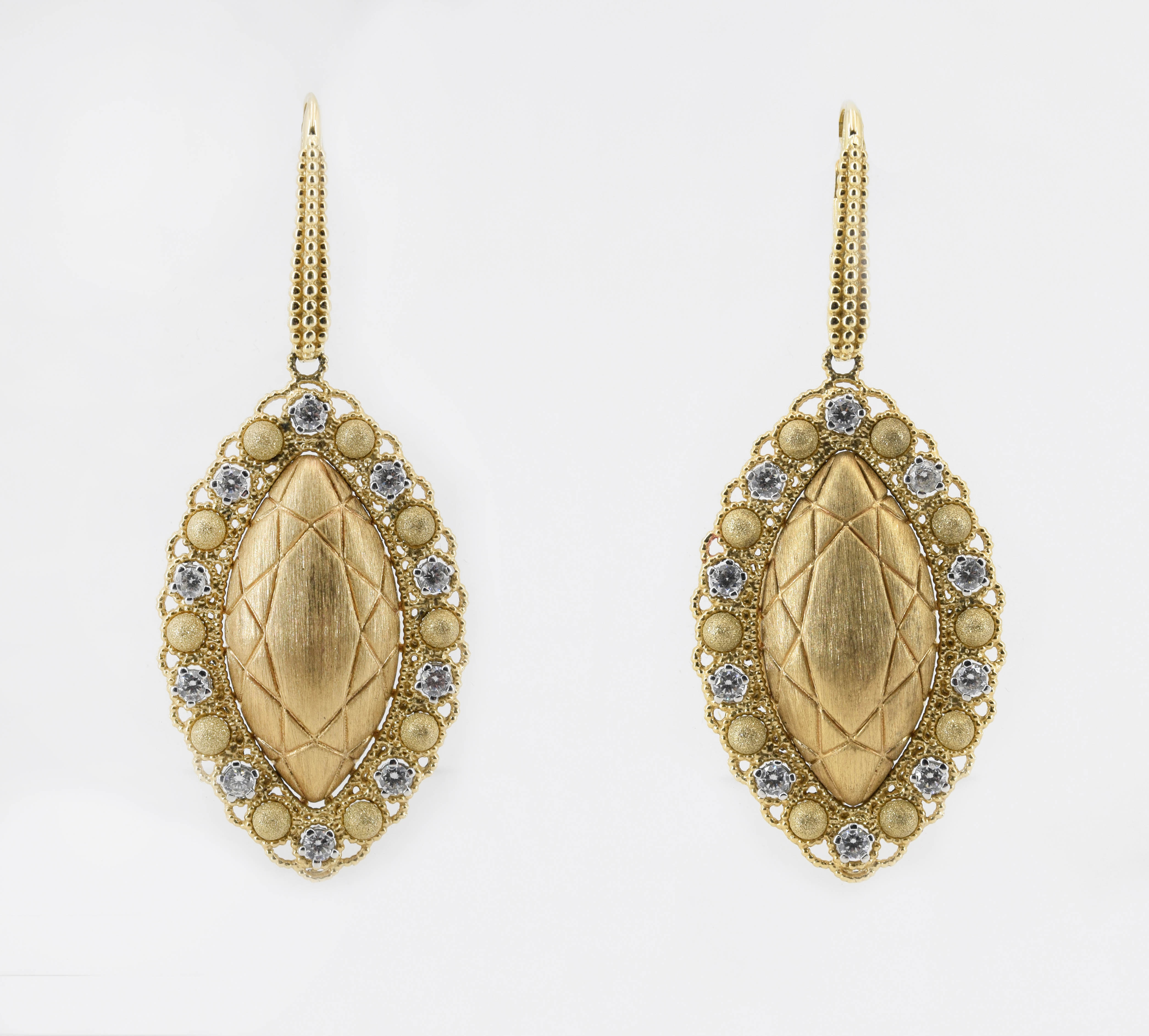 wiszące, stylizowane kompozycje z motywem filigranu o kształcie migdała wysadzane 20 szt. okrągłych, fasetowanych kryształów,