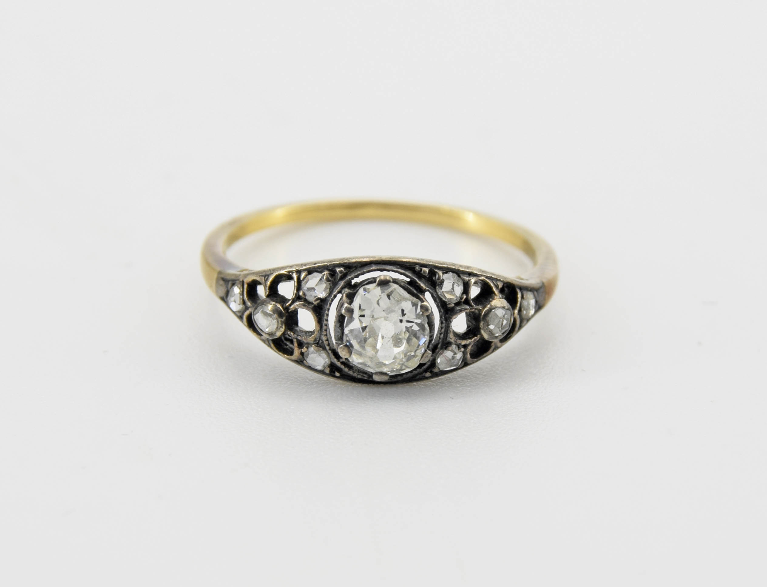diament w szlifie starym europejskim o masie ok. 0.49 ct (P1/G-I) w oprawie z 8 szt. rautów diamentowych o masie łącznej ok. 0.12 ct (Si-P1/G-J),