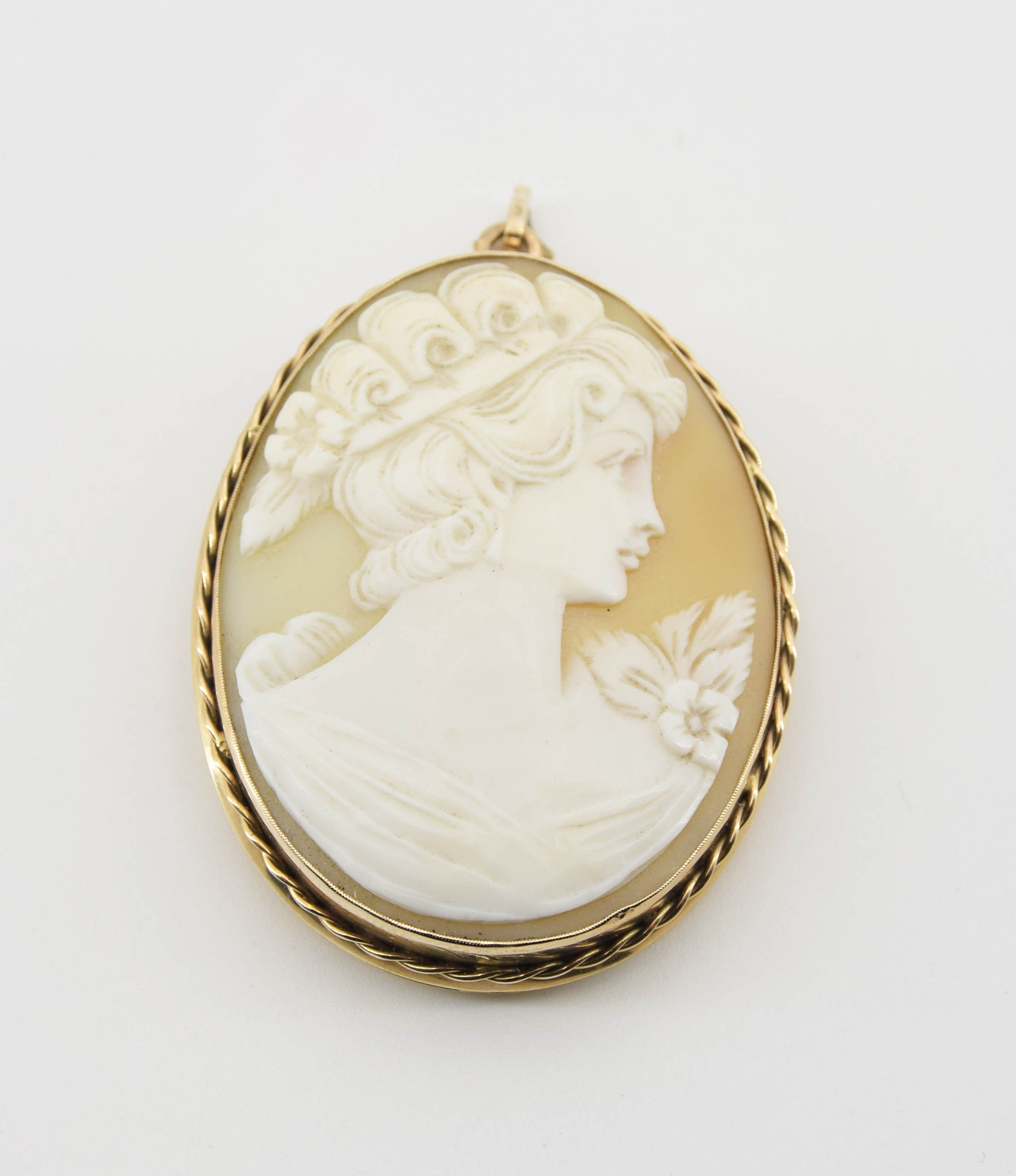 popiersie kobiety rzeźbione na muszli z dekoracją filigranową,