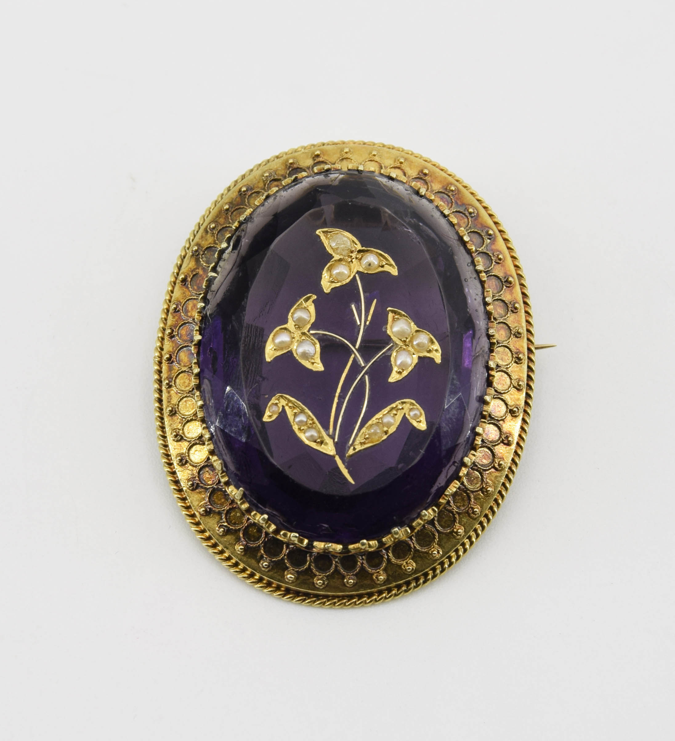 owalny, fasetowany ametyst o wym. 32.50 x 24.50 mm z inkrustacją motywu roślinnego wysadzanego 15 szt. pereł o śr. 1.00 - 1.70 mm,