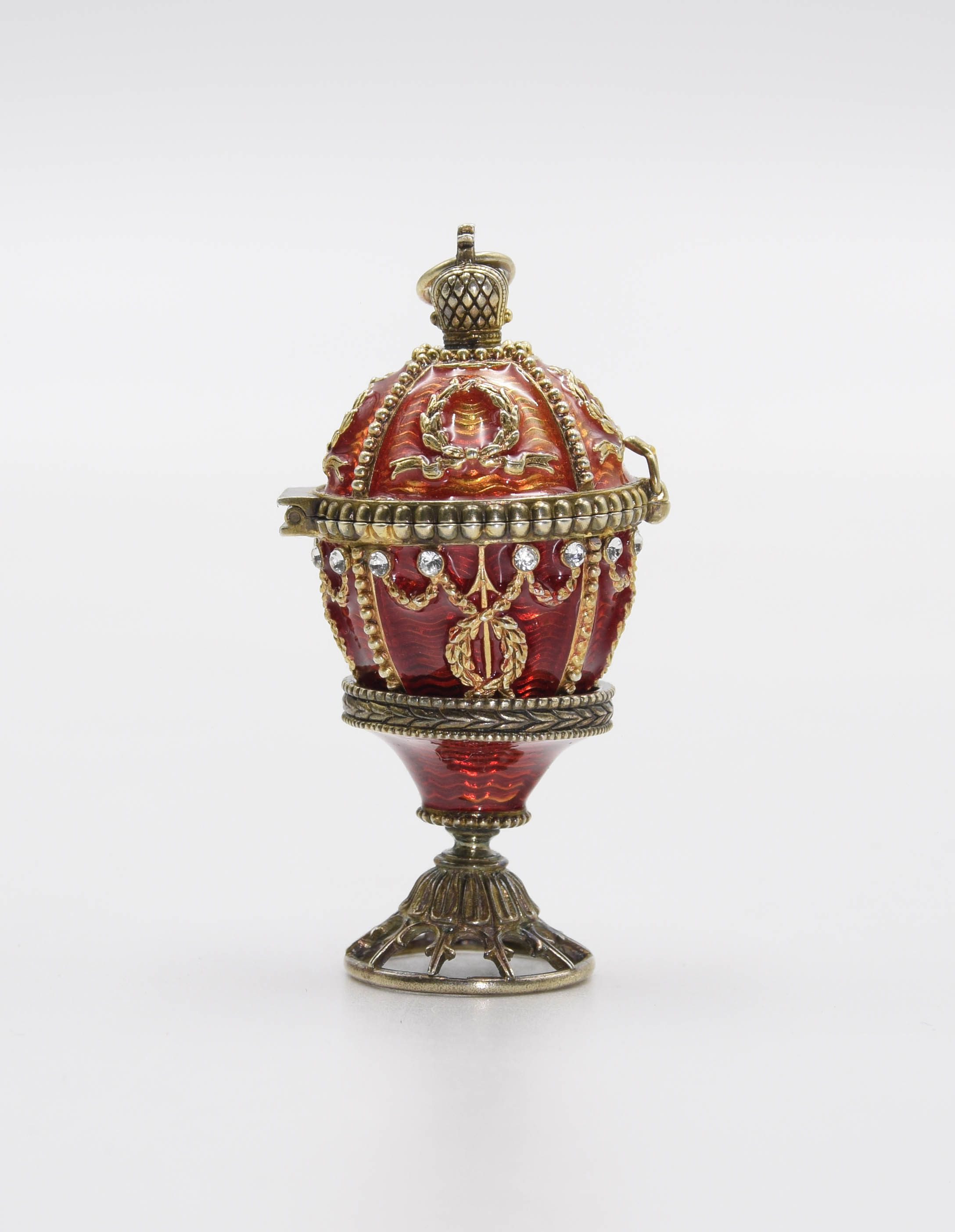 Forma otwieranego jaja z niespodzianką we wnętrzu w postaci miniaturki korony carskiej na poduszeczce, inkrustowanego czerwoną i...