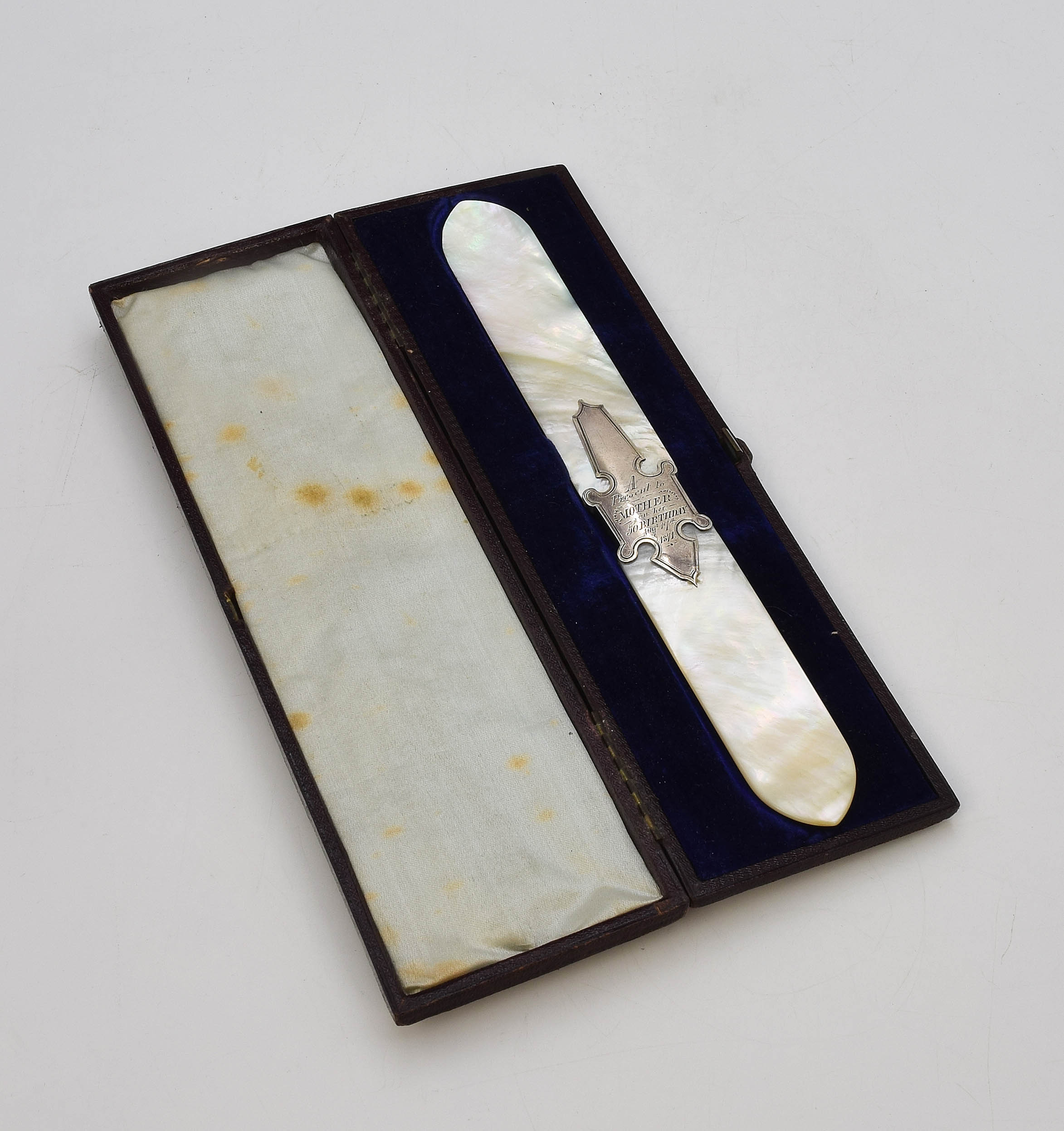 macica perłowa, srebro niecechowane; 23,7 x 2,8 x 0,7 cm; etui: drewno, skóra brązowa, plusz fioletowy, biały atłas, 25 x 8 x 2,7 cm.