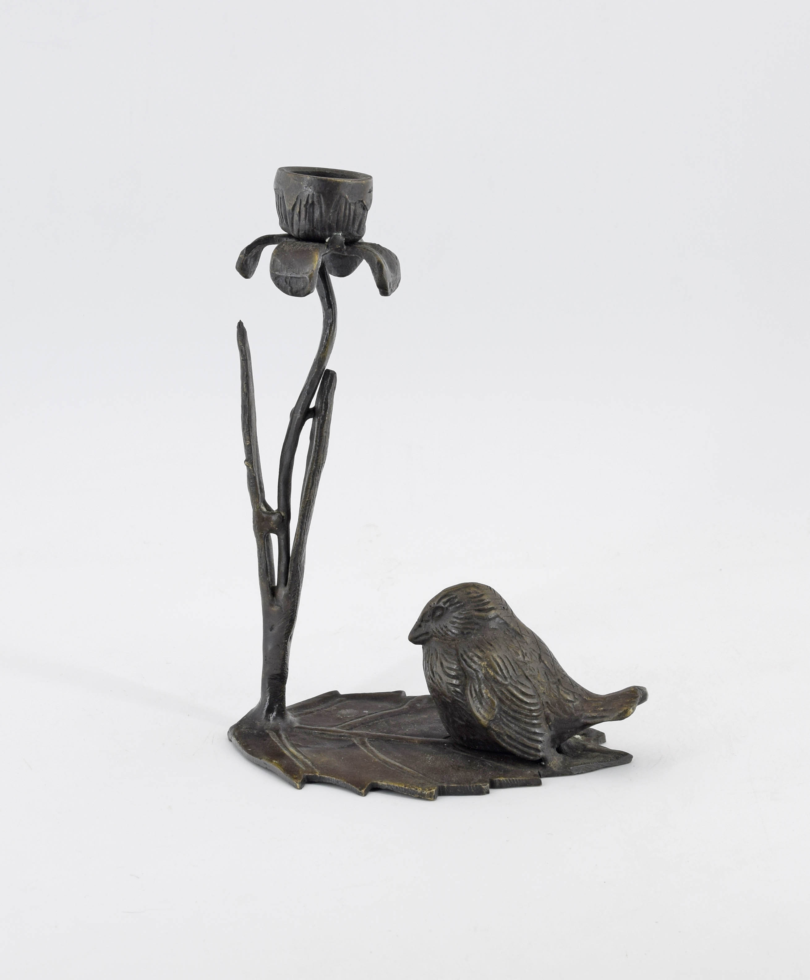 Podstawa w formie liścia, na niej figurka wróbelka oraz lichtarzyk w kształcie kwiatu na smukłej gałązce.