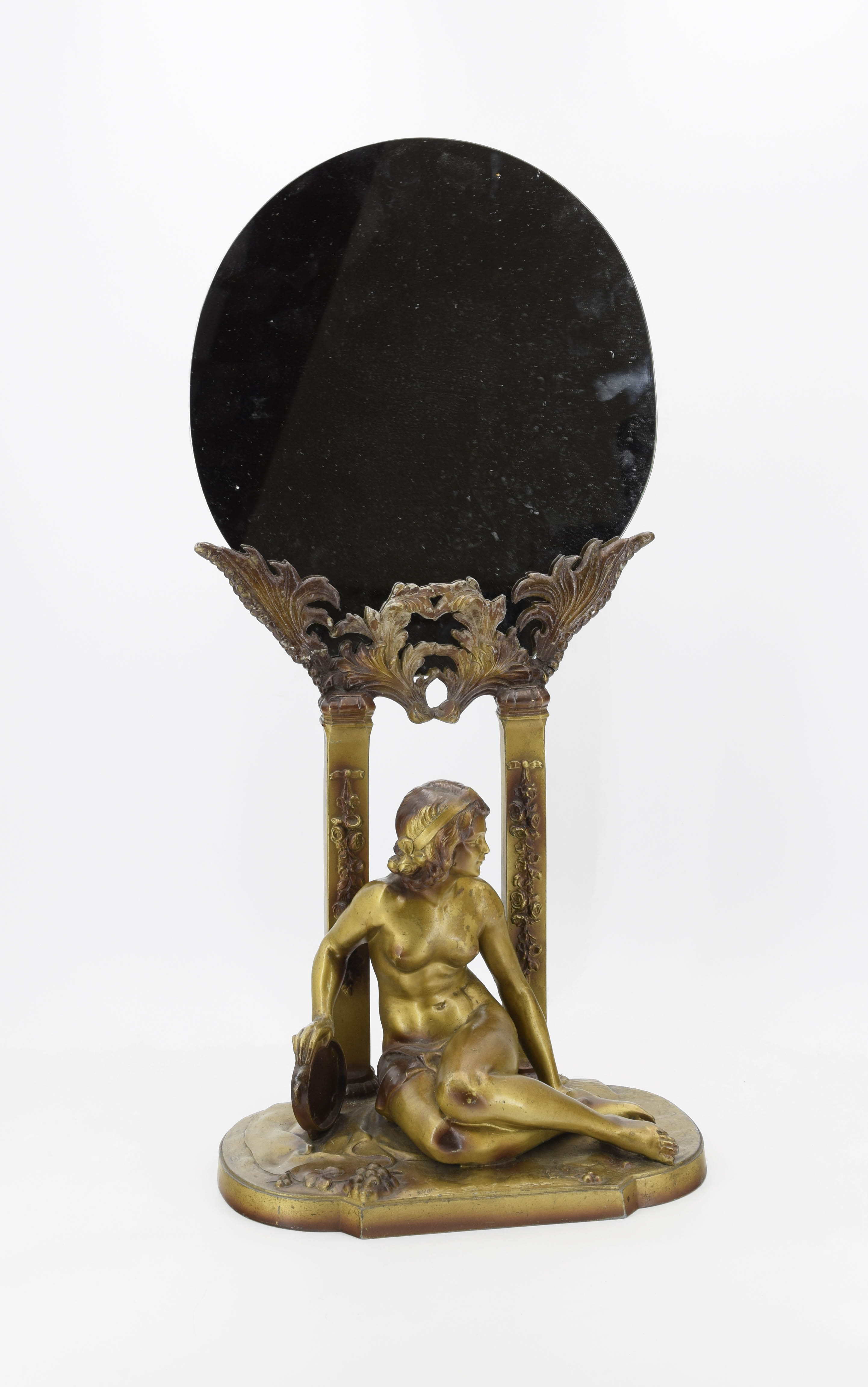 metal złocony wtórnie, tafla lustrzana; wys. 58,5 cm; szer. 28 cm; głęb.17 cm;