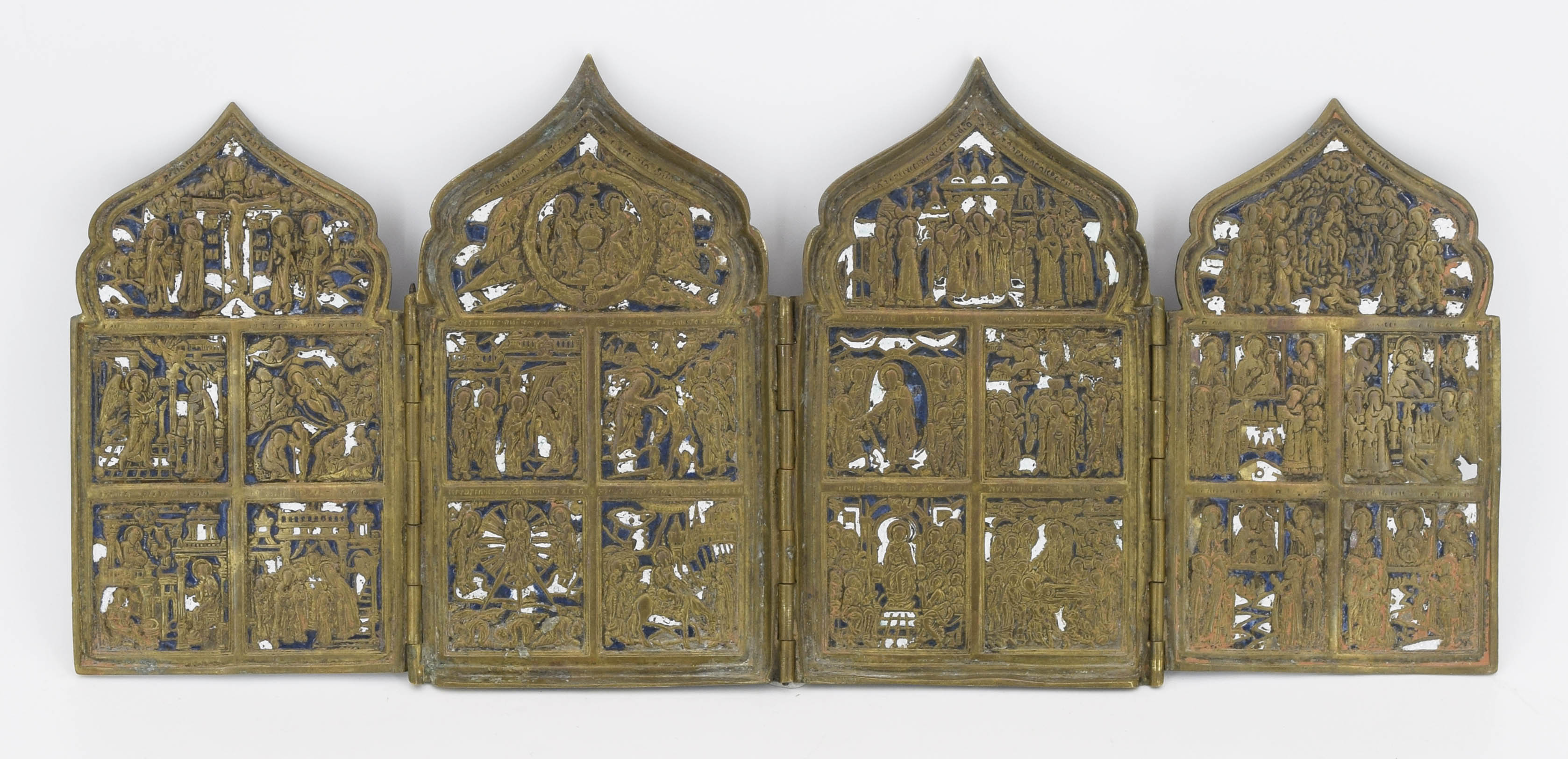 mosiądz, odlew cyzelowany, dekorowany wielobarwną emalią (dwa kolory biały i granatowy) wypełniającą tło, inskrypcje cyrylicą; 17,8 x 40,8 cm (po rozłożeniu), po złożeniu grubość 2 cm;