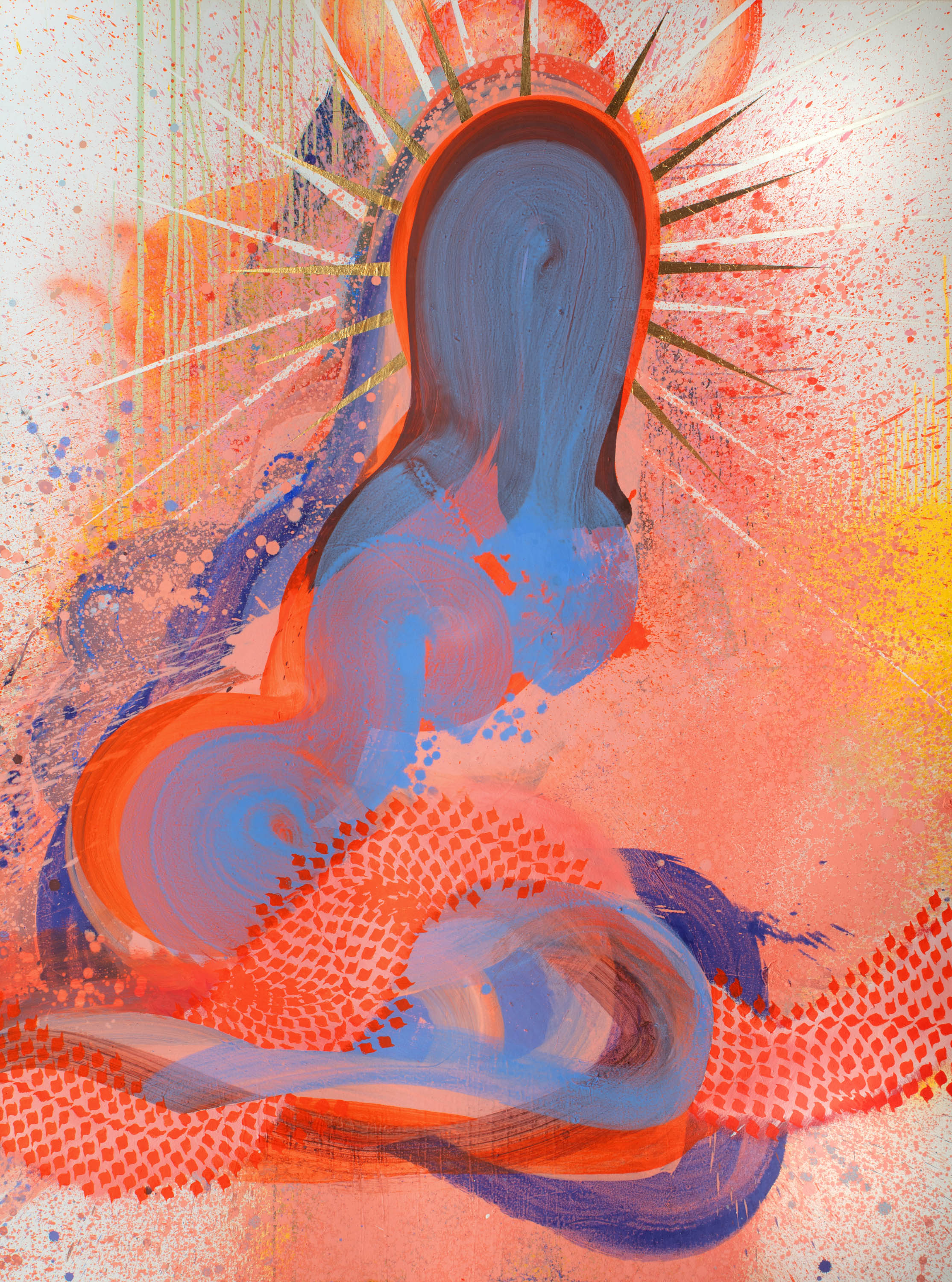 sygnowany i opisany na odwrocie: "AKT KOBIECY - MADONNA|olej, płatek szlagmetalu|na płótnie|150 x 200 cm|2021 r."