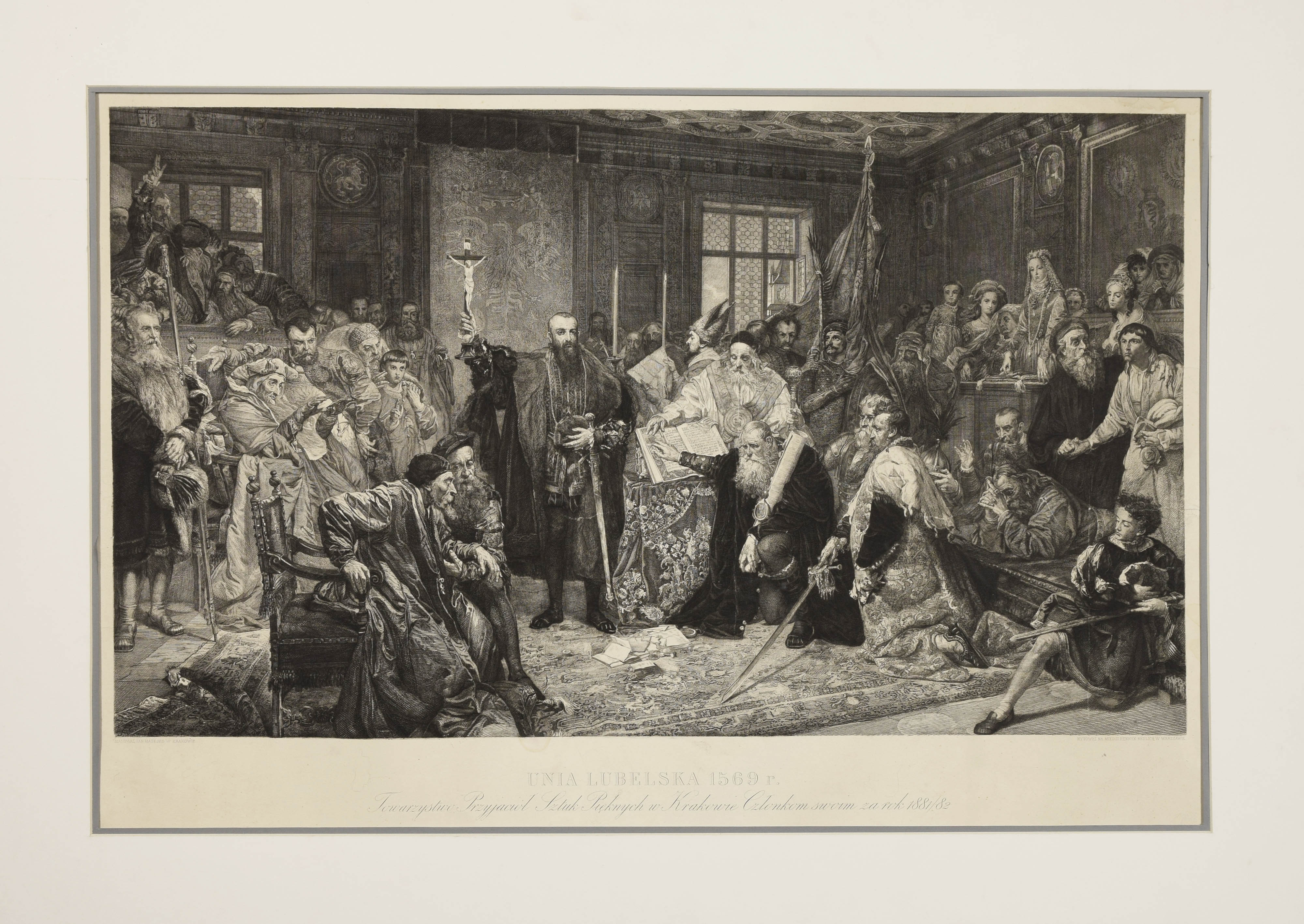 napis drukiem pośrodku u dołu: „UNIA LUBELSKA 1569 r. / Towarzystwo Przyjaciół Sztuk Pięknych w Krakowie Członkom swoim za rok 1881/82”;