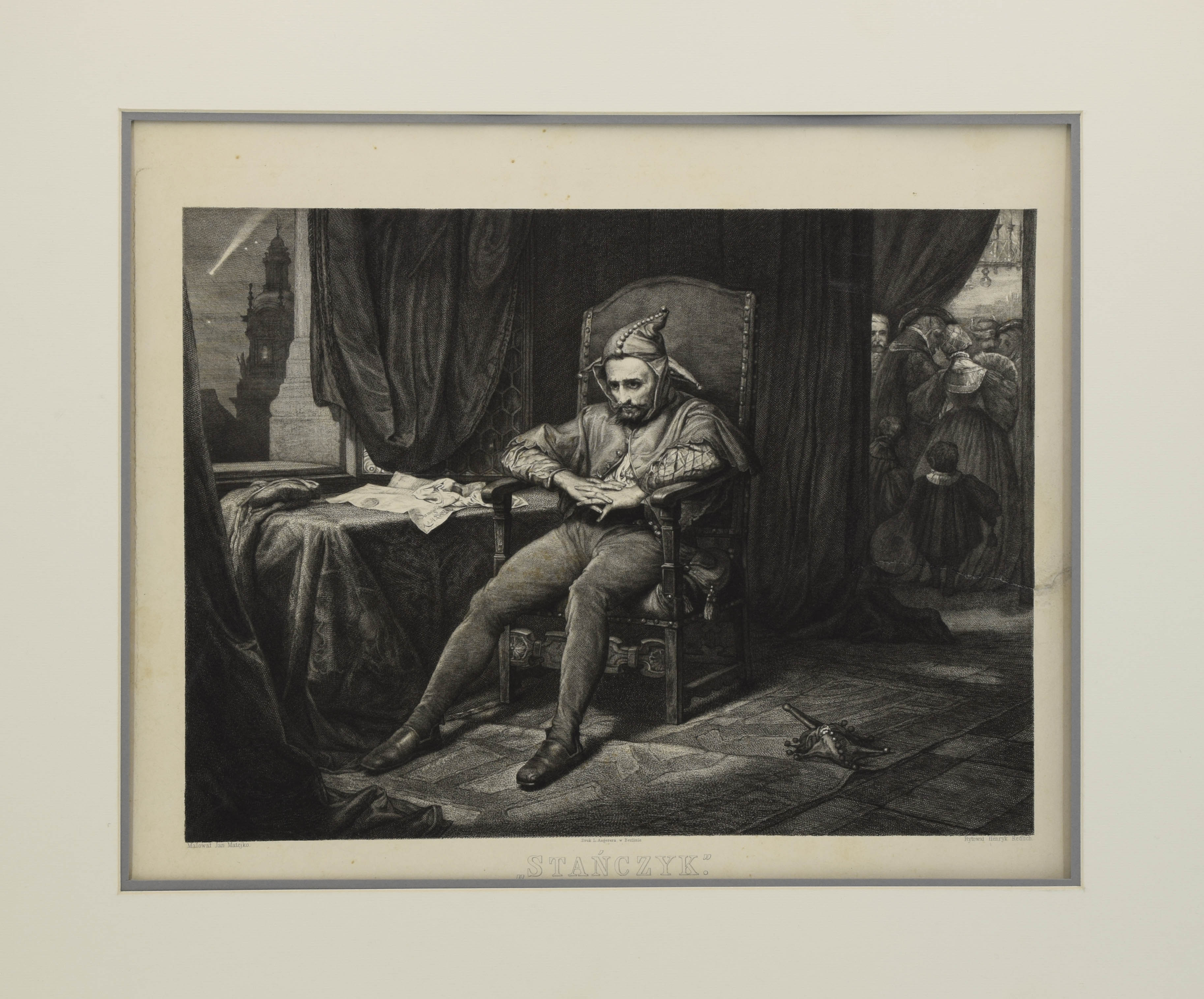 l. d.: Małował Jan Matejko, p. d.: Rytował Henryk Redlich, śr. d.: Druk L. Angerera w Berlinie, niżej: "STAŃCZYK" / Towarzystwo Zachęty Sztuk Pięknych w Królestwie Polskim Członkom...