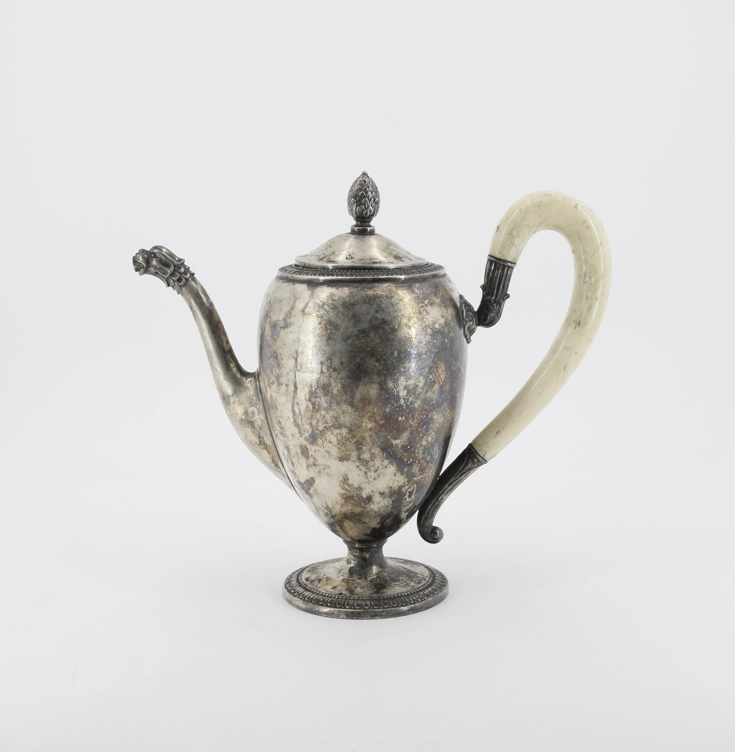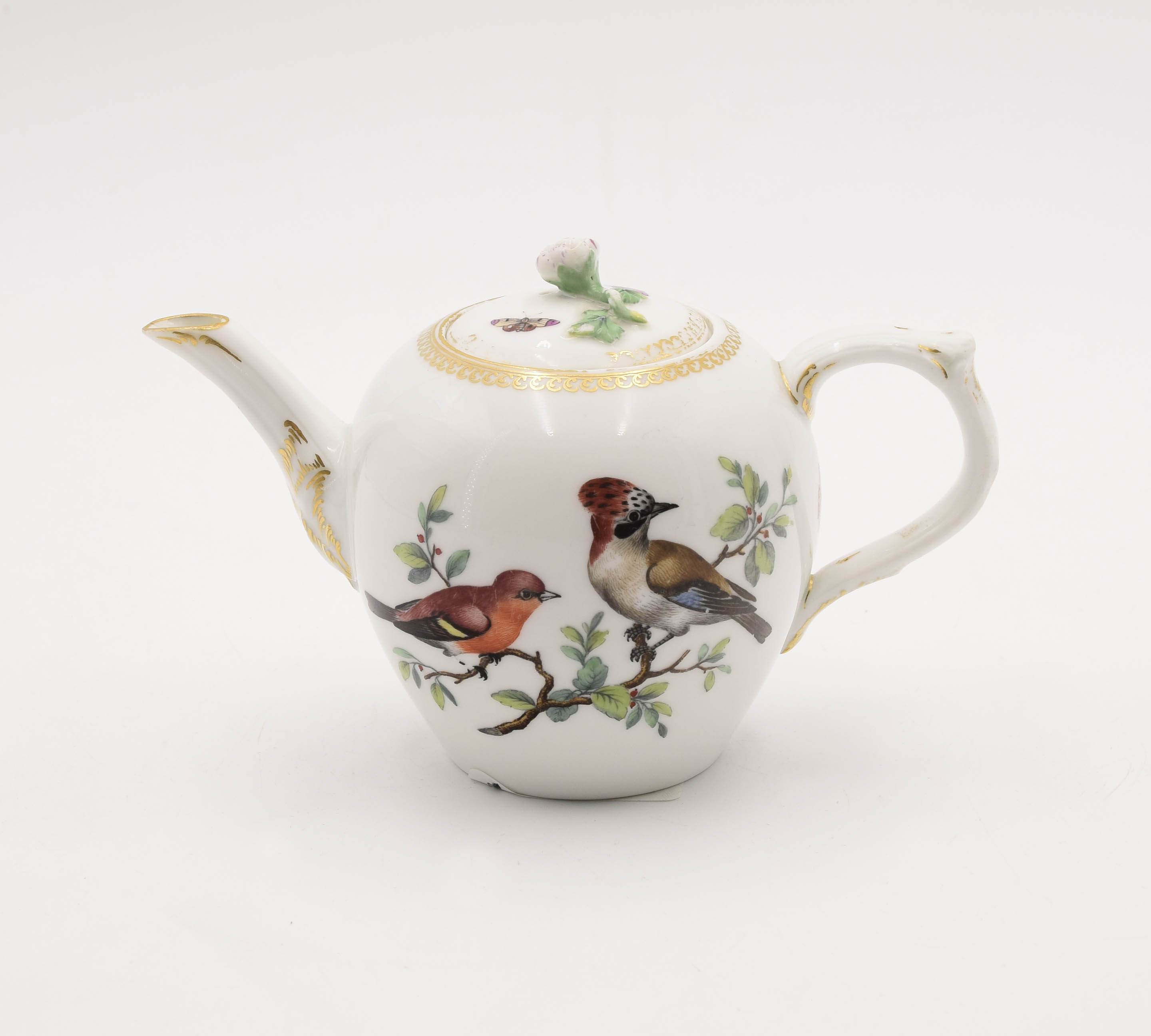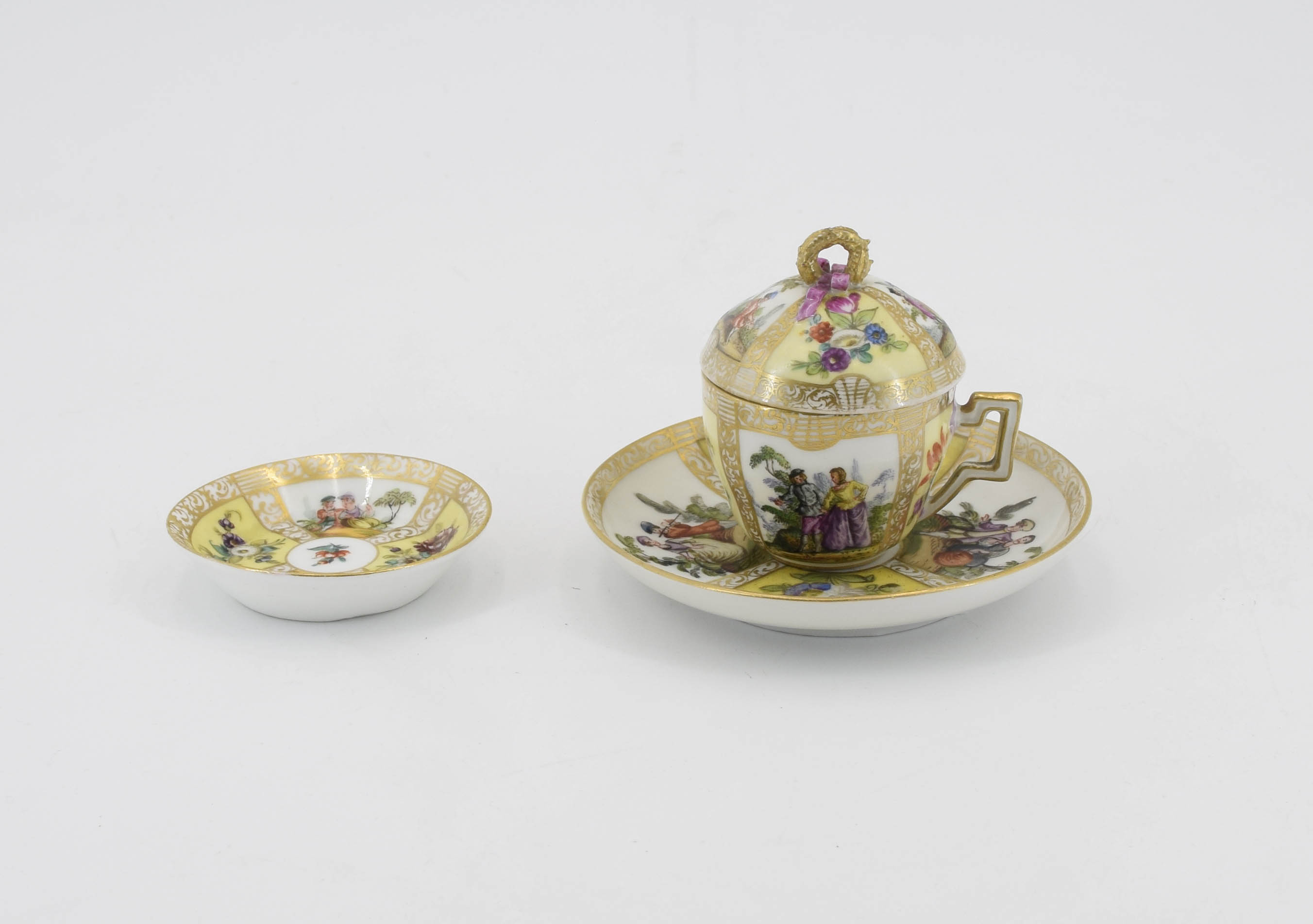 porcelana, farby naszkliwne, złocenie; wymiary: filiżanka z pokrywką - wys. 7,5 cm, spodek - śr. 7 cm; talerzyk - śr.: 11 cm;
