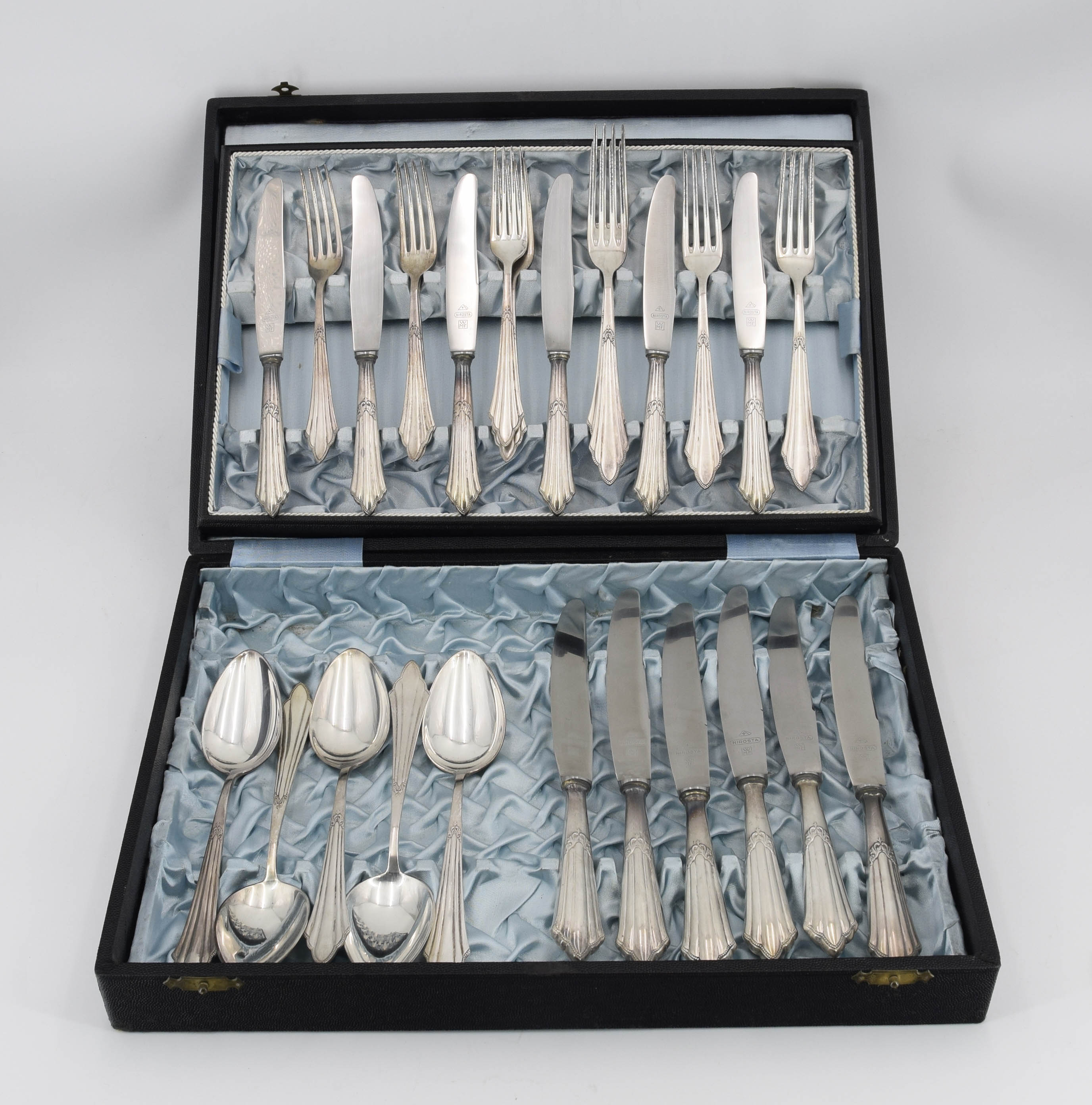 plater; noże duże 6 szt. o dł.: 25 cm, łyżki 5 szt. o dł.: 20,8 cm, noże małe 6 szt. o dł.: 21 cm, widelce duże 6 szt. o dł: 20,2 cm, widelce małe 5 szt. o dł.: 18,3 cm;