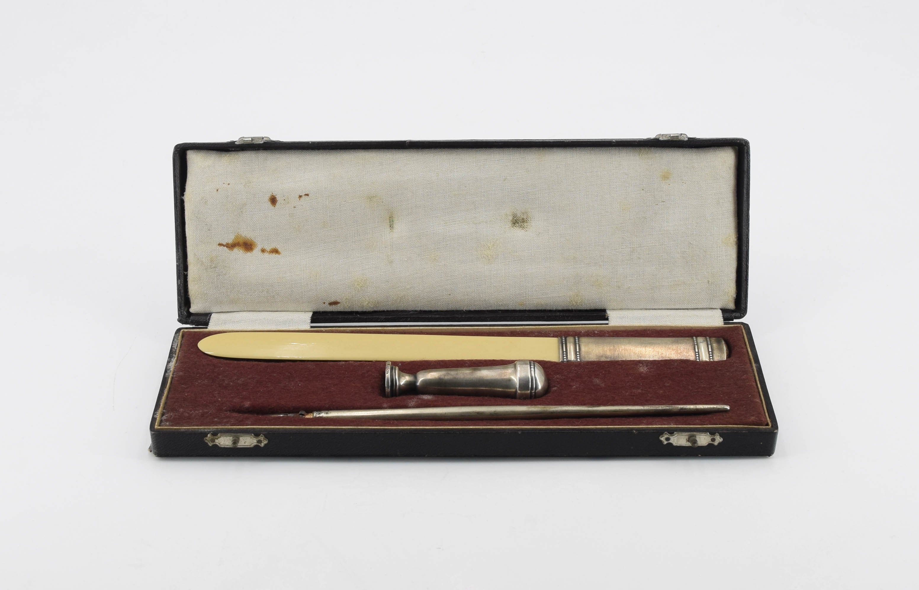 alpaka; dł. pióra: 18,7 cm, dł. noża: 22,4 cm, dł. tłoka pieczętnego: 6,5 cm.