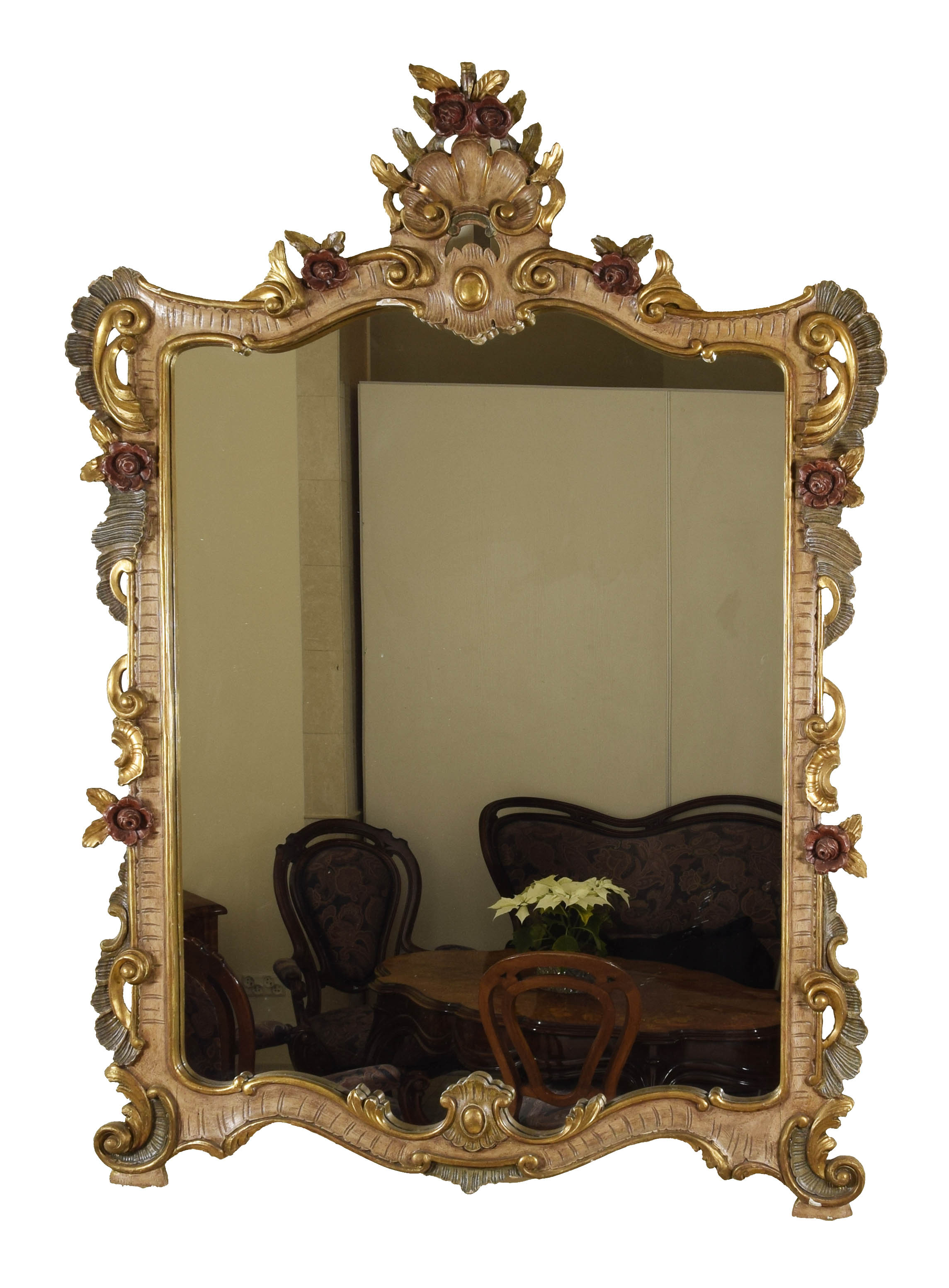 drewno, gipsatura, złocenie; tafla lustrzana; wys. 169 cm; szer. 116 cm; tafla lustrzana: ok. 124 x 89 cm;