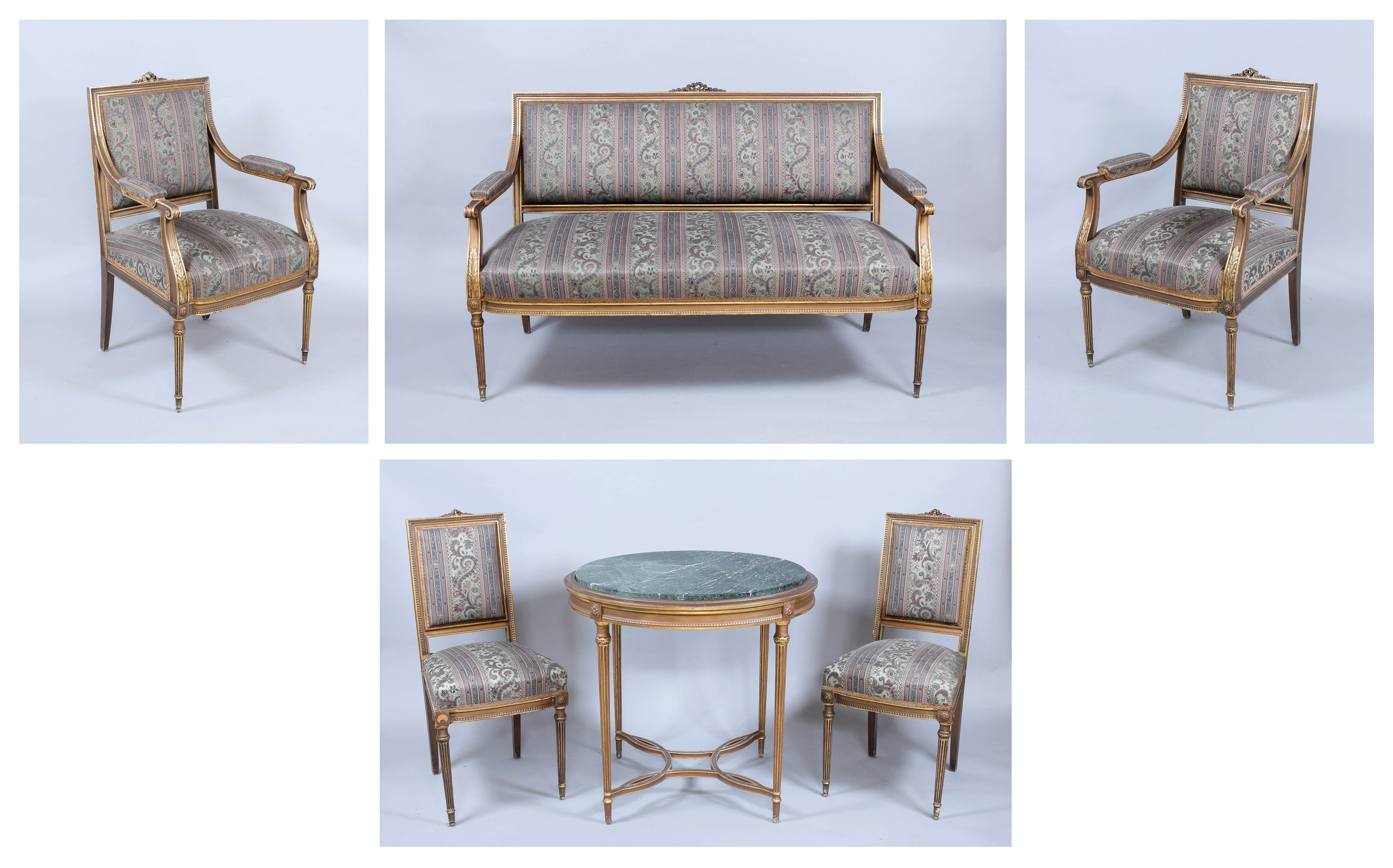drewno liściaste (brzoza?); wymiary: kanapa - 95 x 145 x ok. 65 cm, fotele - 95 x 61 x 63 cm, krzesła - 92,5 x 43,5 x 48,5 cm, stół - 76 x śr. 80,5 cm.