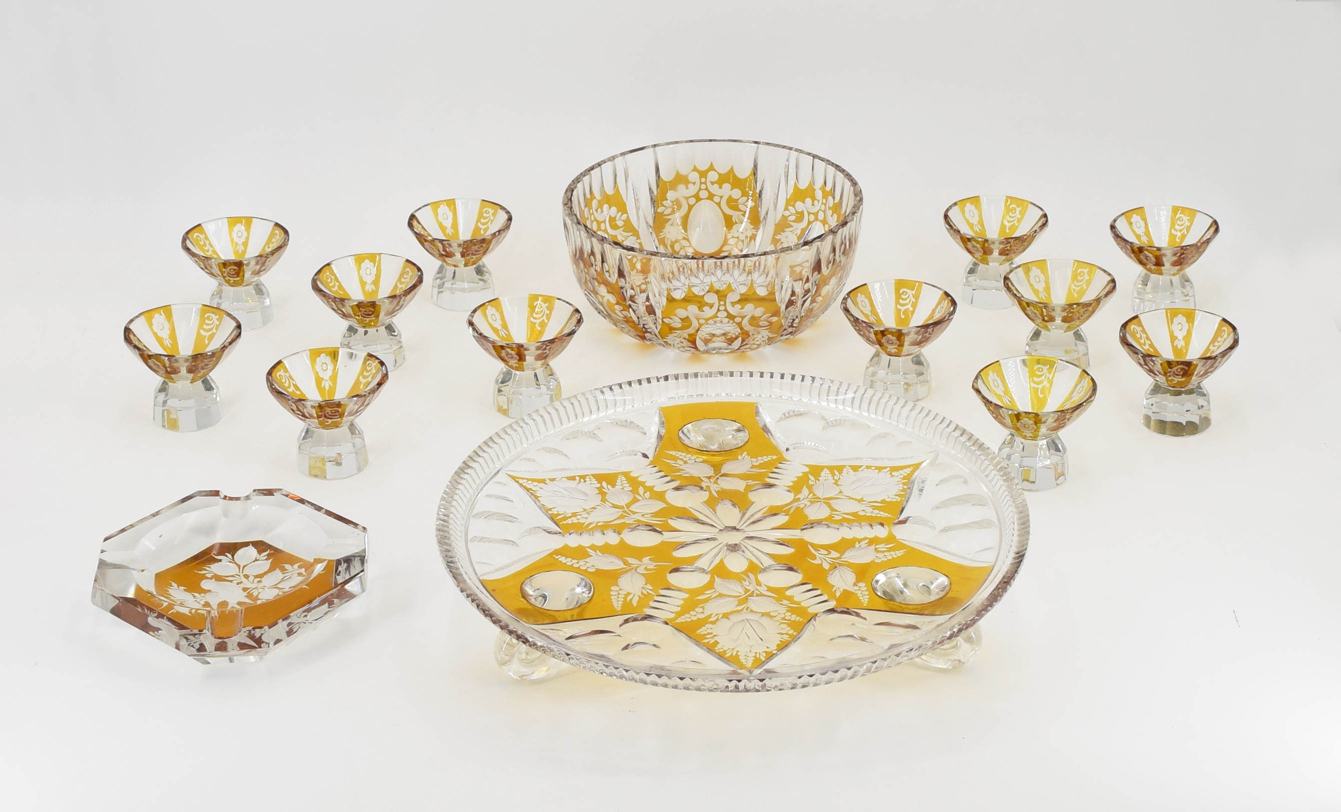 szkło kryształowe, szlifowane, z listrą miodową; wymiary: misa - 8 x 18,5 x 18,5 cm; taca - śr.: 29 cm; kieliszek (12 szt.) - wys.: 5,5 cm; popielniczka - 3,3 x 12,2 x 12,2 cm.
