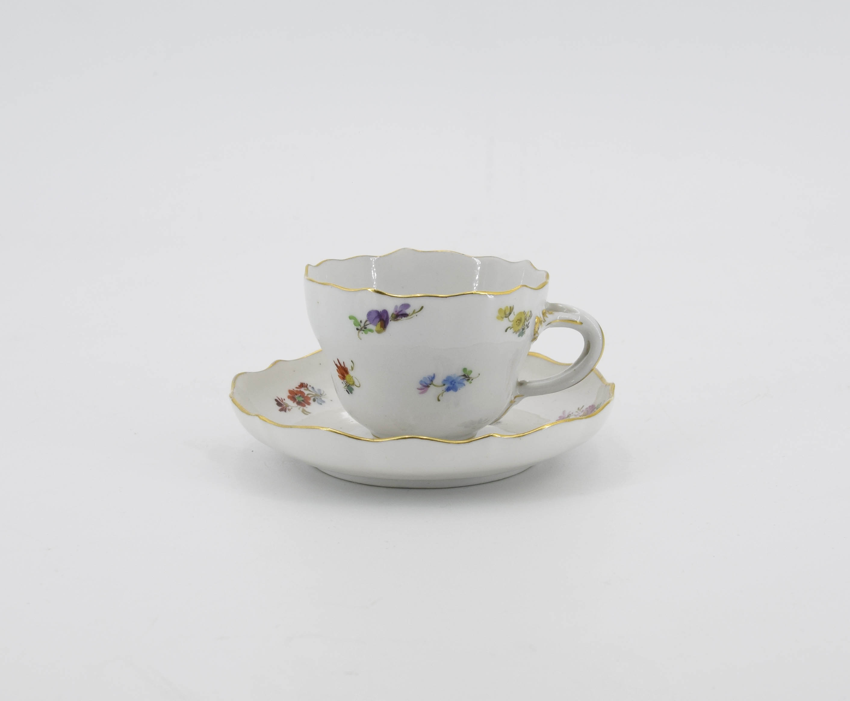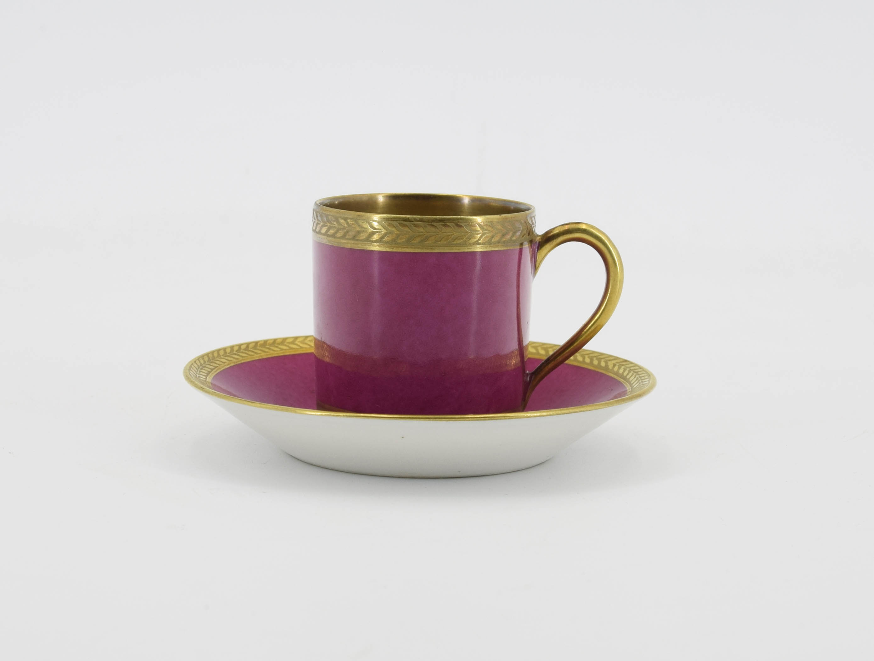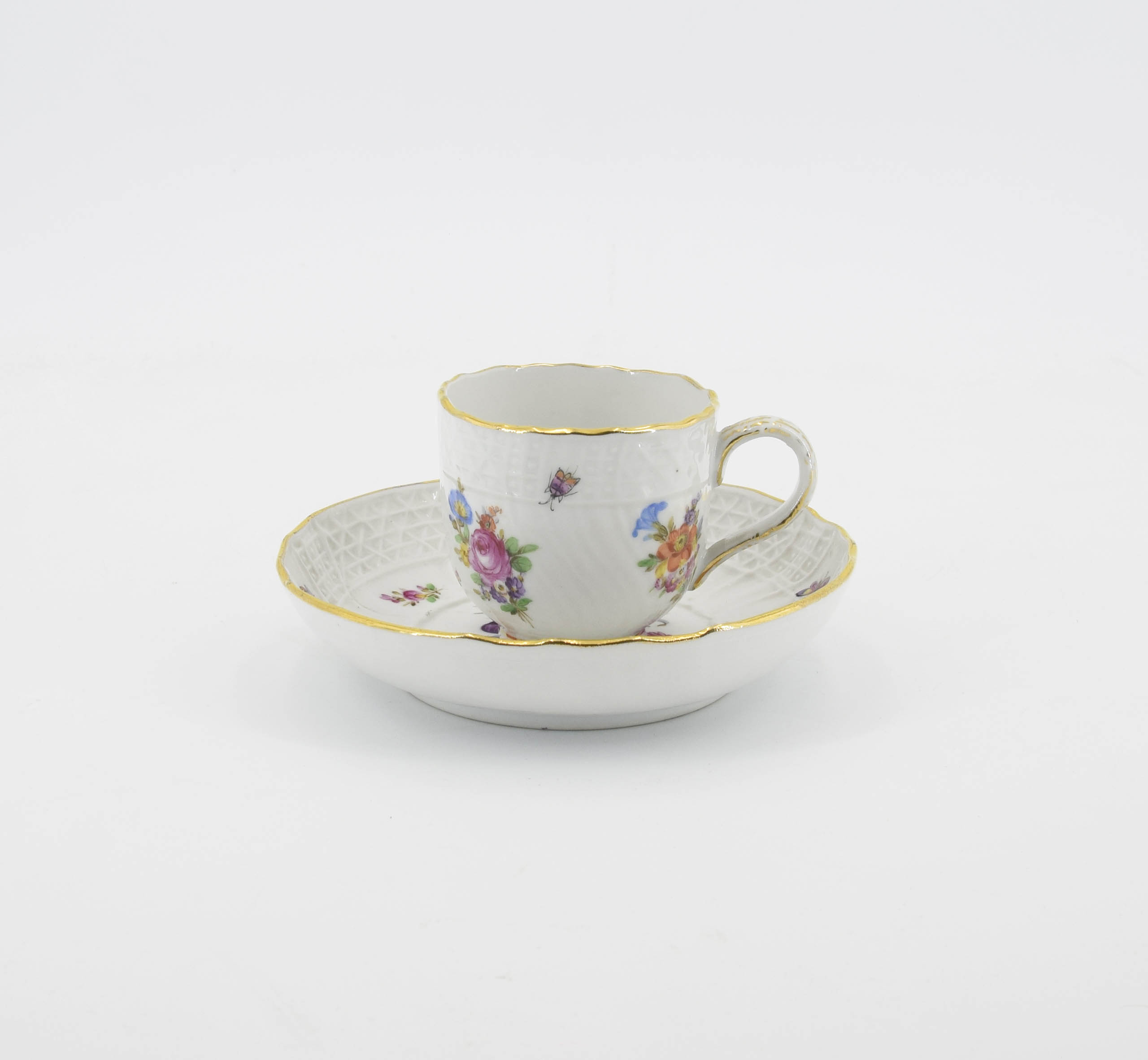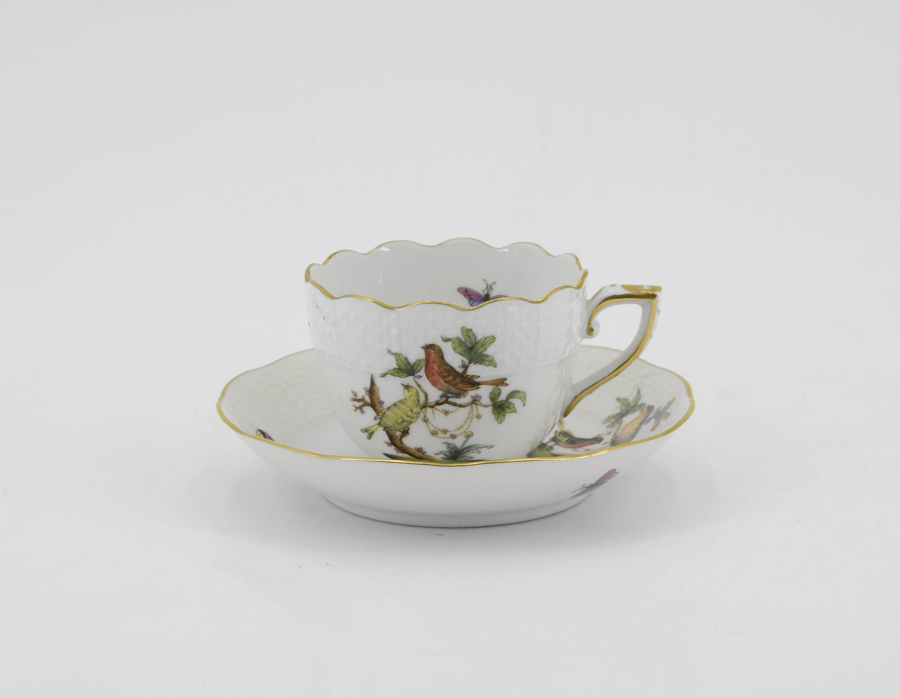 porcelana, farby naszkliwne, złocenie; wymiary: filiżanki - wys. 4 cm, spodek - 12 x 11 cm;