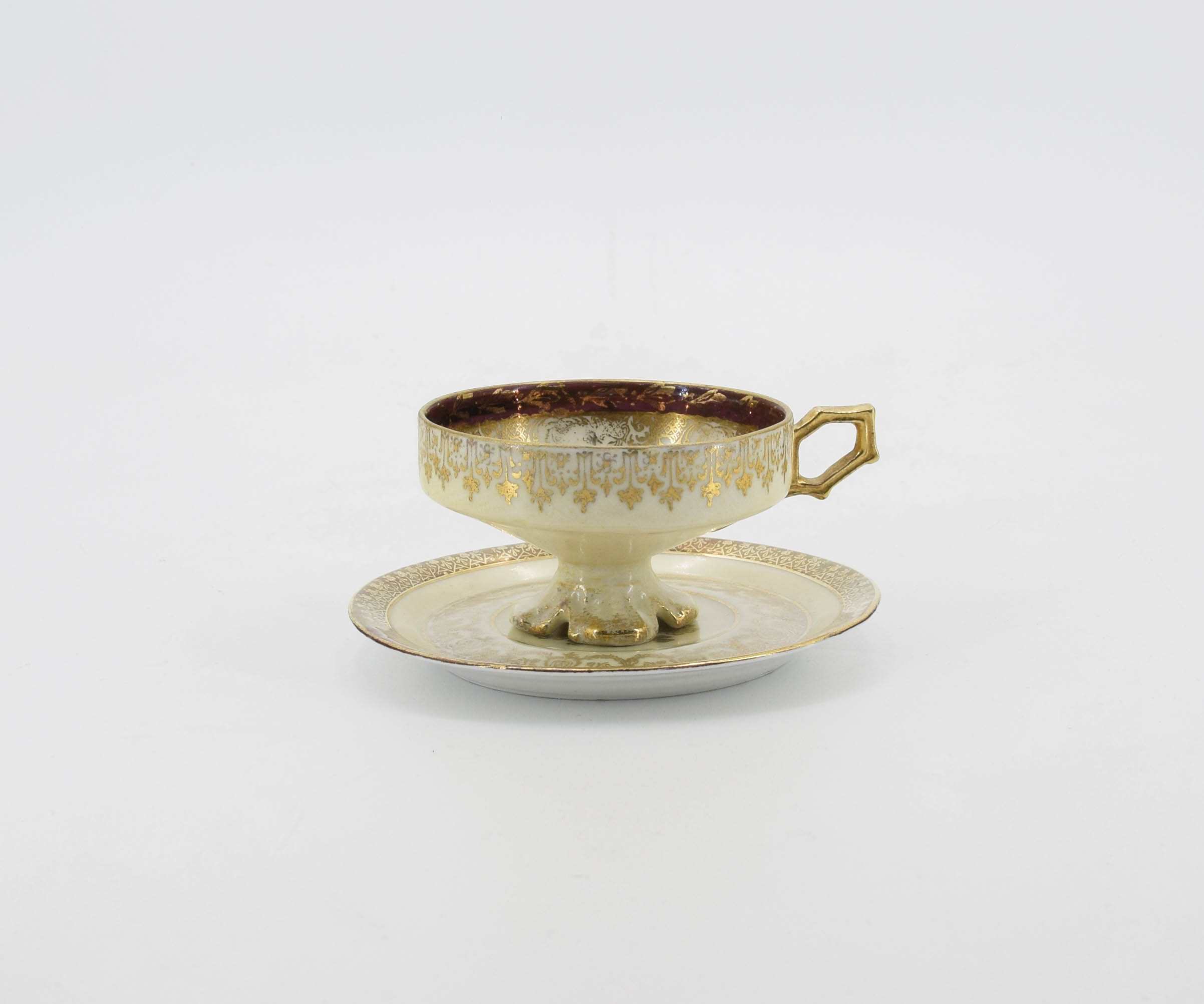 porcelana kremowa, dekoracja i złocenie drukowane; wymiary: filiżanka - wys. 4,4 cm, spodek - śr. 10,7 cm;