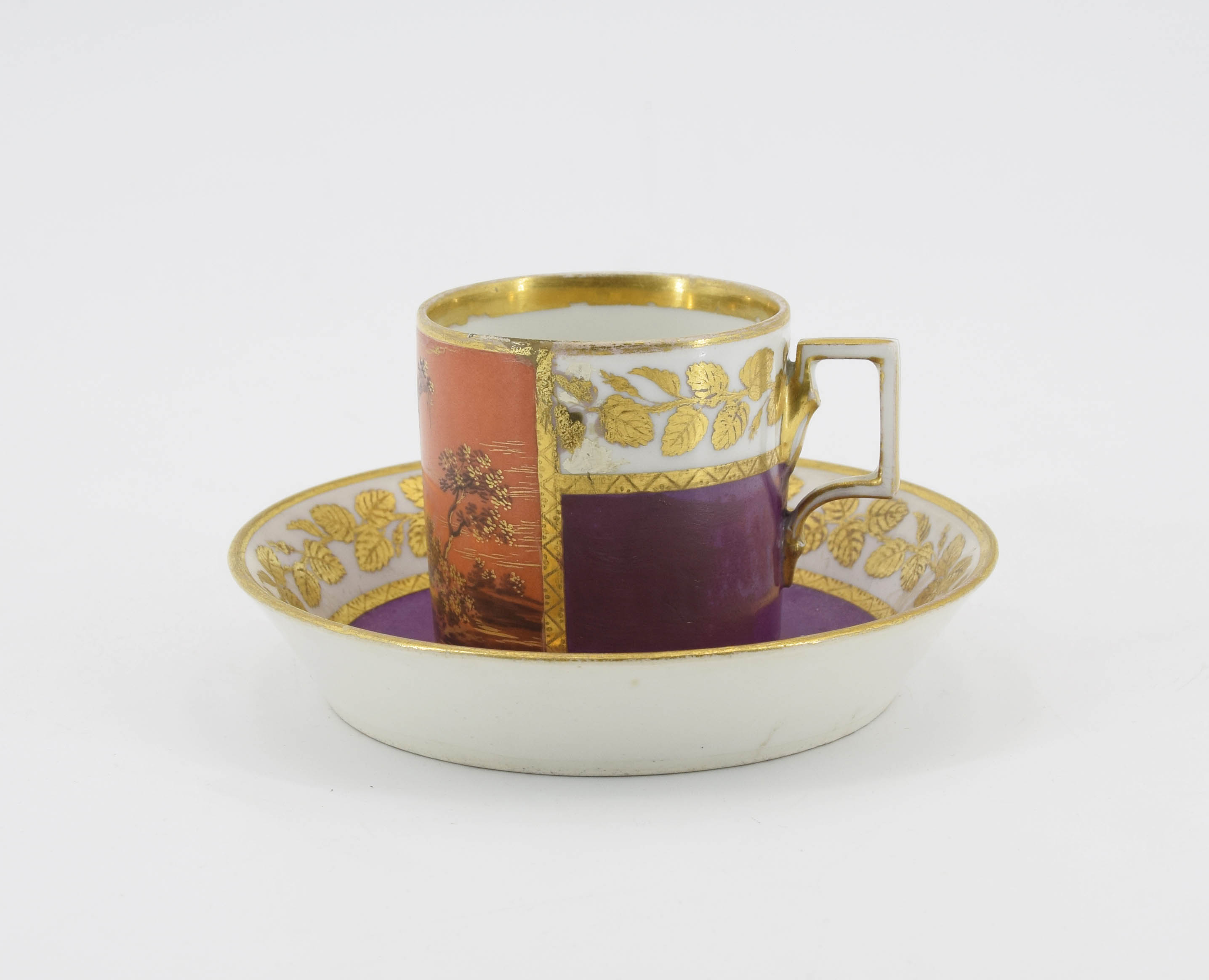 porcelana, farby naszkliwne, złocenie; wys. filiżanki: 6 cm, śr. talerzyka: 13,3 cm;