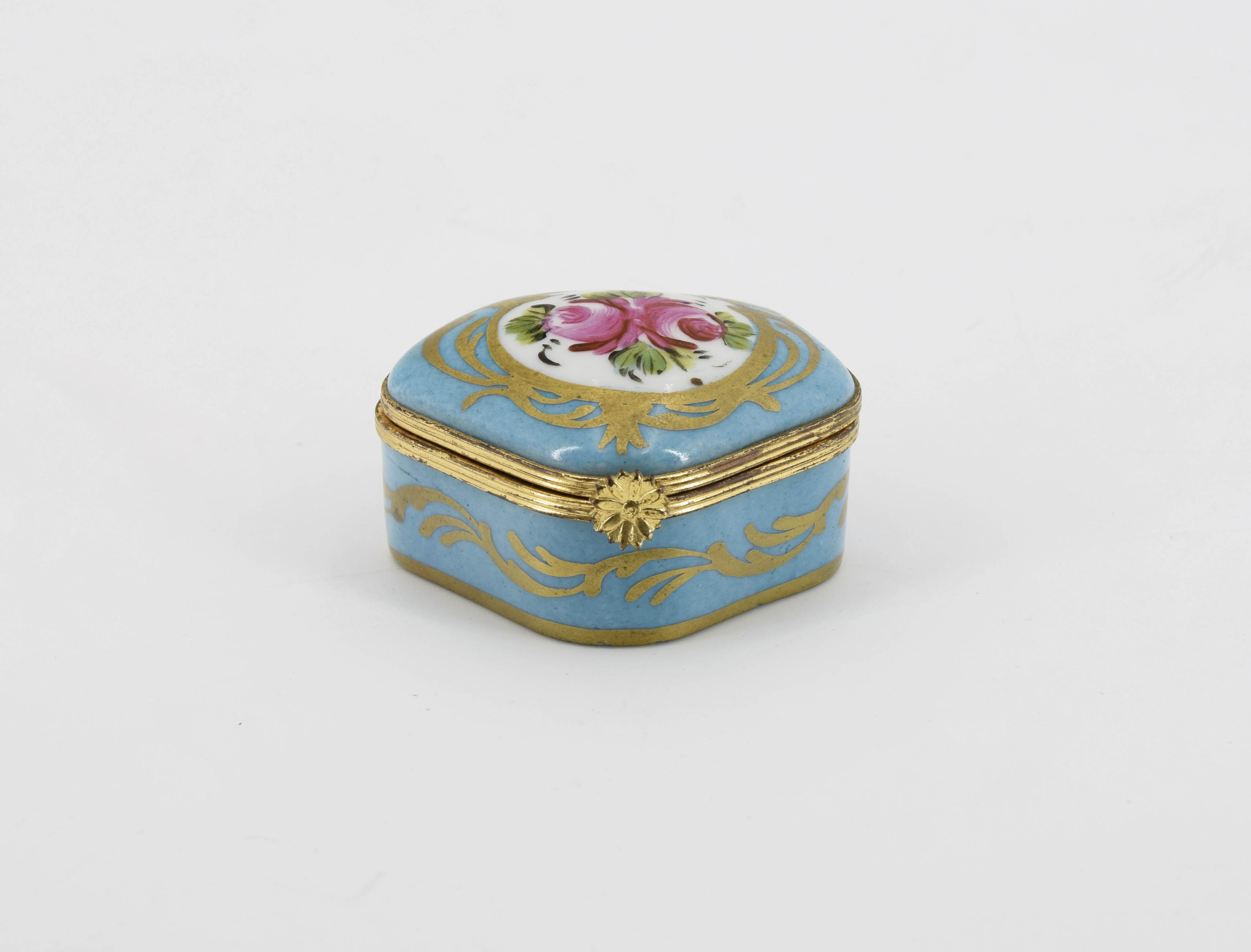 porcelana, farby naszkliwne, złocenie, mosiądz; wym.: 3,2 x 6,5 x 5,3 cm;