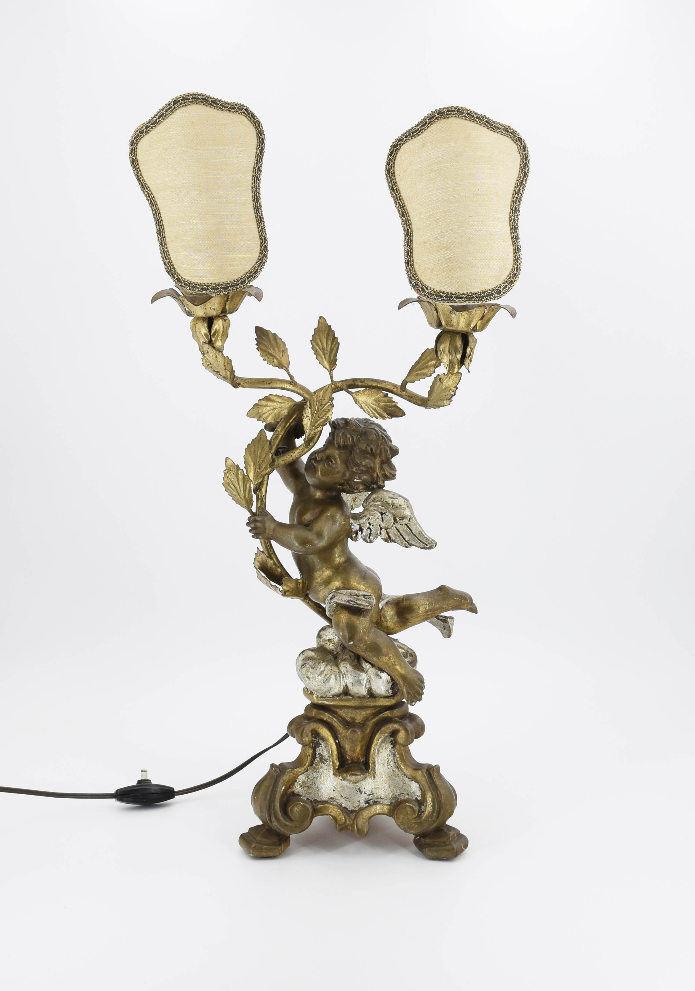 drewno polichromowane (złocenia szlakmetalem i srebrzenia) metal malowany na złoto (pędy róż z obsadkami); wys. 58 cm; szer. 29 cm, głęb. 19 cm;