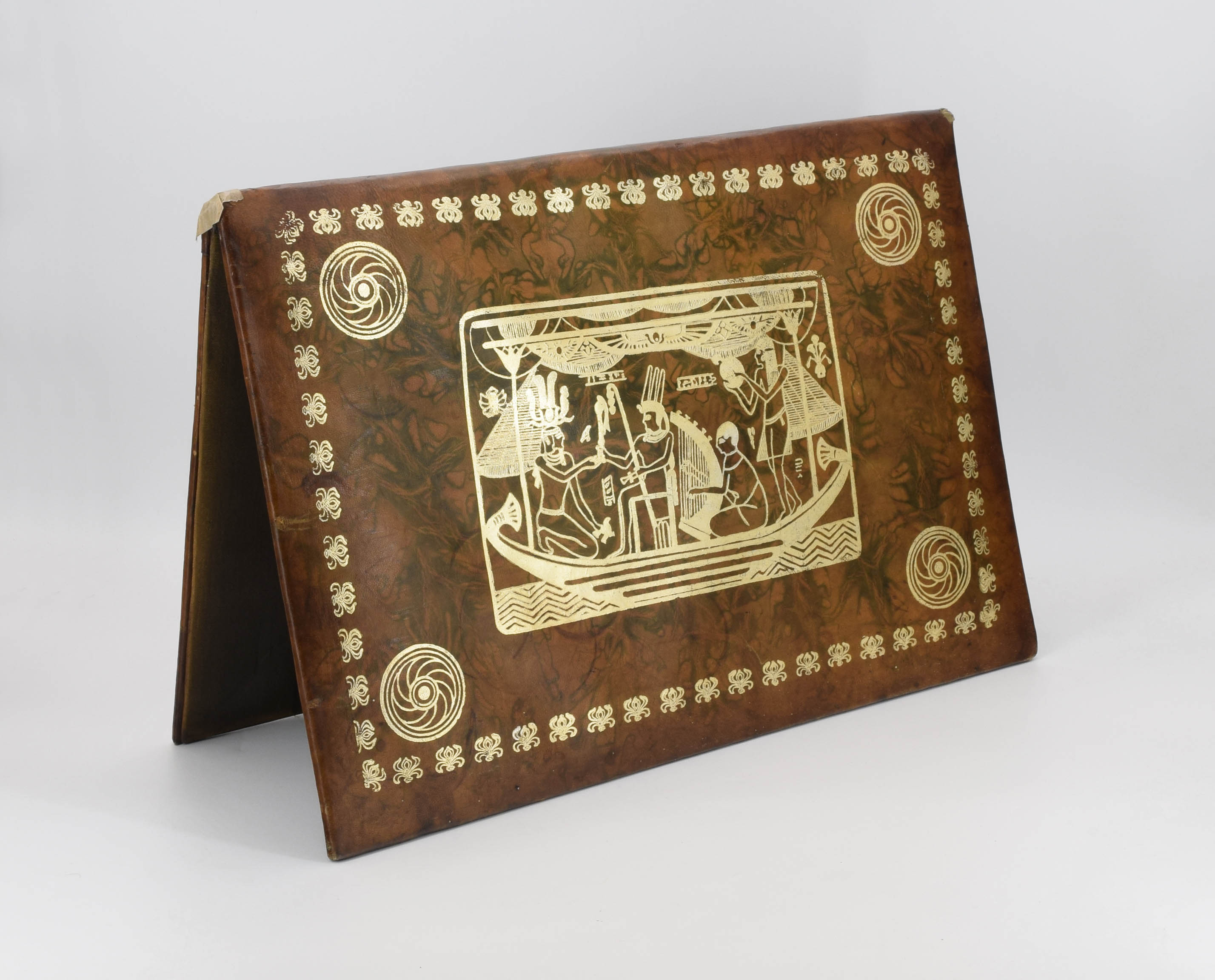 skóra, złocenie, tkanina; wym. w złożeniu: 32 x 46,5 cm.