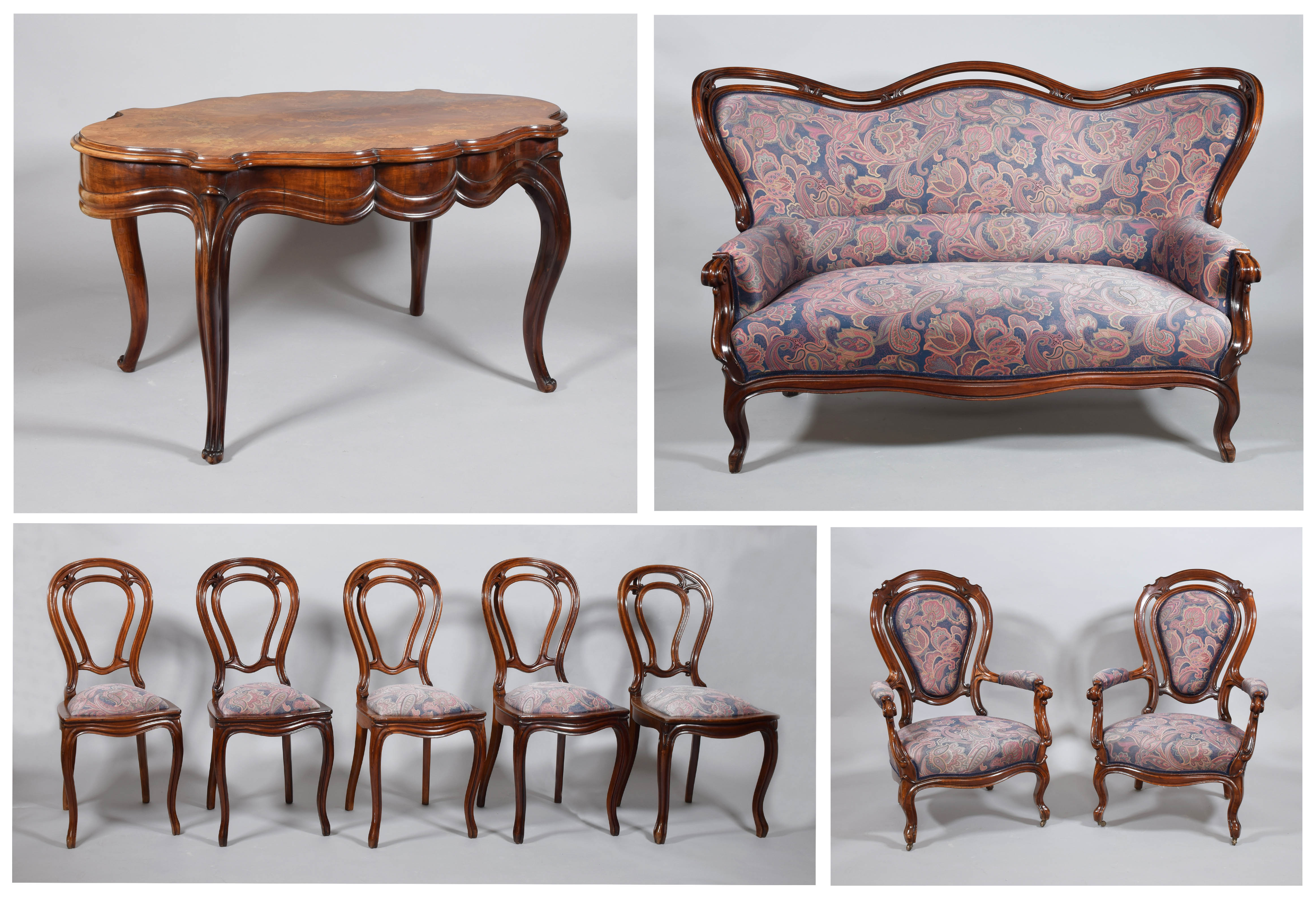 wymiary: kanapa - 111 x 170 x 86 cm, para foteli - 101,5 x 67 x 74 cm, krzesła szt. 5 - 96, 5 x 43 x 45 cm, stół - 72,5 x 142 x 87 cm.