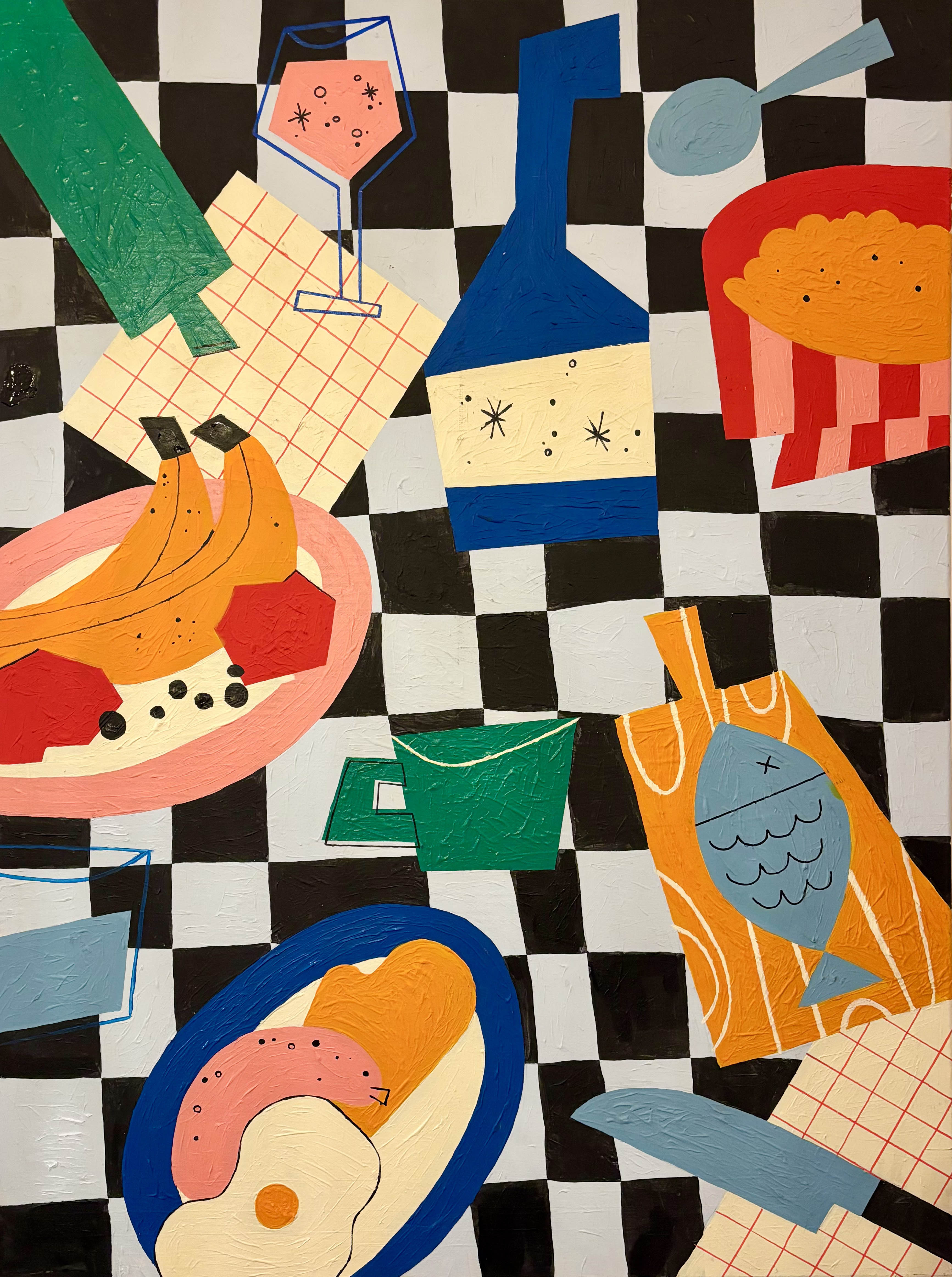 technika mieszana (akryl, papier, tusz), płótno, 70 x 100 cm,