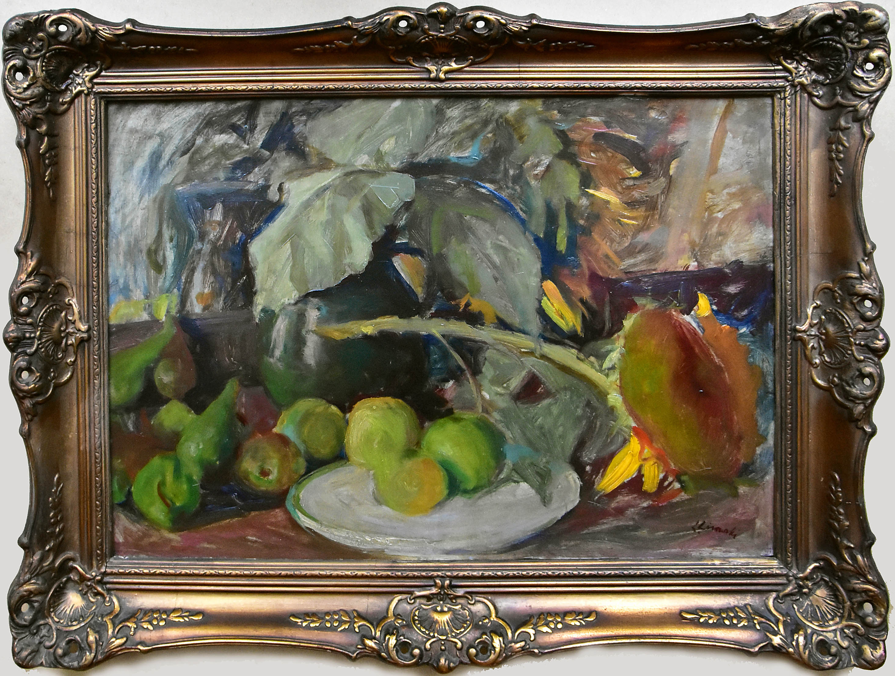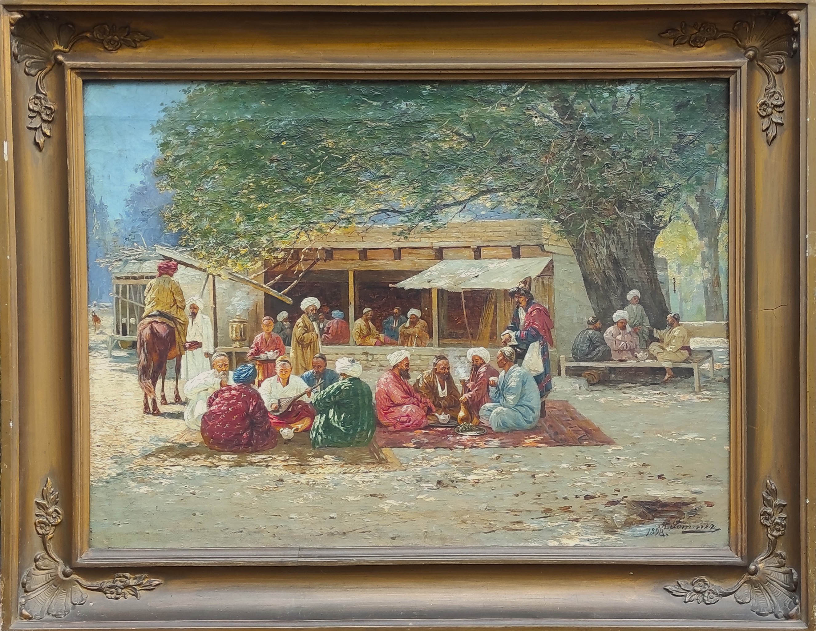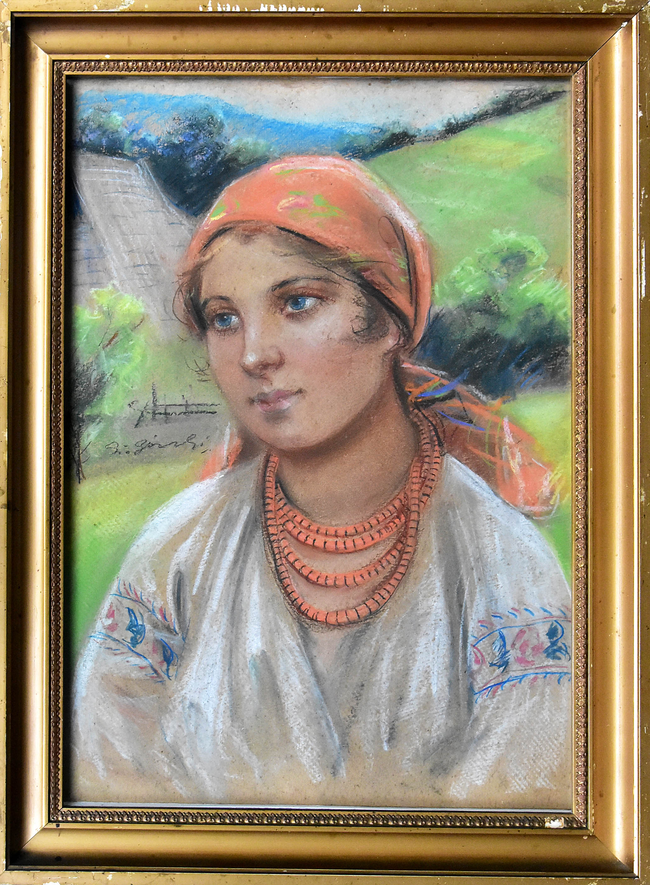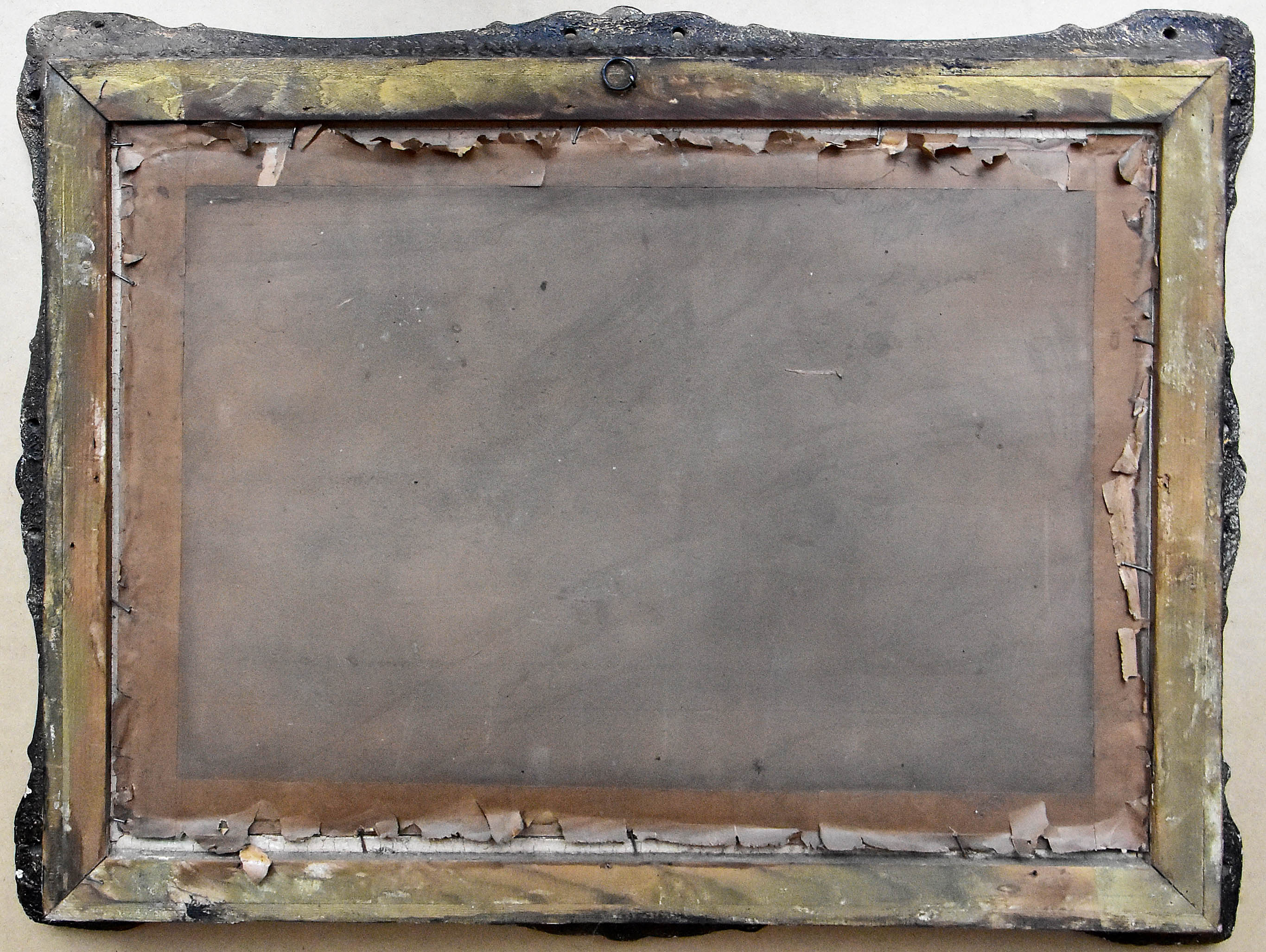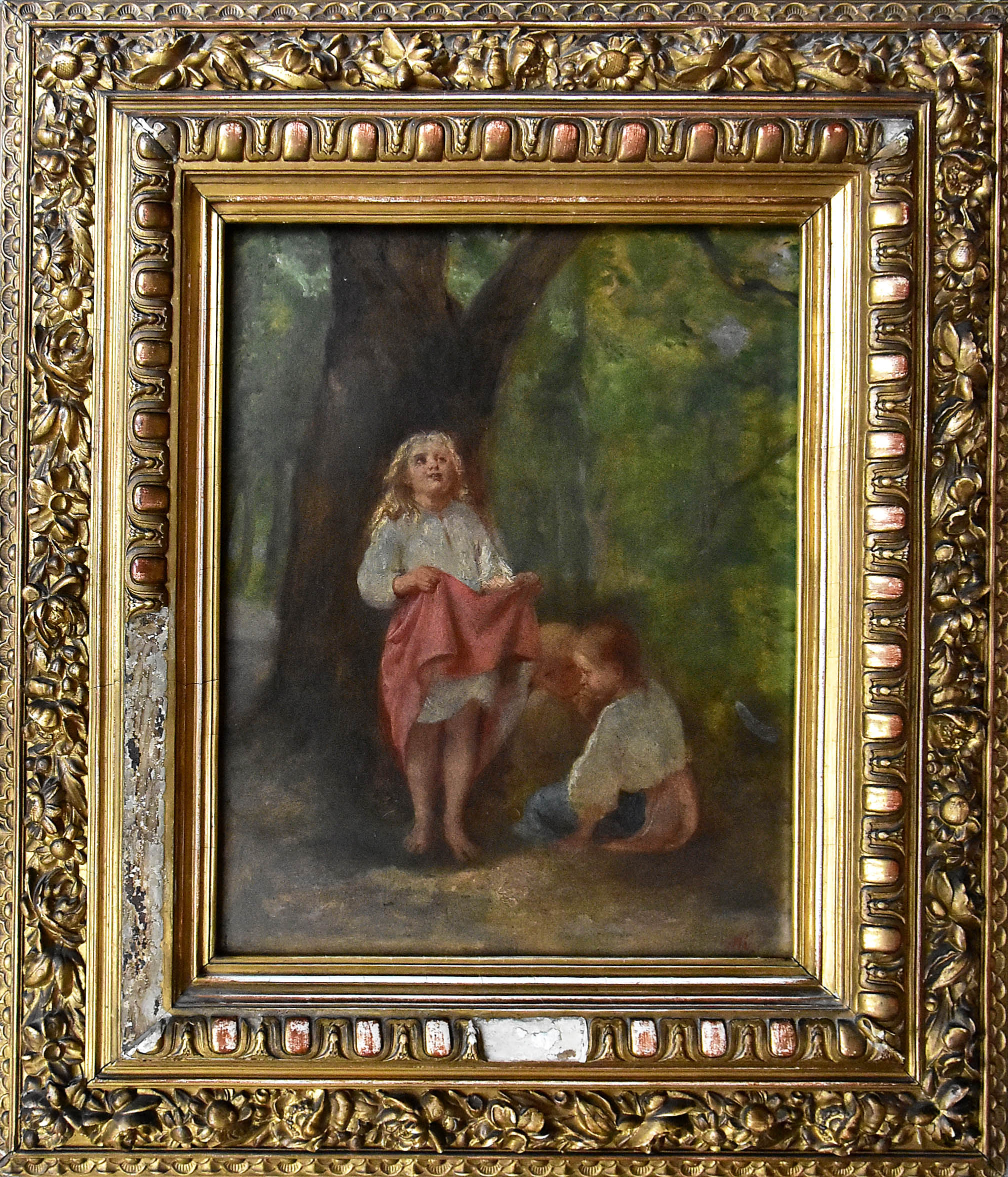 Stan zachowania: obraz zabrudzony, ubytki malatury, rama drewniana przemalowana, gipsatura uszkodzona.