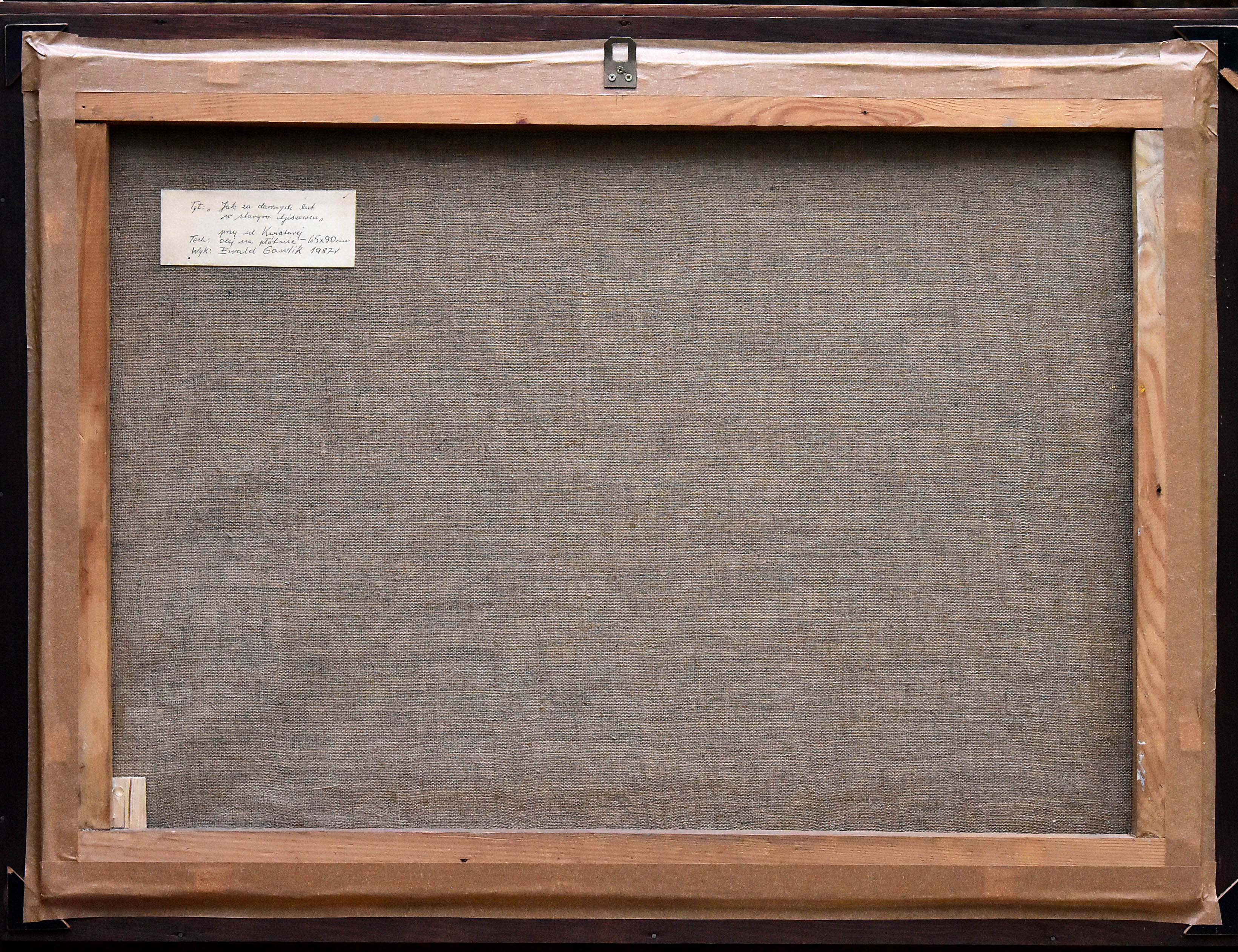 Na odwrocie autorska nalepka z tekstem długopisem: Tyt: "Jak za dawnych lat / w starym Giszowcu" / przy ulicy Kwiatowej / Tech: olej na płótnie - 65 x 90 cm/ Wyk: Ewald...