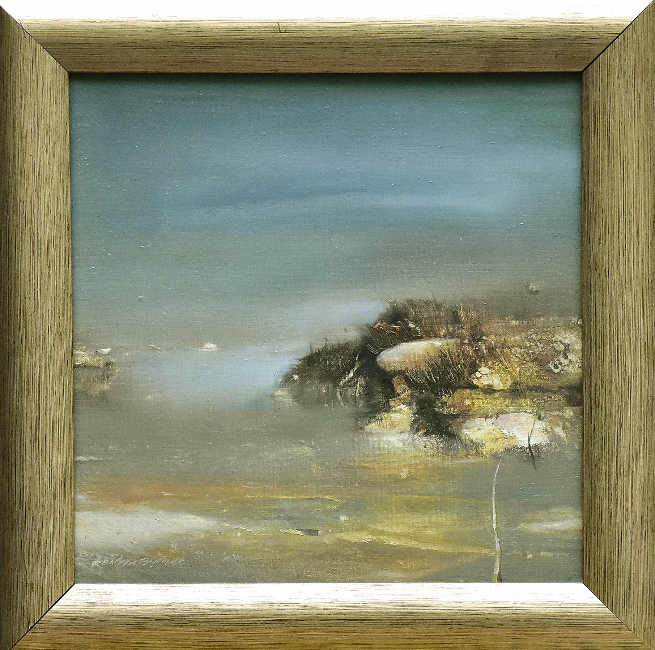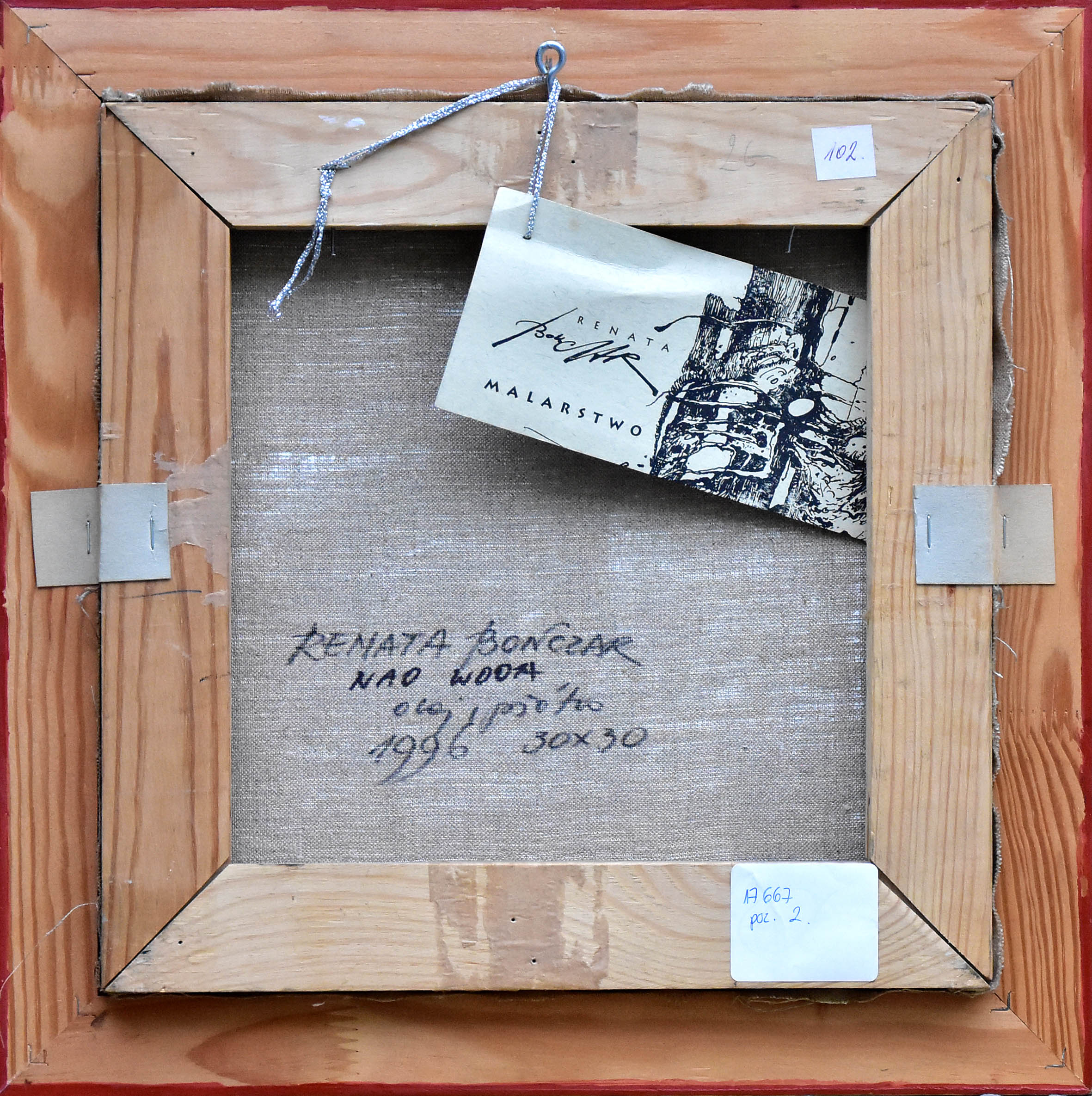 Na odwrocie autorski opis: Renata Bonczar / Nad wodą / olej, płótno / 1996 30 x 30, oraz drukowana na kartonie wizytówka artystki.