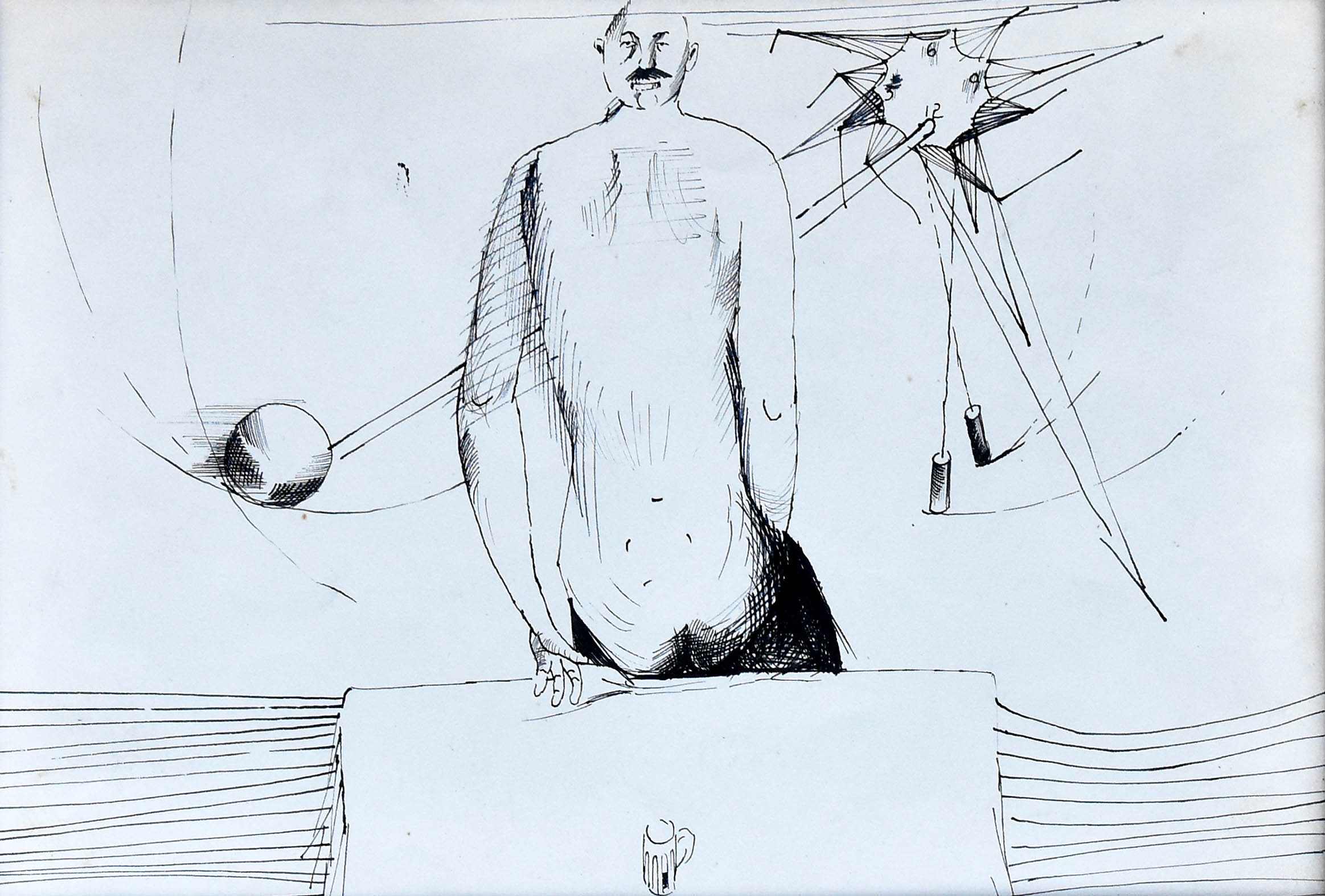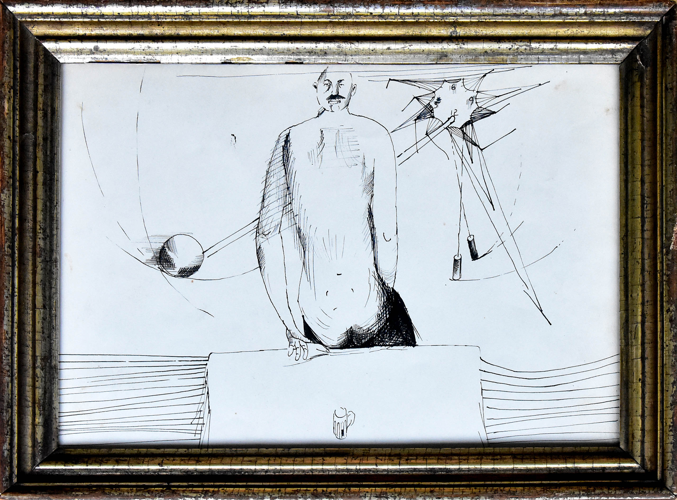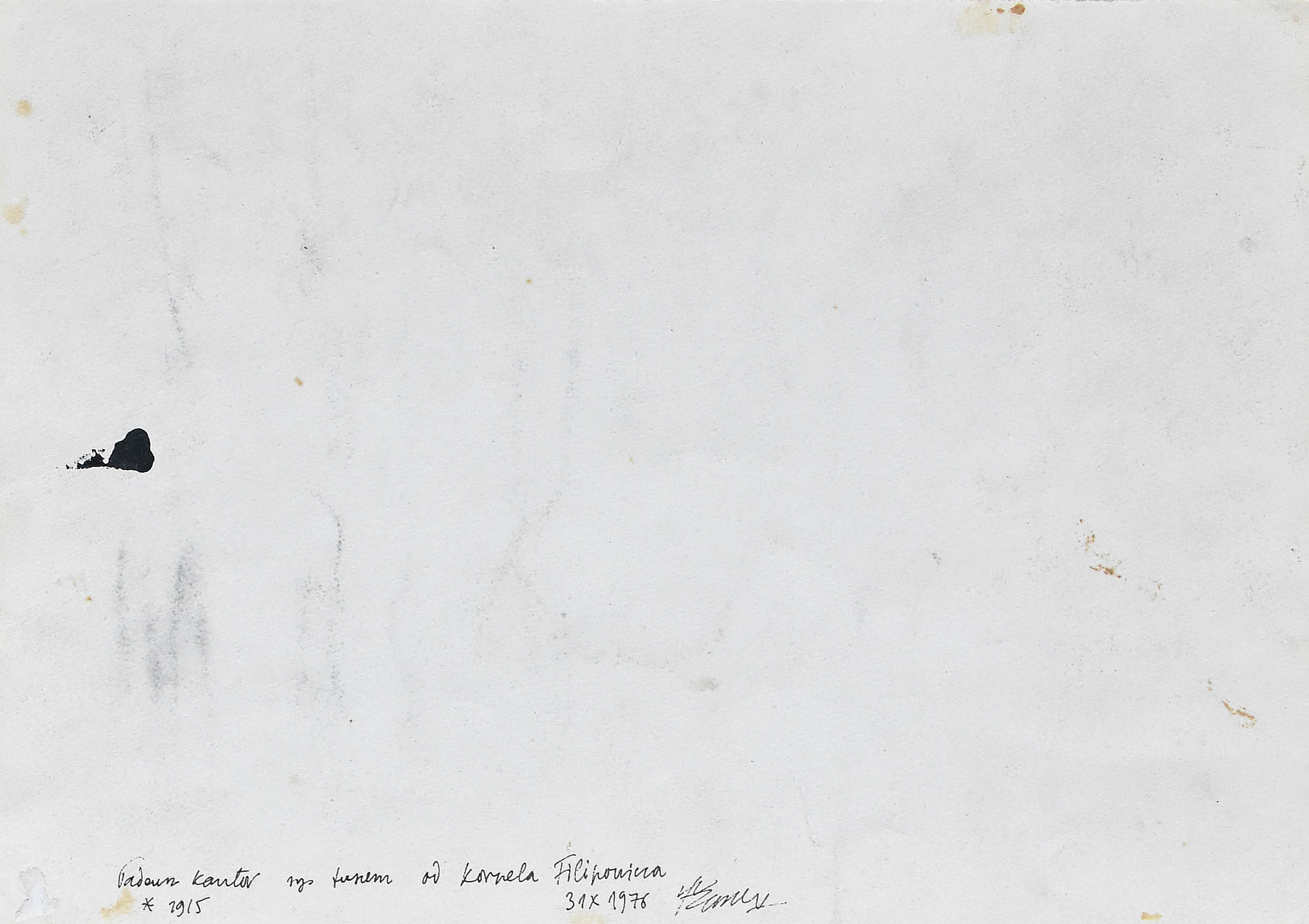 Na odwrocie napis tuszem: Tadeusz Kantor rys tuszem od Kornela Filipowicza / *1915 31 X 1976 podpis profesora Witolda Korskiego (architekta i medaliera, przyjaciela ojca obecnych...