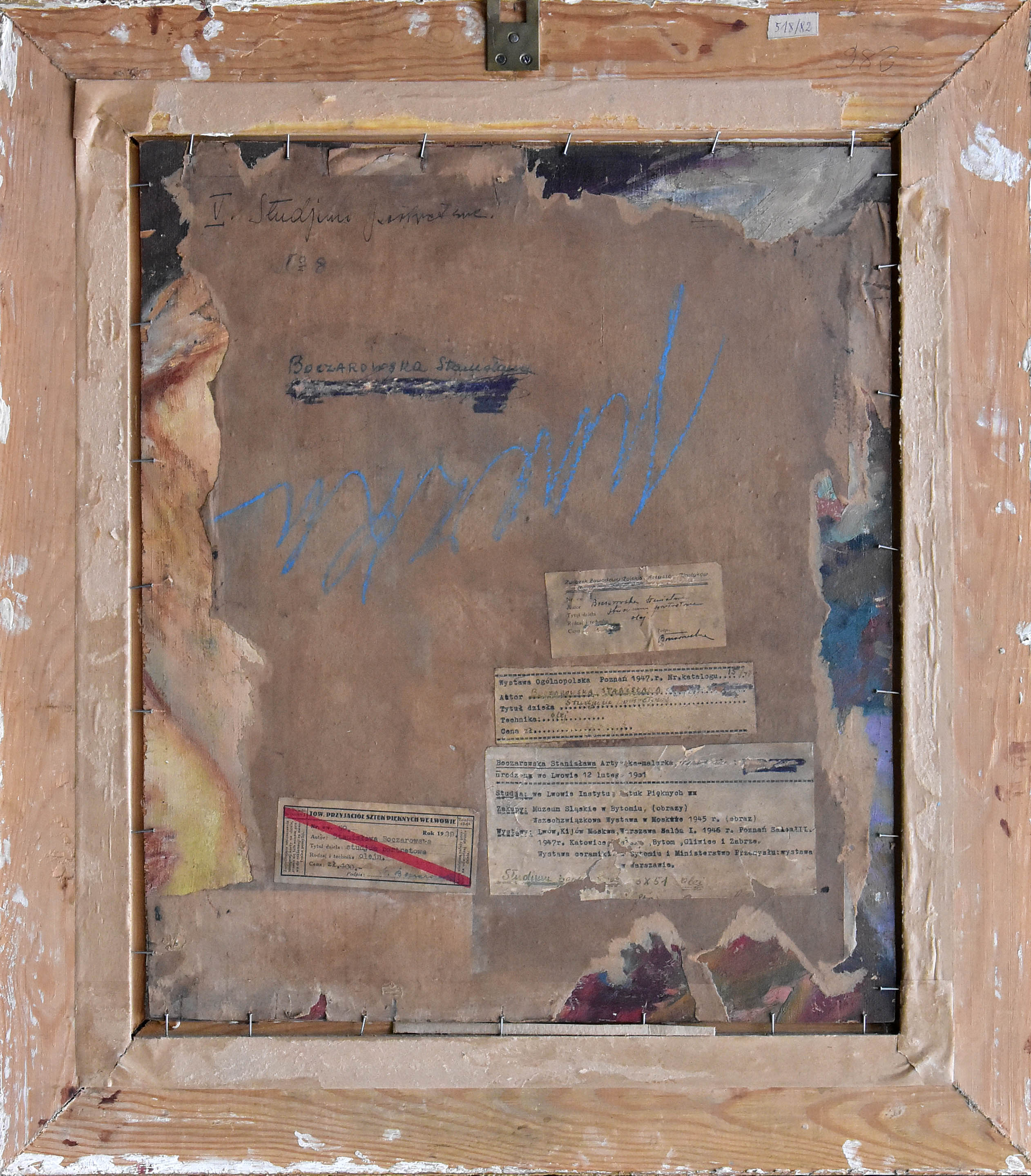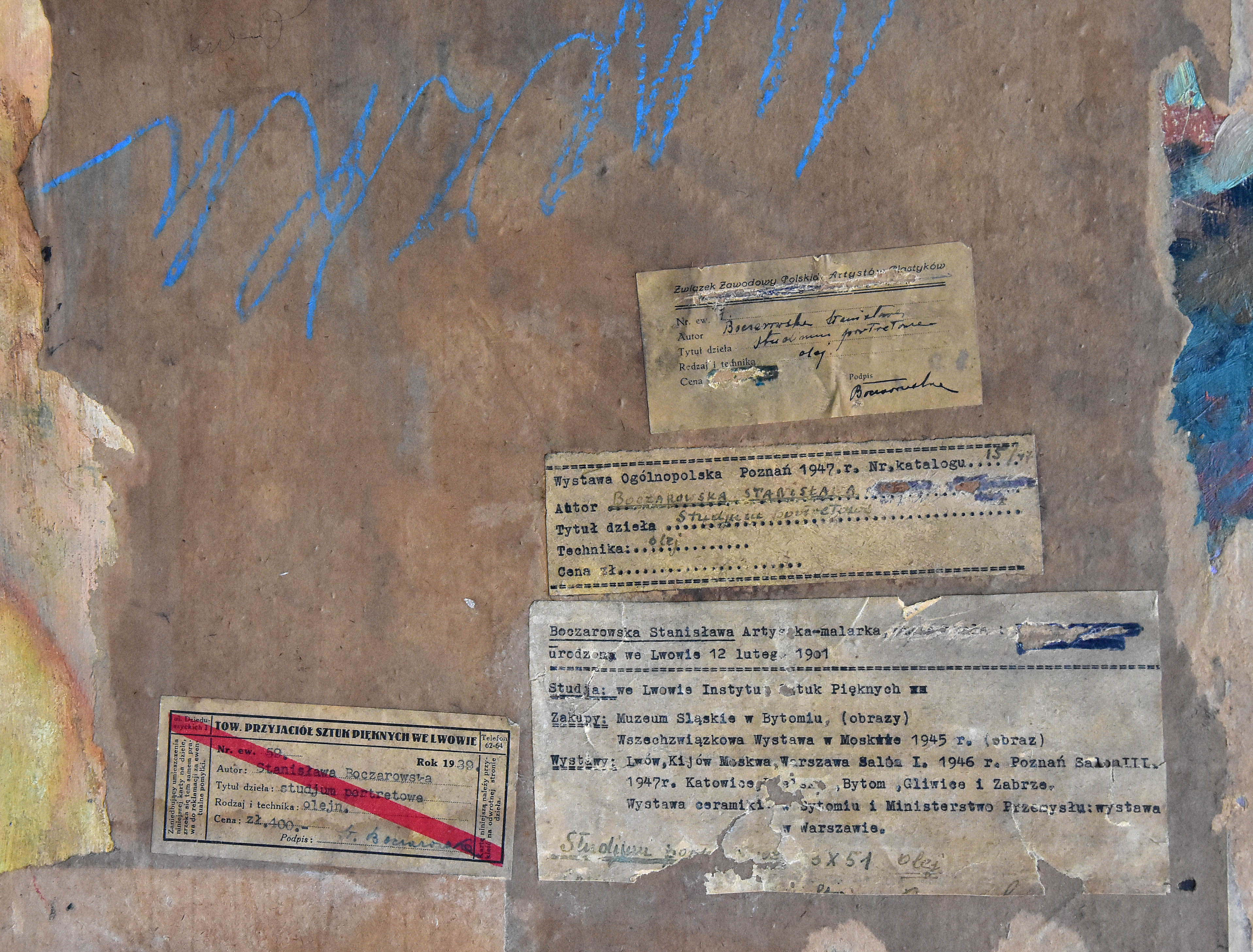 Na odwrocie opis autorski: V. Studjum portretowe / No 8 / Boczarowska Stanisława; oraz 4 nalepki: TPSP we Lwowie z 1939, Związek Zawodowy Polskich Artystów...