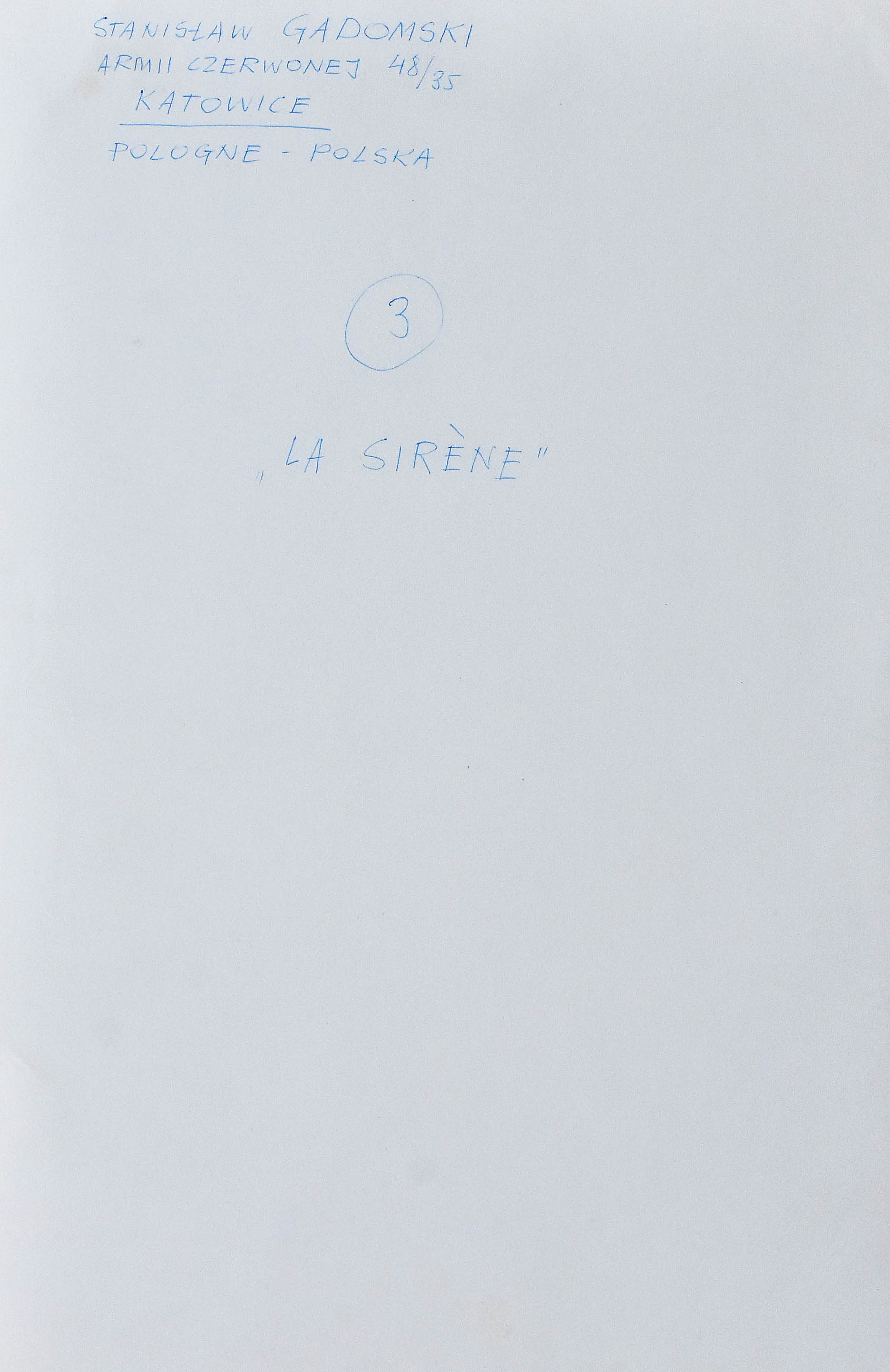 Na odwrocie autorski opis długopisem: Stanisław Gadomski / Armii Czerwonej 48/35 / Katowice / Pologne - Polska / 3 / "La Sirène".