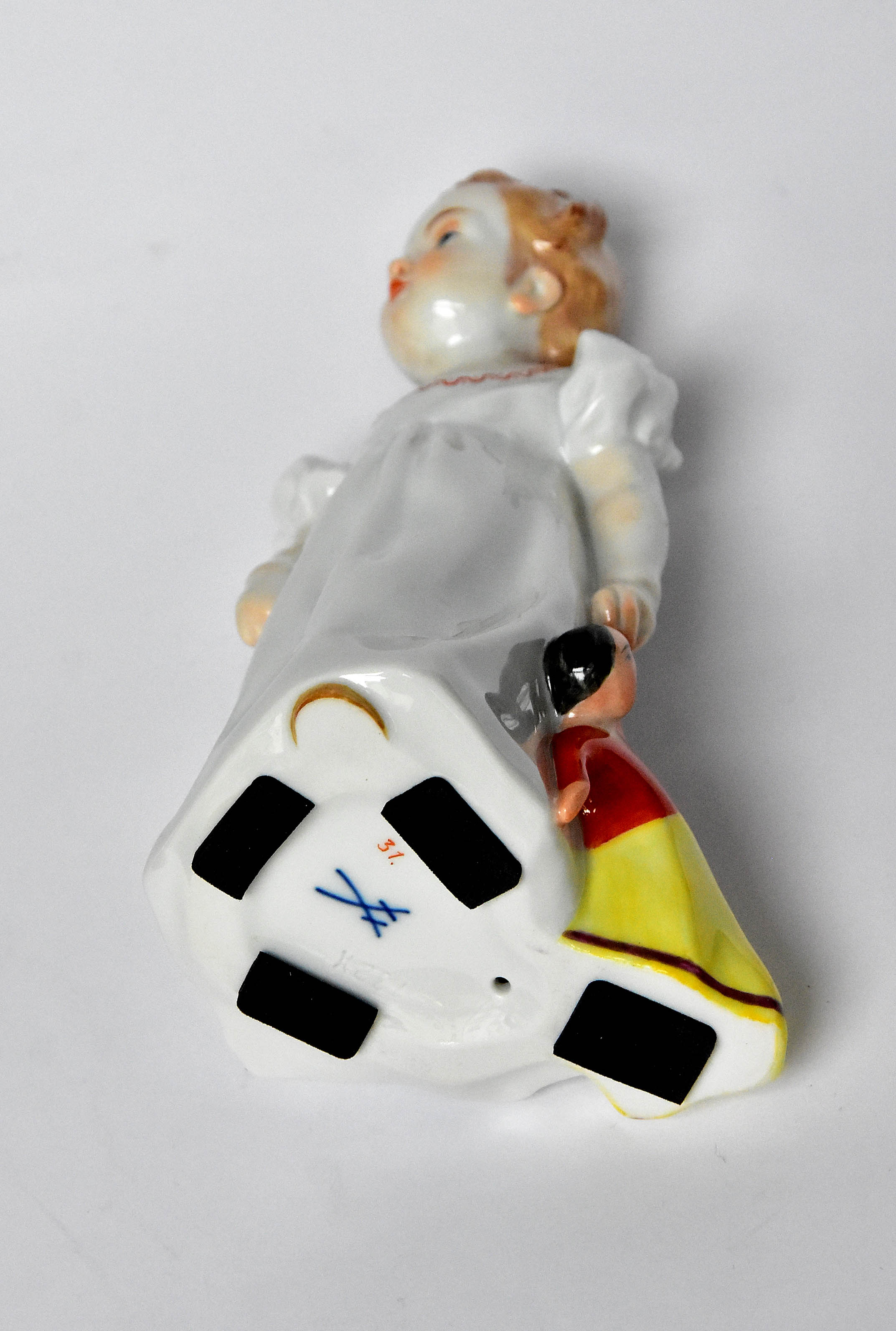 porcelana, farby naszkliwne, wym. 17 cm, autor modelu Julius Konrad Hentschel (1872 - 1907); znak podszkliwny niebieski fabryki w Miśni po 1930 roku, wyciskane nr 132, 73375 i malowane cyfry 31.
