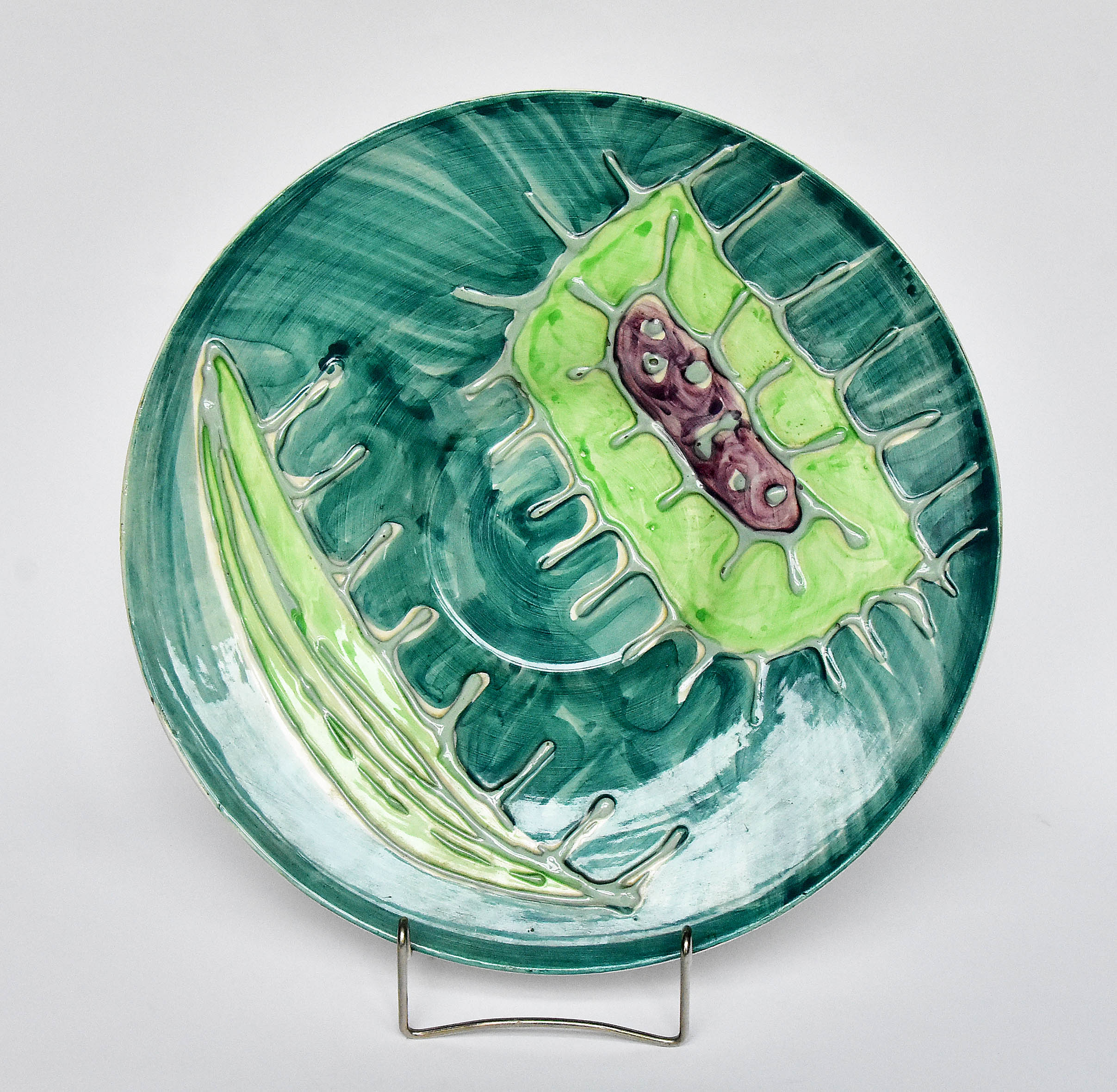 fajans, farby podszkliwne, technika "kory", wym.: 5 x 29,5 cm, projekt formy: Jan Sowiński (1911-1990), wzór nr 287; znak podszkliwny zielony Zakładu Fajansu "Włocławek" we Włocławku z lat 1956-1962, stempel: Made / in Poland,...