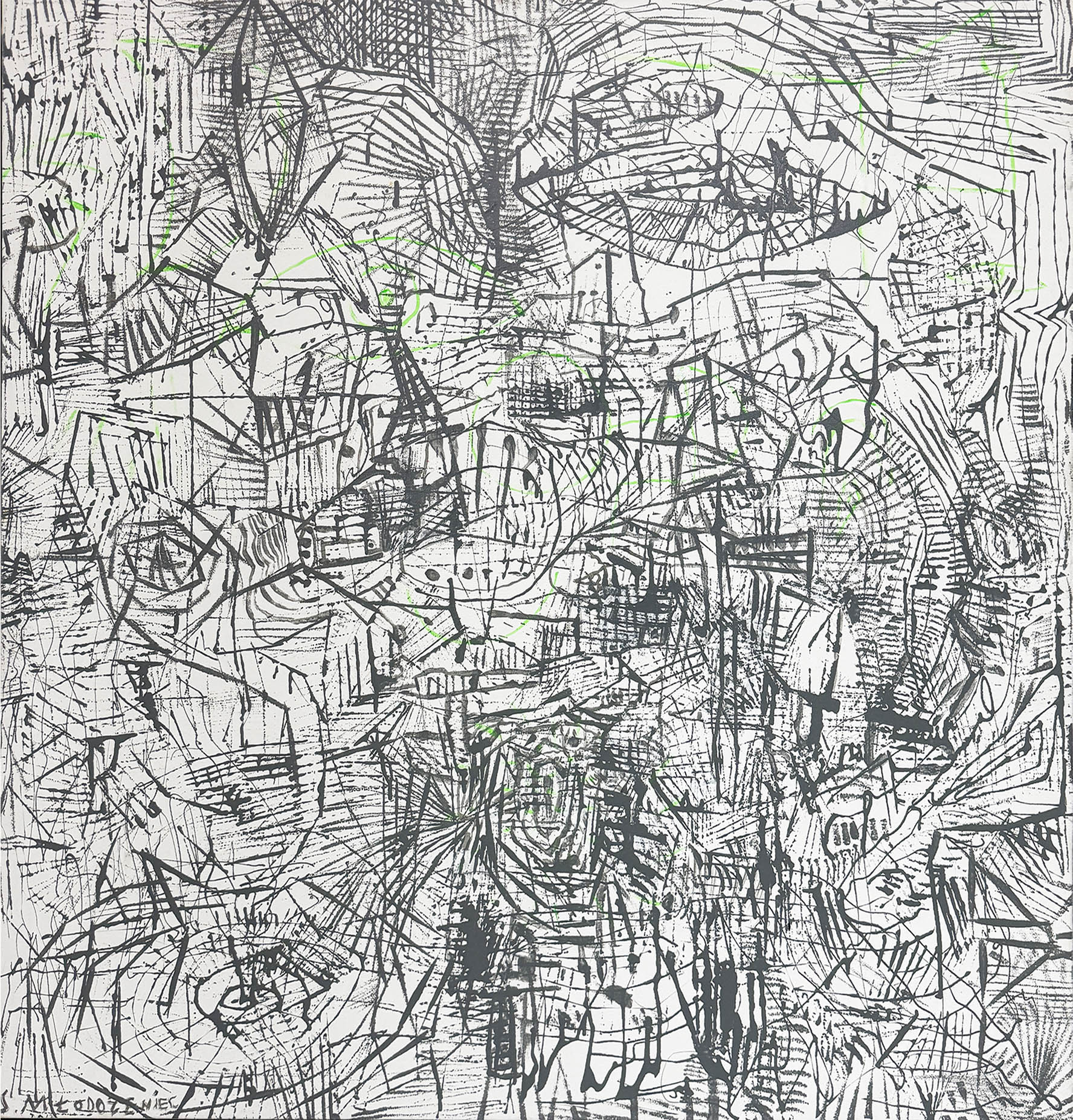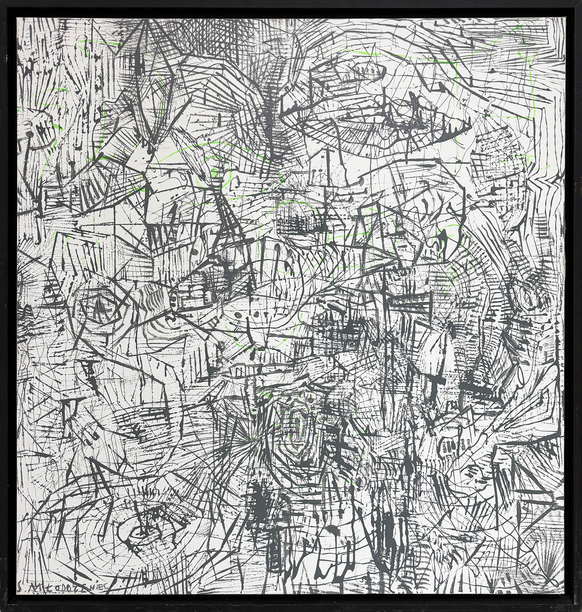 olej na płótnie, 121 cm x 127 cm; sygnowany z przodu, u dołu po lewej: S. Młodożeniec; sygnowany, datowany i opisany na odwrocie: S. MŁODOŻENIEC/''SZARY PEJZAŻ''/2012/olej/płótno/ 127 x 121 cm