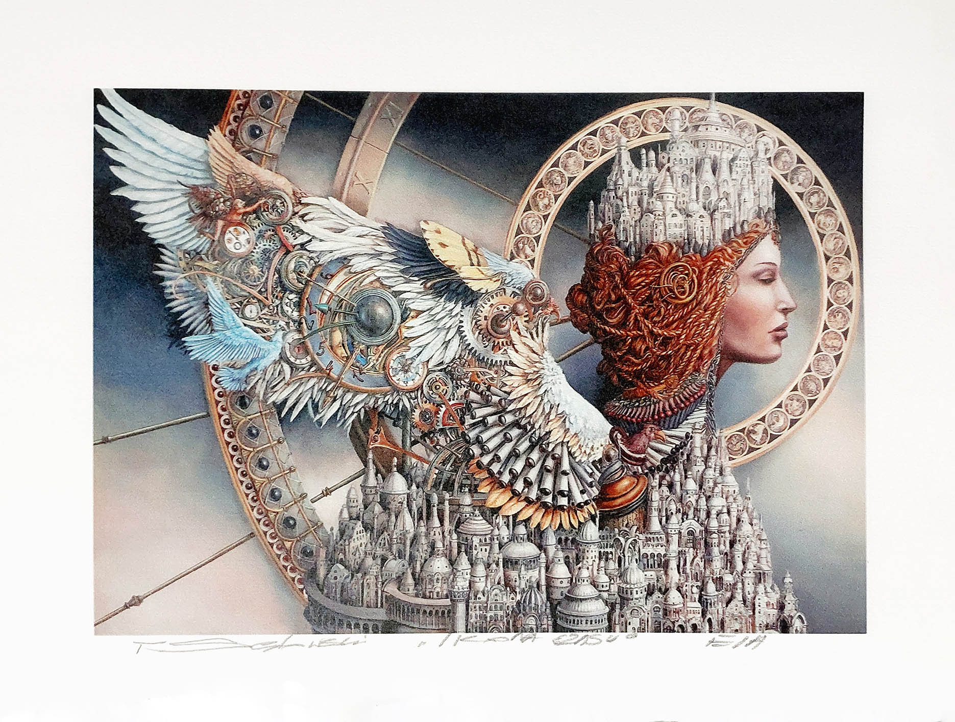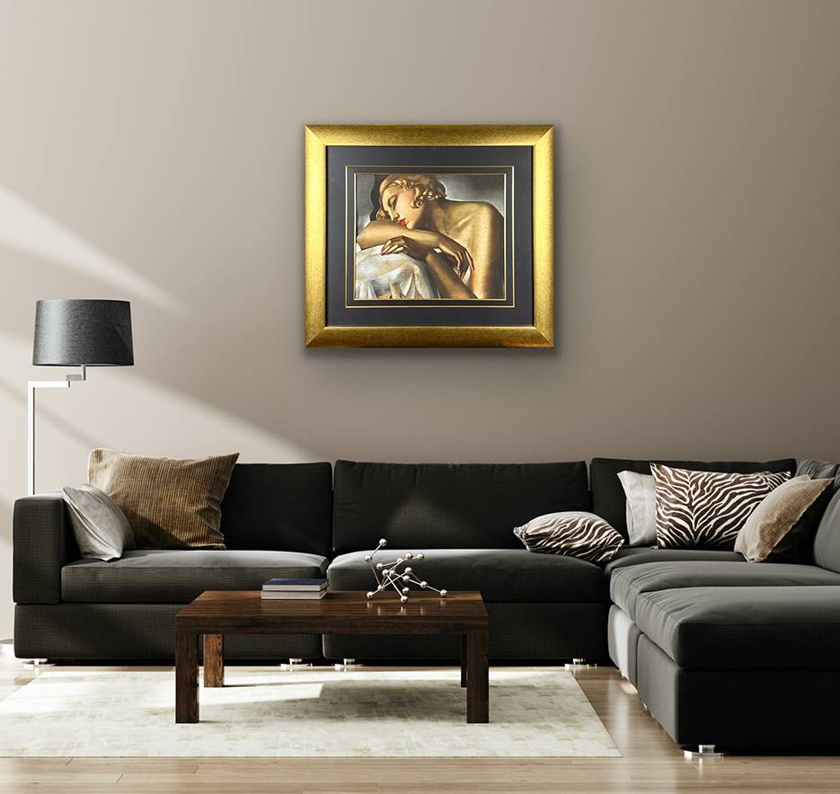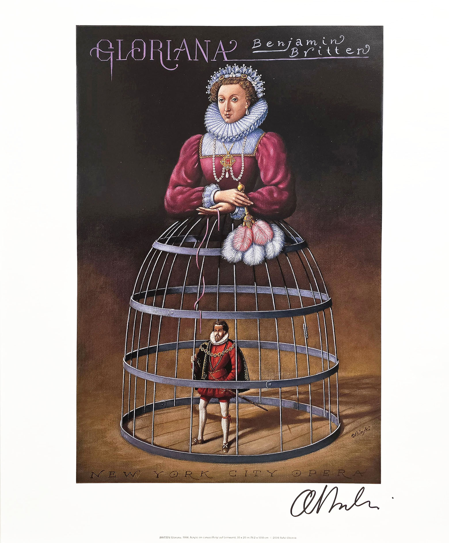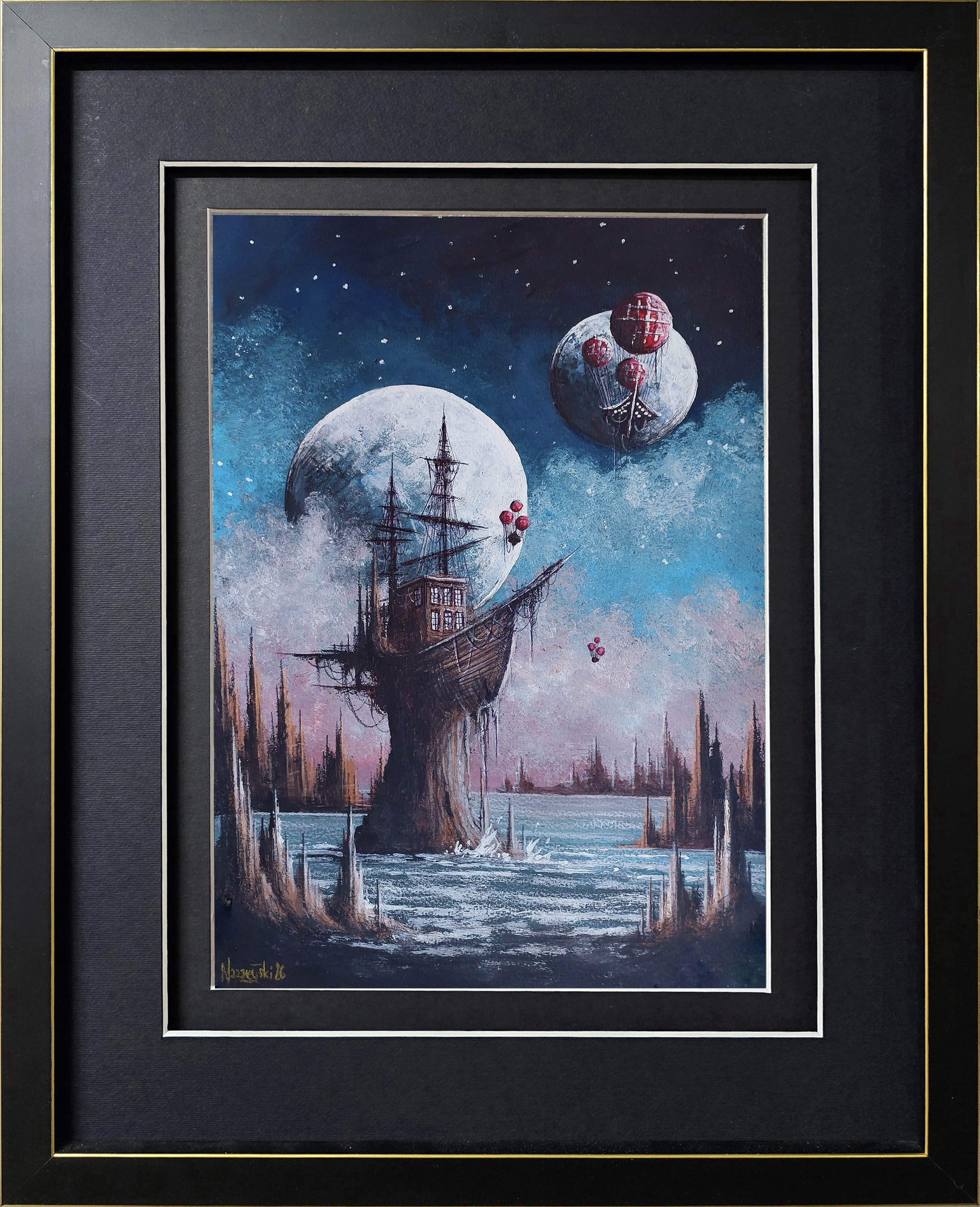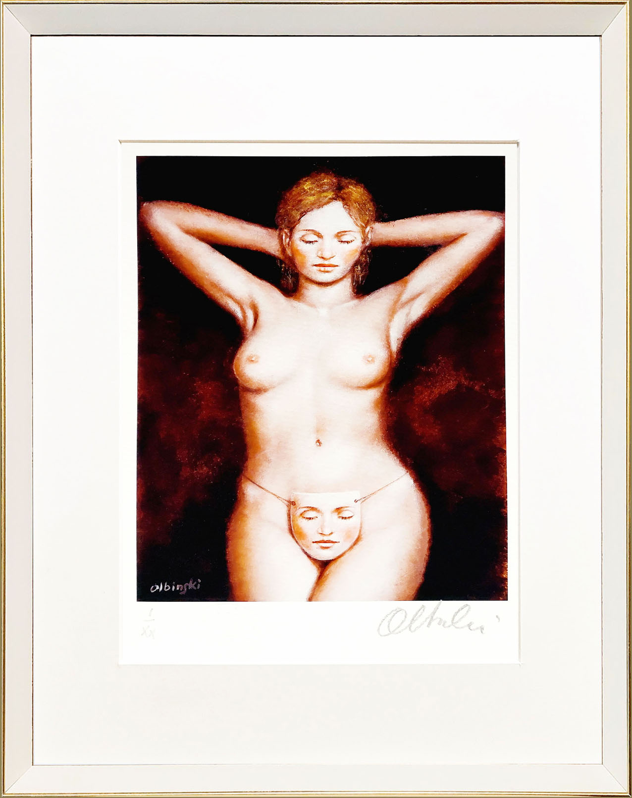 giclee, papier welinowy Arches, 74 x 83 cm, oprawiona w ramę oraz w podwójne passe – partout z dwoma złotymi sliperami