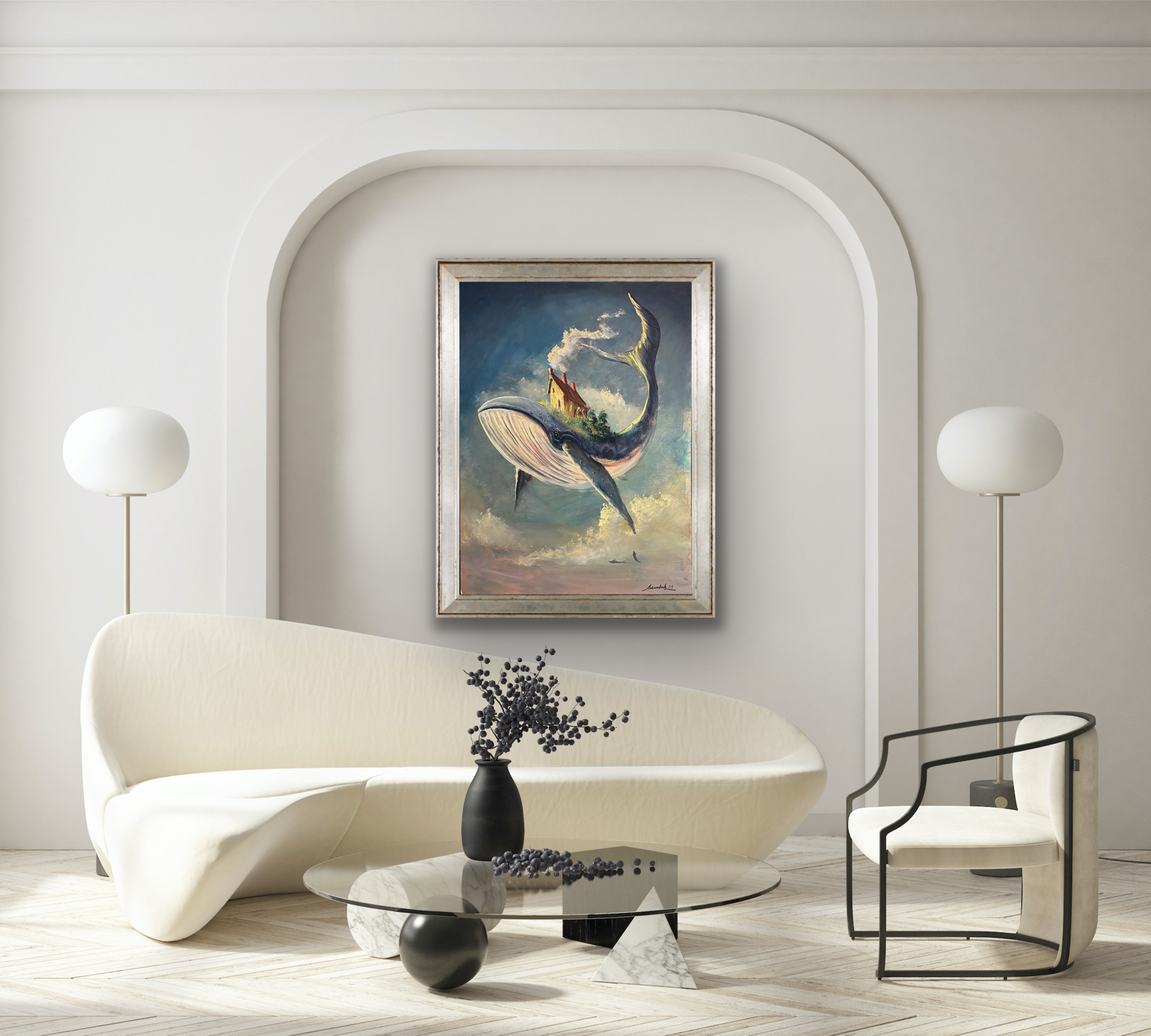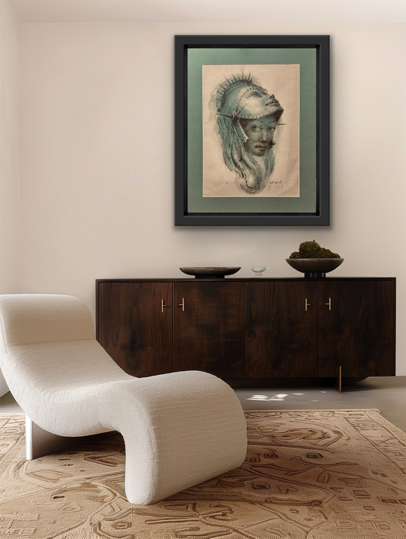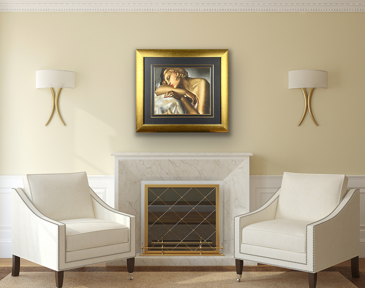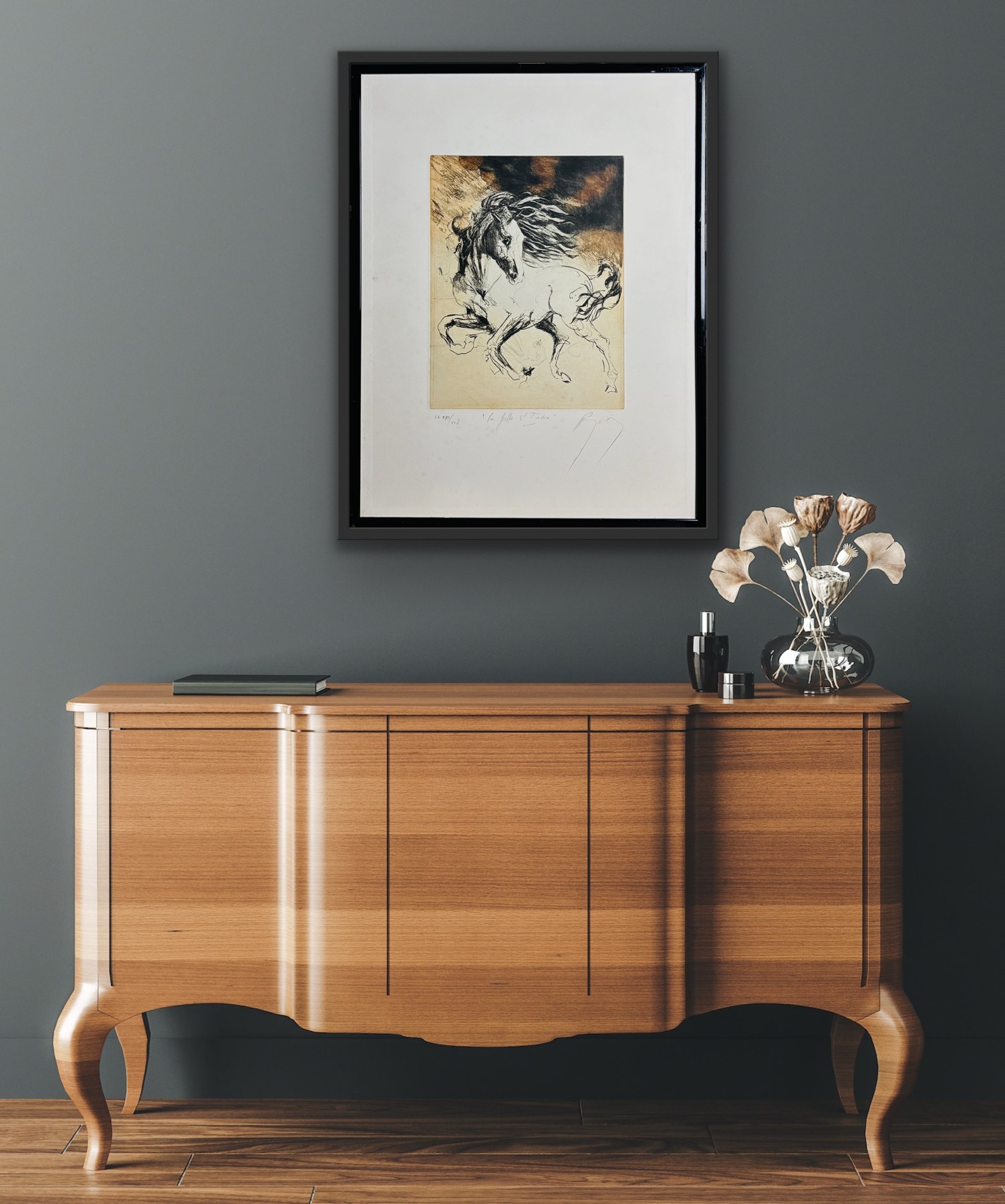 giclee, papier welinowy Arches, 74 x 83 cm, oprawiona w ramę oraz w podwójne passe – partout z dwoma złotymi sliperami