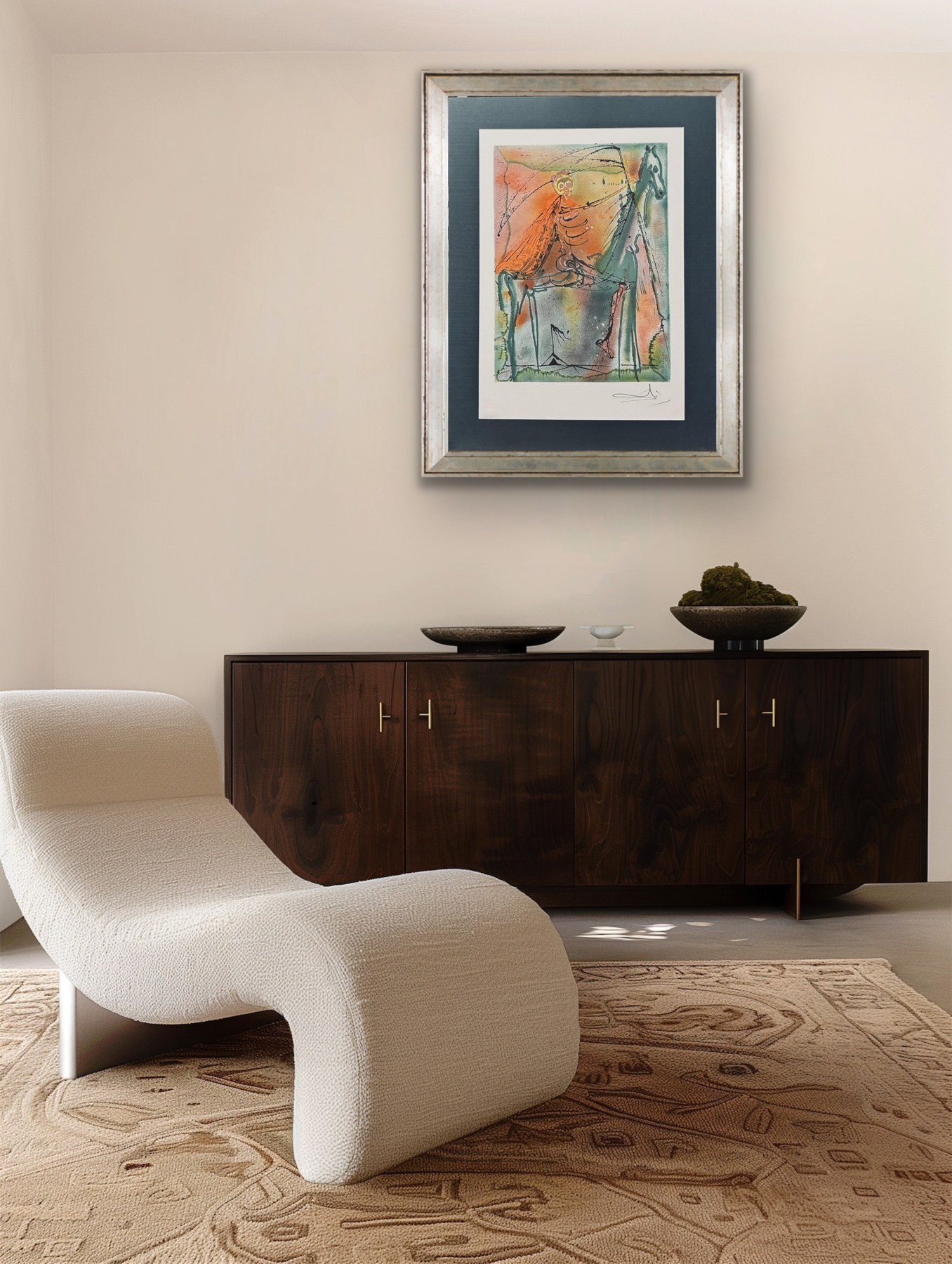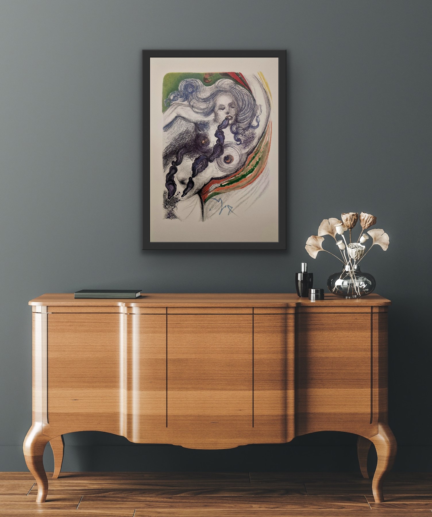 Akwaforta barwna, papier Magnani di Pescia 47 x 32 cm; sygn. na płycie l.g. „Dali”; arkusz posiada oryginalną bibułę ochronną z napisem „TAVOLA V” (tablica V); każda tablica cyklu jest przypisana do konkretnego rozdziału...