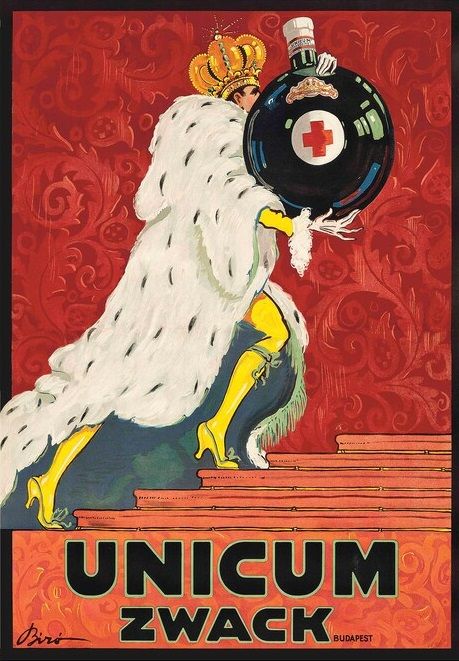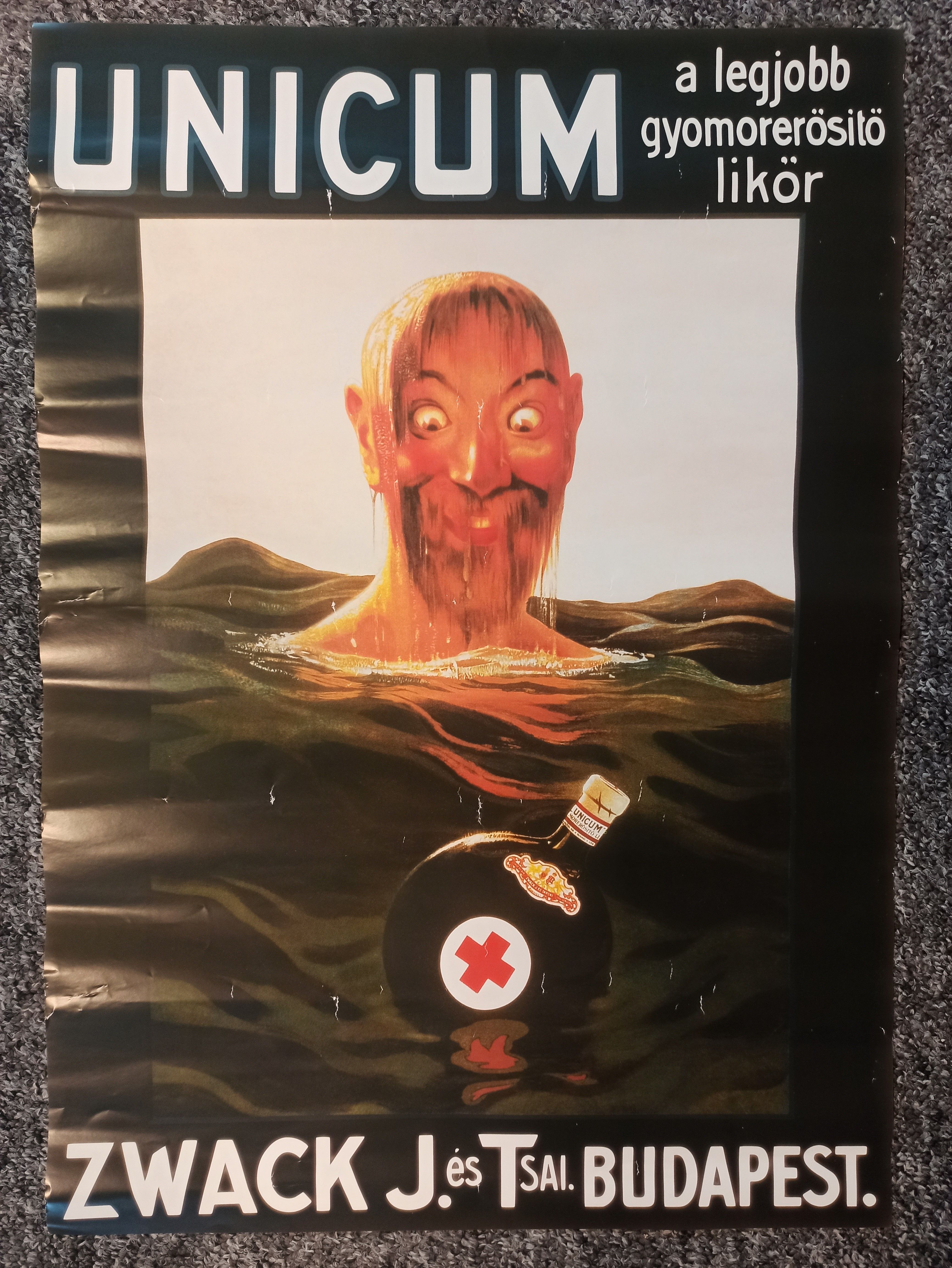 Plakaty reklamowe Zwack Unicum Vintage; Na licytację przeznaczamy jedne z najbardziej znanych plakatów Zwacka. Pierwszy plakat przedstawia rozbitka wyłaniającego się z fal, z radością widzącego wybawienie w postaci unoszącej...